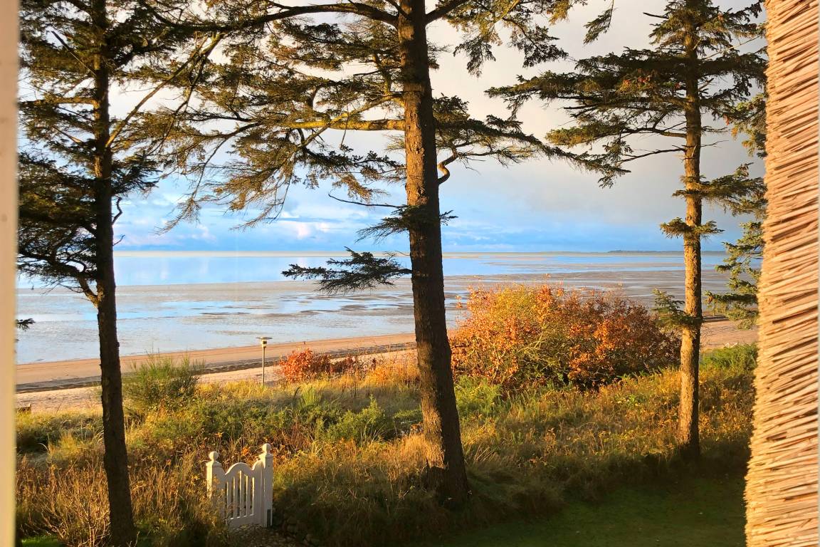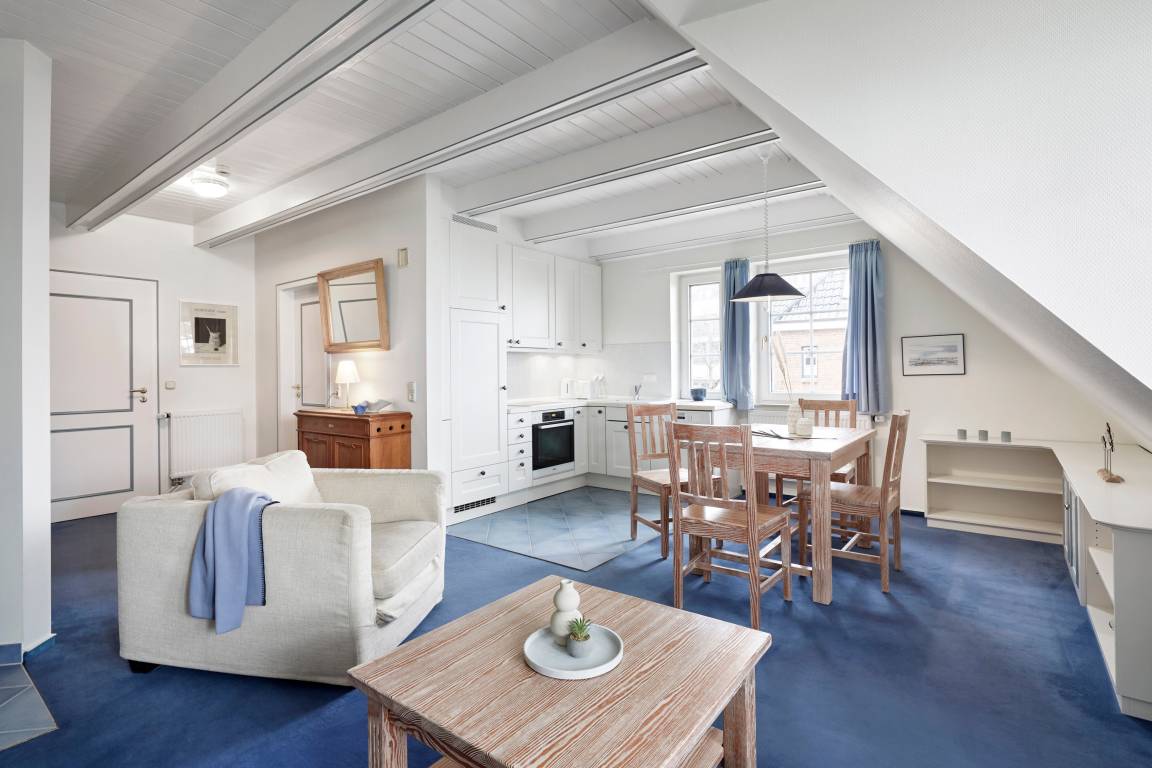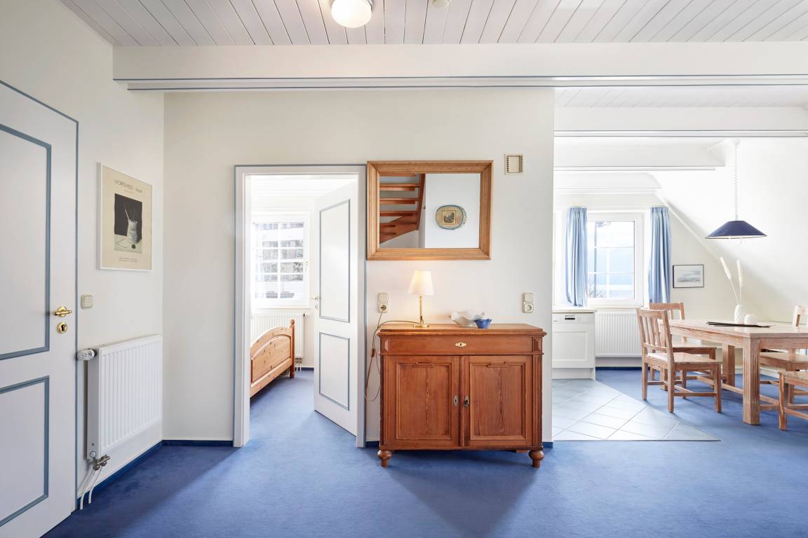 Herzlich willkommen am Südstrand in Wyk auf Föhr! Eine gemütliche kleine Ferienwohnung direkt am feinsandigen Südstrand mit Blick auf die Halligen erwartet Sie. Die Wohnung befindet sich im Obergeschoss eines 1985 errichteten reetgedeckten Friesenhauses. Die Lage am Ende einer ruhigen Spielstraße, unmittelbar am Strand und am alten Nordsee-Kurpark ist ideal für Erholungsuchende, Wassersportler, Genießer und Meerverliebte. Über die Promenade erreichen Sie zu Fuß das Zentrum Wyks in 25 Minuten. Die Wohnung ist nordisch-gemütlich mit gelaugten Kiefernmöbeln und naturweißem Sofa und Sesseln eingerichtet. Sie bietet zwei Personen großzügig Platz, um sich wohlzufühlen. Zur Wohnung gehören ein Schlafzimmer, ein Bad mit Dusche und WC sowie ein großzügiger Wohn-Essbereich. Zur Ausstattung gehören unter anderem ein moderner 43'' OLED Smart-TV (Airplay fähig). Ein Strandkorb steht Ihnen im Strandabschnitt vor dem Haus zur Verfügung. Die Nutzung des Gartens ist den Mietern der Erdgeschosswohnung vorbehalten. Ihr Auto können Sie auf dem zur Wohnung zugehörigen Parkplatz abstellen.