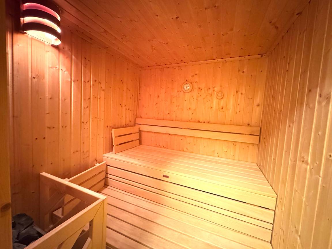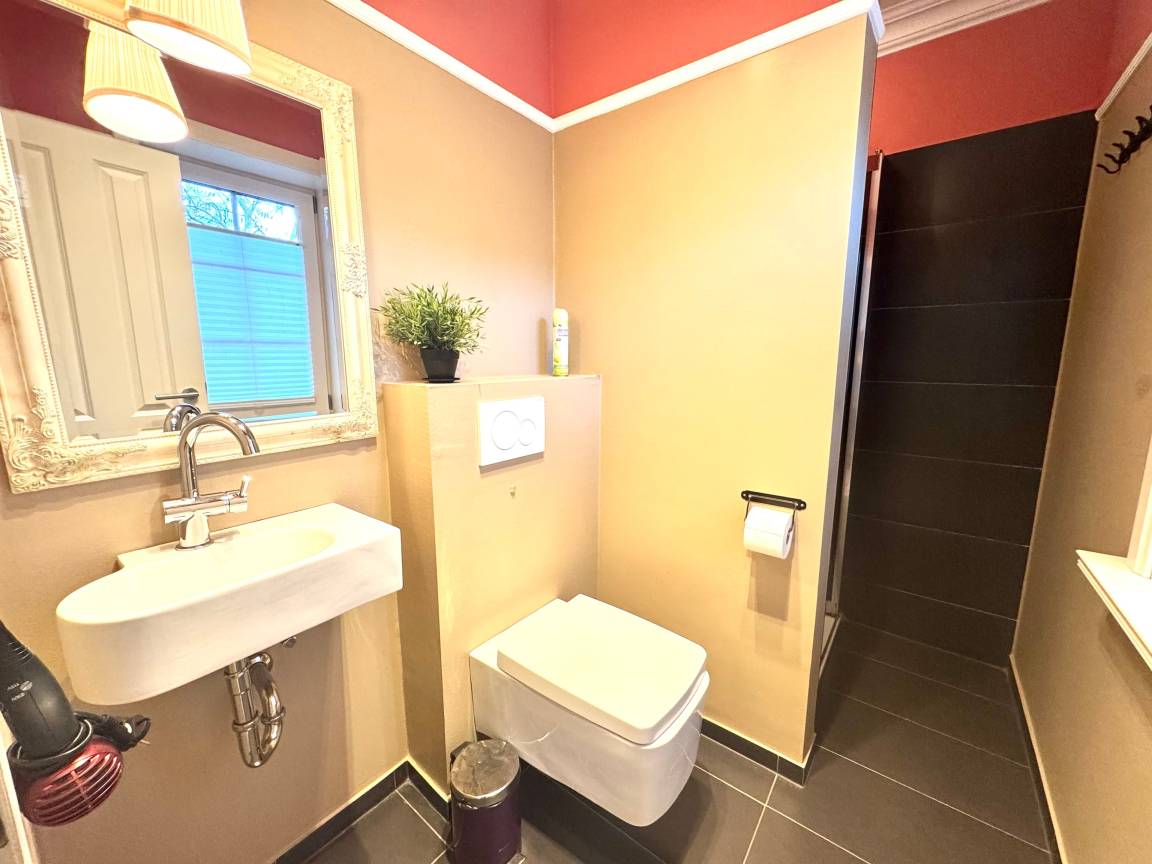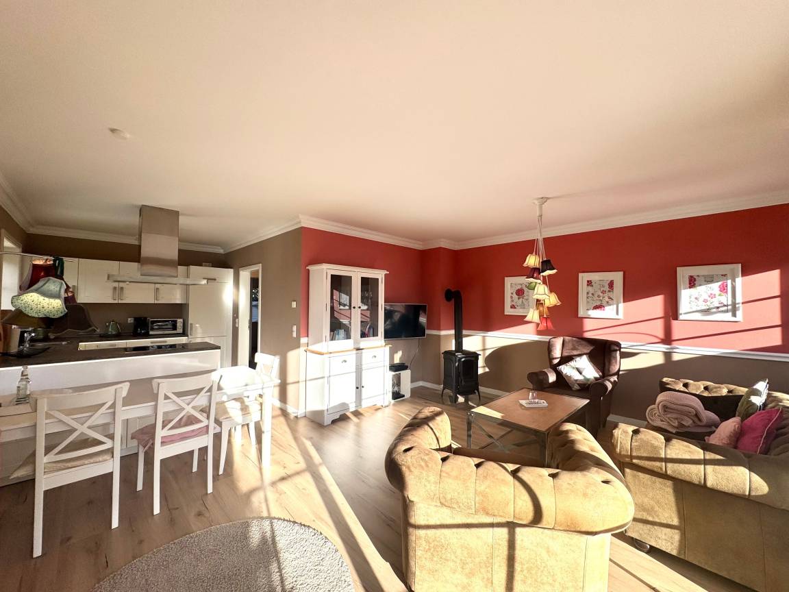 Im Erdgeschoss finden Sie das Duscbad / WC, den Wirtschaftsraum mit Waschmaschine u.Trockner zur freien Verfügung, die hauseigene Sauna und den lichtdurchfluteten Wohn-Essbereich mit Kaminofen, separater Essgruppe und offener moderner Einbauküche.