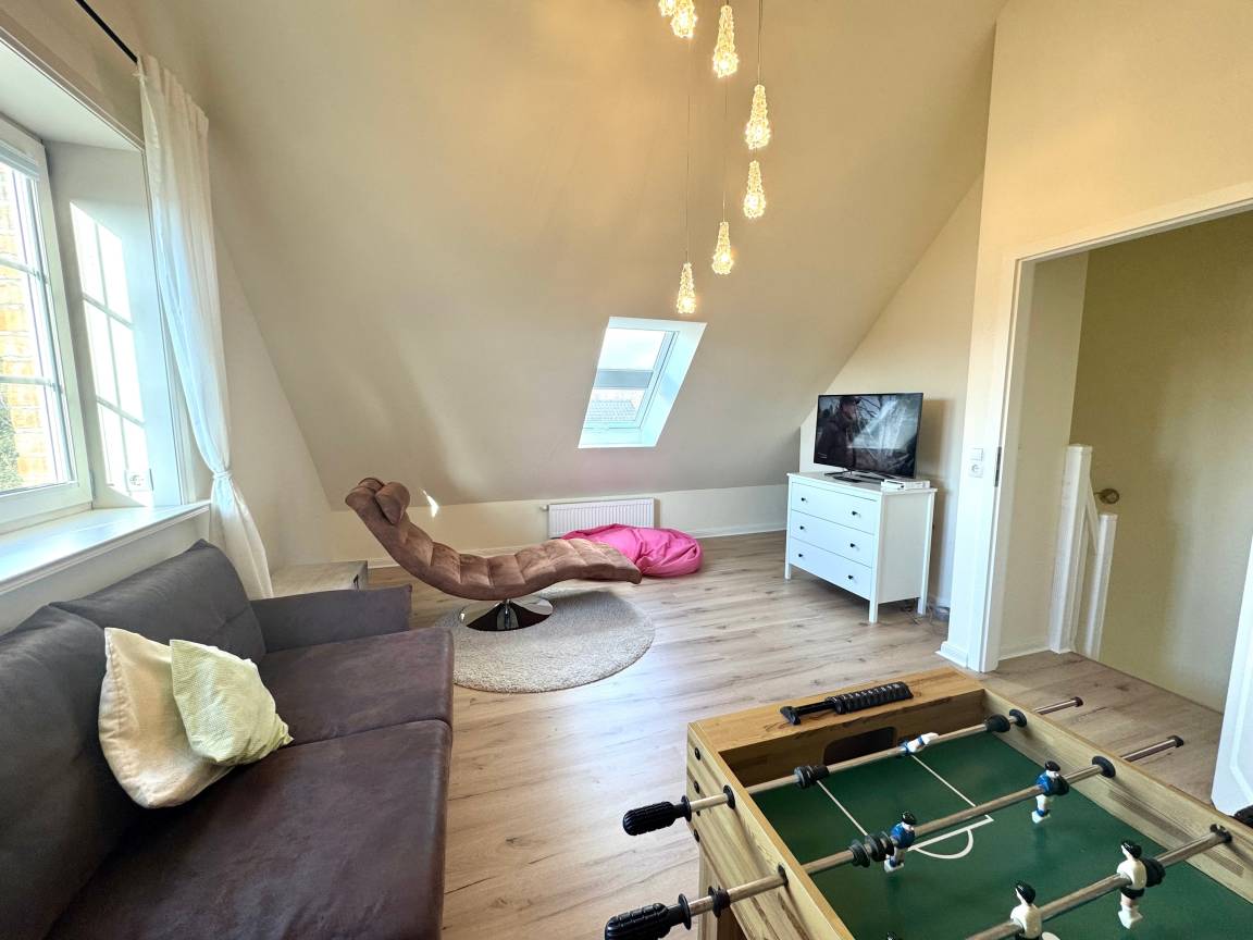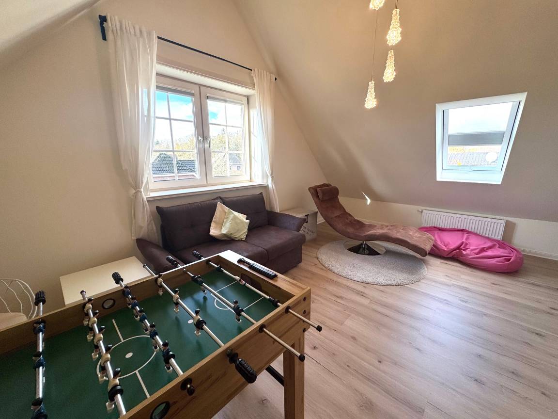 Die drei Schlafzimmer - 1x mit Doppelbett ( 180 x 200cm ), 1x mit zwei Einzelbetten, 1x mit einem Einzelbett- stehen Ihnen im Obergeschoss zur Verfügung, ebenso das Wannenbad / WC. Im Dachgeschoss befindet sich ein weiterer Aufents/Schlafraum mit Schlafcouch, 2 Sitzsäcken zusätzlichem TV, einer Wii-Spielekonsole und Tischfussball, sollte das Wetter mal nicht so passend sein.
