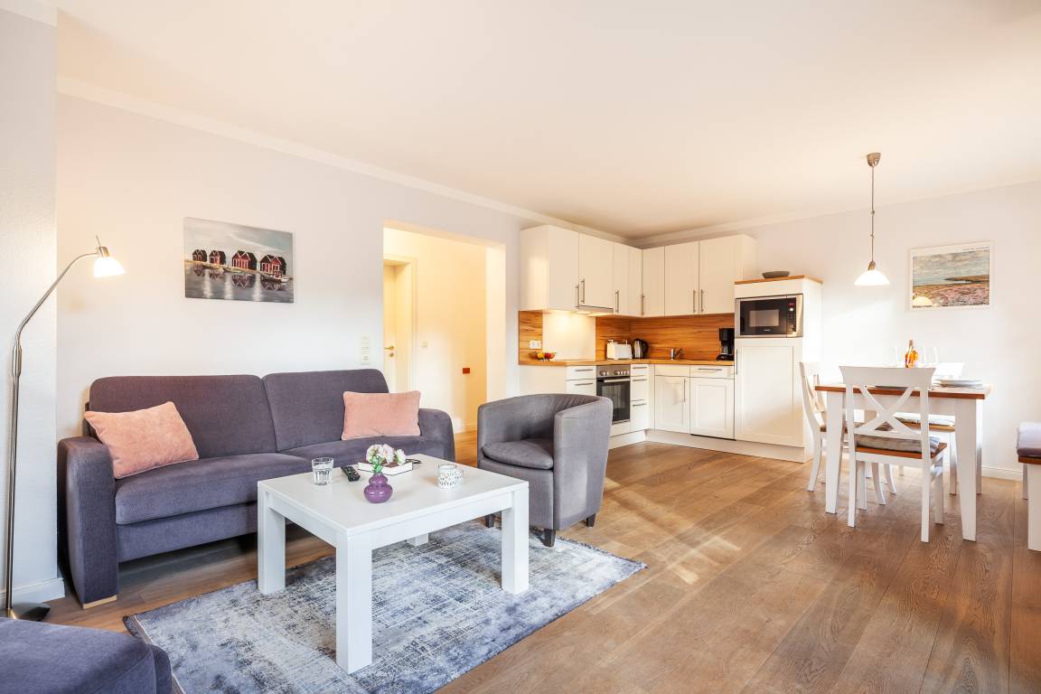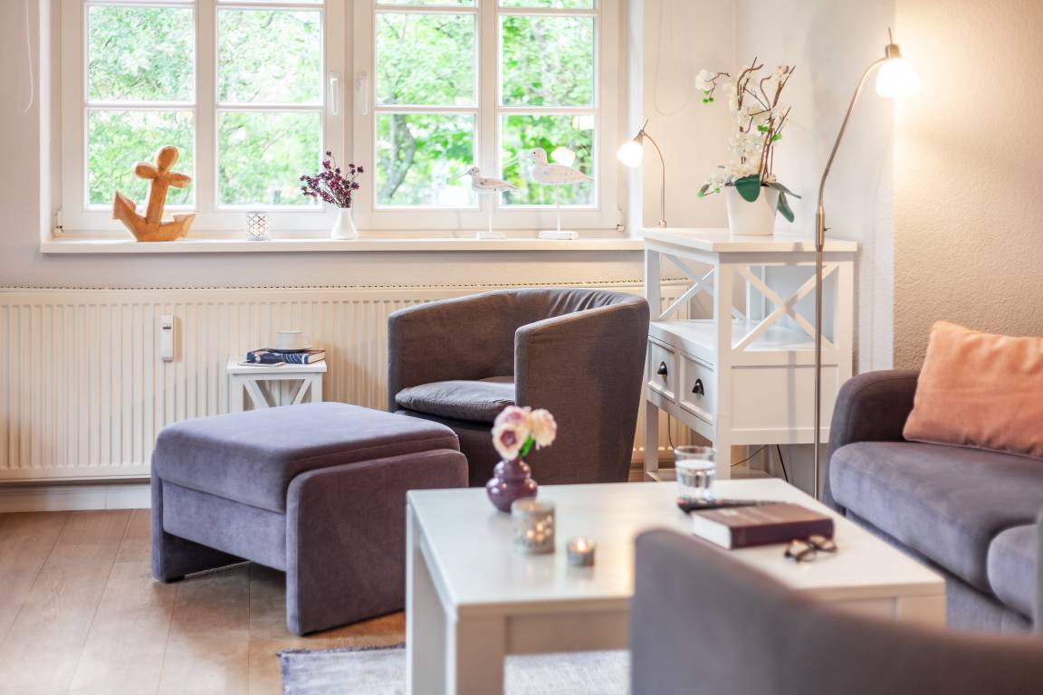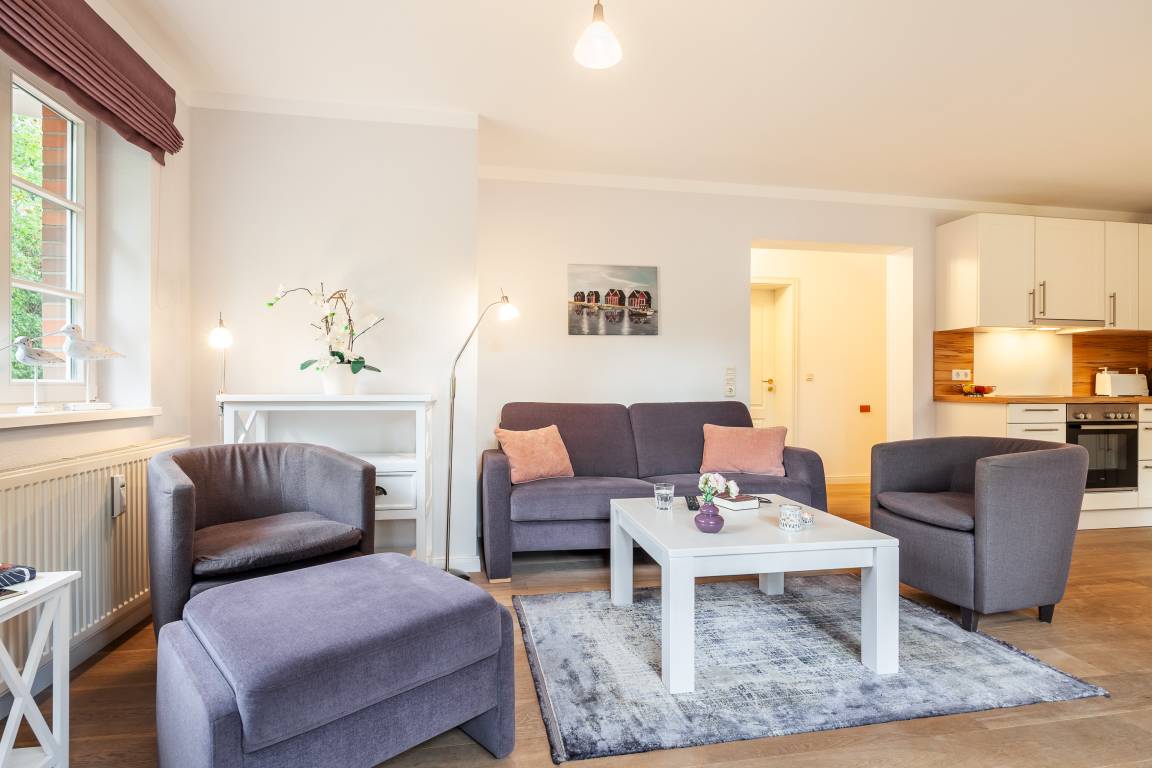 Die Erdgeschosswohnung Nr. 1 bietet Platz für zwei bis vier Personen. Ein großzügiges und helles Wohnzimmer mit bequemen Sofa, ein Essplatz sowie eine moderne Küchenecke lassen keine Wünsche offen. Vom Wohnzimmer aus geht es direkt auf die windgeschützte Südterrasse mit Mobiliar. Ein Schlafzimmer mit Doppelbett sowie ein Duschbad mit Fenster gehören ebenfalls zur Wohnung. Im Souterrain (großes Fenster) befindet sich ein kleines Zimmer mit Etagenbett.