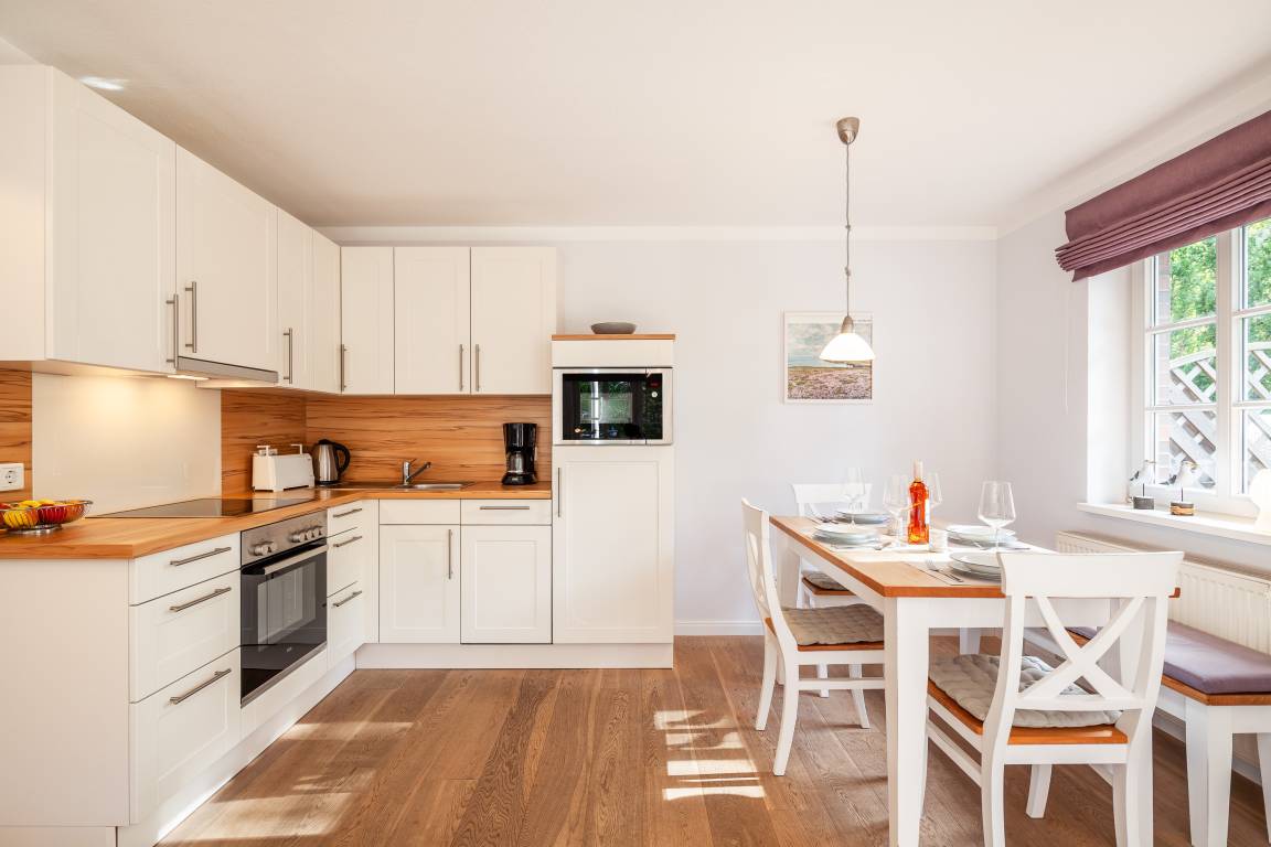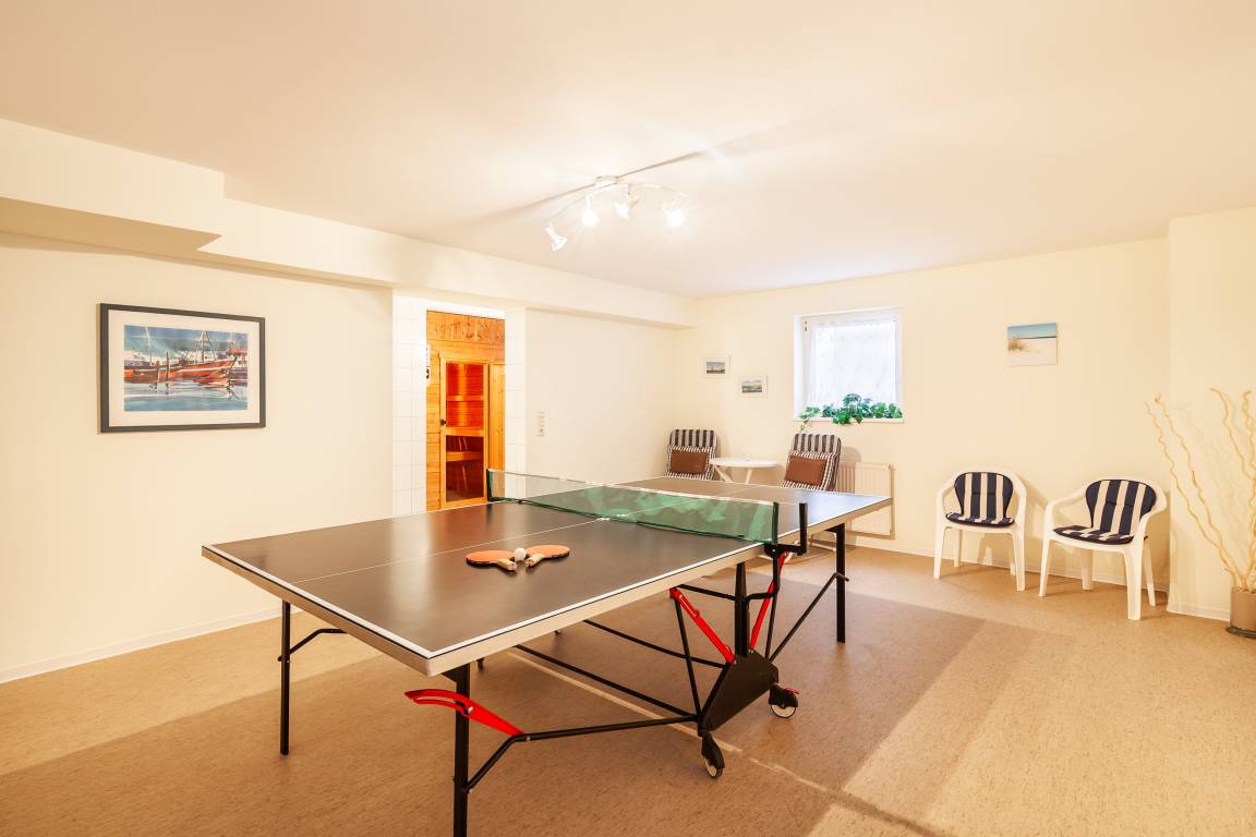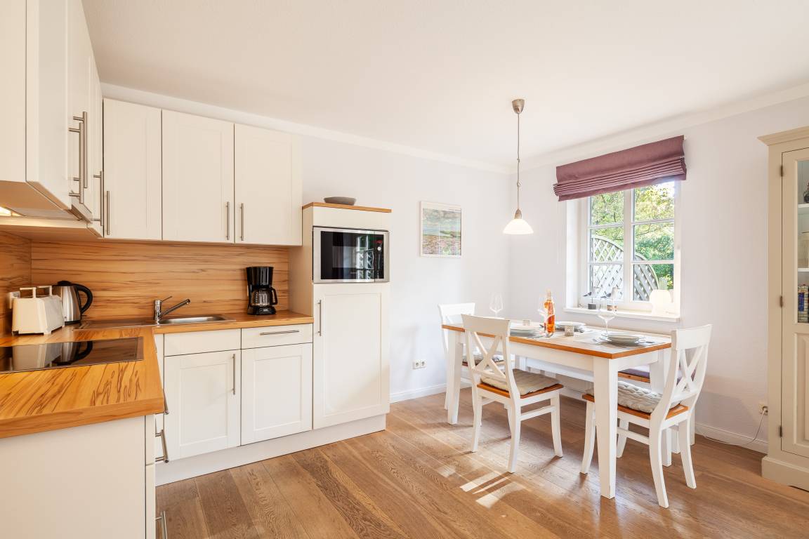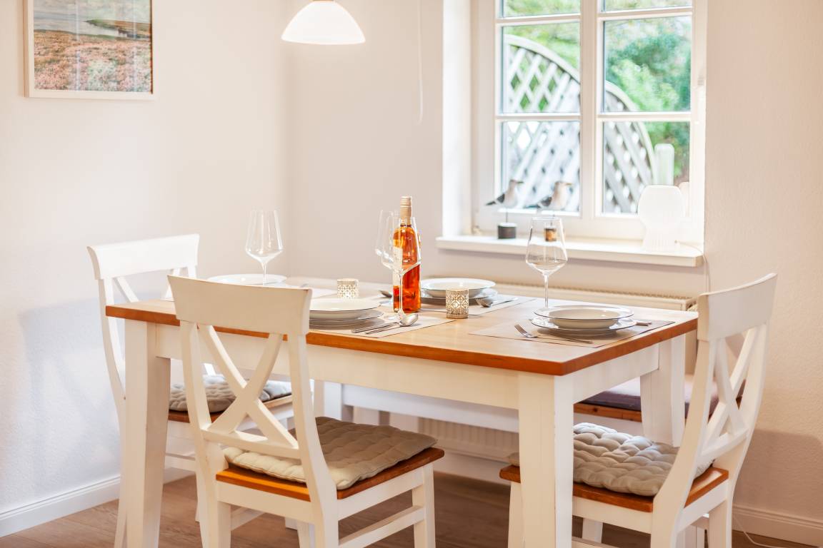 Die Erdgeschosswohnung Nr. 1 bietet Platz für zwei bis vier Personen. Ein großzügiges und helles Wohnzimmer mit bequemen Sofa, ein Essplatz sowie eine moderne Küchenecke lassen keine Wünsche offen. Vom Wohnzimmer aus geht es direkt auf die windgeschützte Südterrasse mit Mobiliar. Ein Schlafzimmer mit Doppelbett sowie ein Duschbad mit Fenster gehören ebenfalls zur Wohnung. Im Souterrain (großes Fenster) befindet sich ein kleines Zimmer mit Etagenbett.