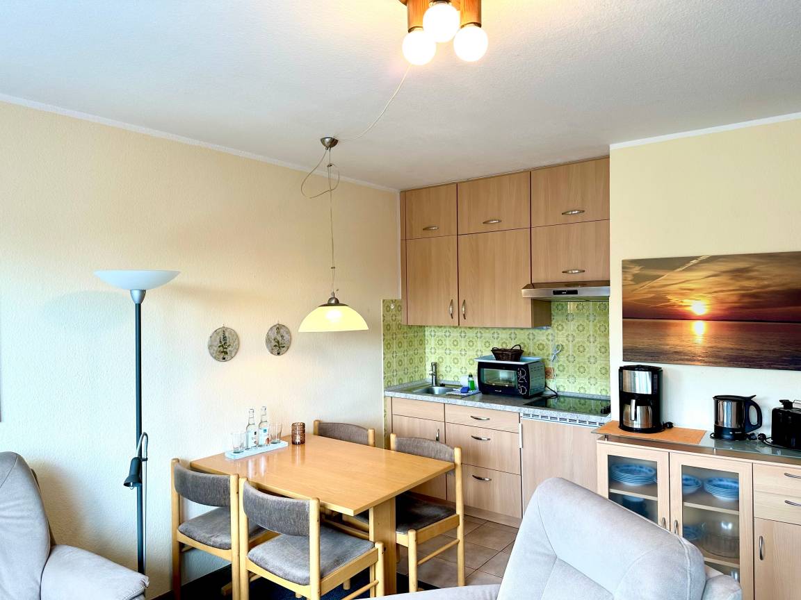Die Wohnung befindet sich im 1. OG und verfügt neben einem lichtdurchflutetem Wohn- Essbereich über ein neues Badezimmer mit Oberlicht. Das Schlafzimmer ist mit zwei Einzelbetten ausgestattet. Der große, möblierte Südbalkon ist über den Wohn- Essbereich zu erreichen und optimal geeignet, um den den Tag entspannt ausklingen zu lassen. Zum Strand und Zentrum sind es nur 5 Minuten Fußweg.
