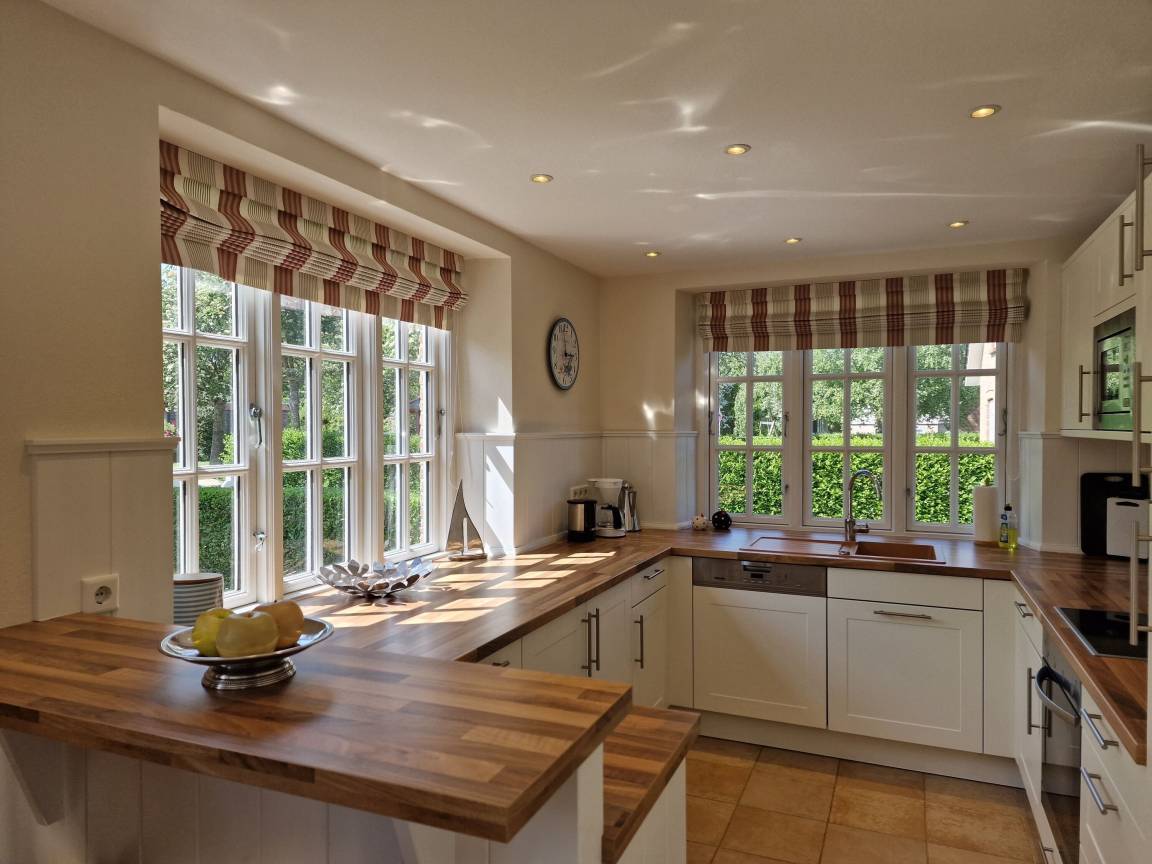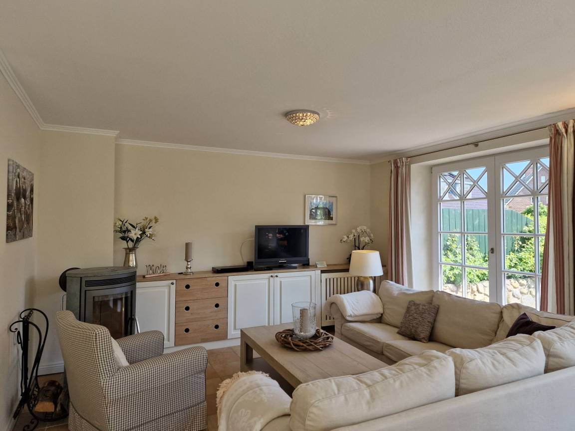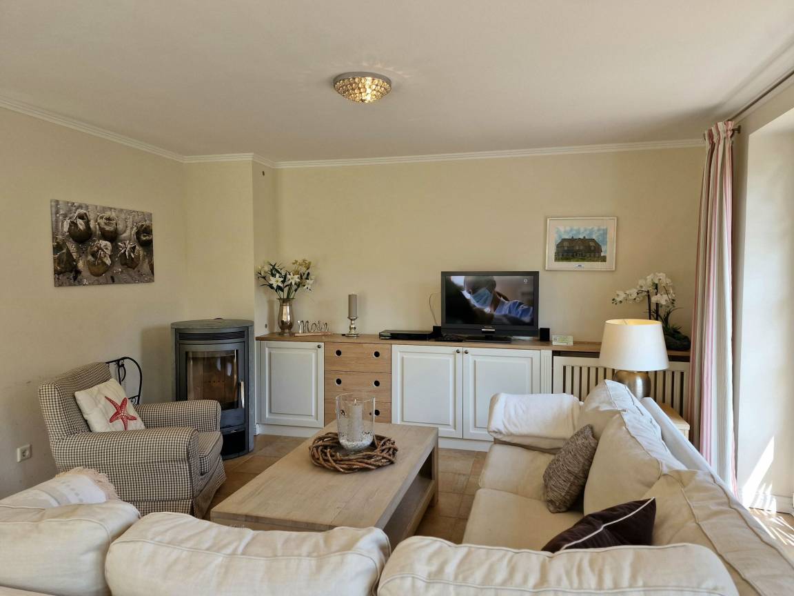 Im Erdgeschoß befindet sich der großzügige Wohnbereich mit einer bequemen Couch und Kaminofen für gemütliche Abende, ein großer Esstisch mit Stühlen und Bank, eine vollausgestattete Küche und ein Duschbad mit Waschmaschine und Trockner zur kostenfreien Nutzung. Auf der Terrasse mit angrenzendem Garten finden Sie Terrassenmöbel, einen Grillkamin sowie einen Strandkorb während der Saison. Im Obergeschoß stehen Ihnen zwei Schlafzimmer mit Doppelbett (davon 1 x mit TV) und ein zweites großes Bad mit Sauna (gegen Gebühr) zur Verfügung. Im Dachgeschoß befindet sich durch eine Tür getrennt das dritte Schlafzimmer mit Doppelbett und TV. Zur Wohnung gehört außerdem ein PKW-Stellplatz hinter dem Haus. Ihre Fahrräder können Sie im abschließbaren Fahrradschuppen abstellen.