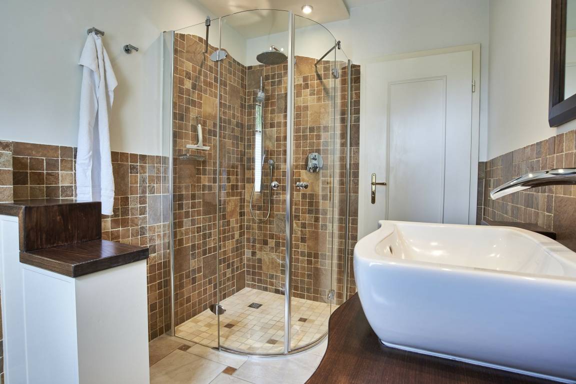 Die großzügige Erdgeschoßwohnung (95 qm) bietet zwei Schlafzimmer, jeweils mit einem Doppelbett. Das Badezimmer wartet mit einer ebenerdigen Regendusche und viel Ablagefläche auf. Im Flur ist eine Garderobe, die Platz für alle Fleece-, Regen- und weitere Jacken hat vorhanden. Weiterhin gibt es noch ein zusätzliches Gäste-WC.