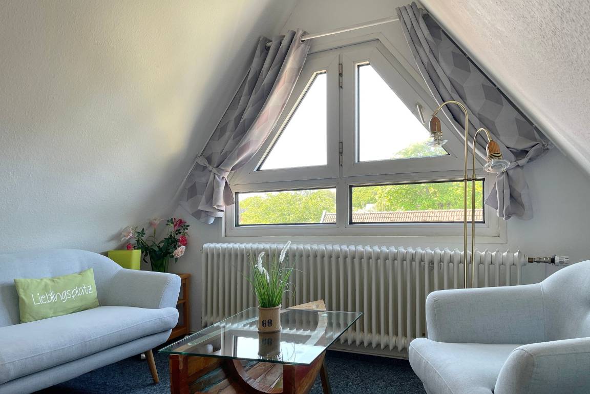 Die Ferienhausanlage Seeadler liegt in der verkehrsberuhigten Zone am Sandwall nur wenige Meter von Cafés, Restaurants, den kleinen Föhrer Geschäften und natürlich dem Strand und dem Meer entfernt. Auf der zweiten Etage der gepflegten Ferienhausanlage befindet sich unsere Wohnung Seeadler 15 und erstreckt sich über zwei Etagen. Während sich im unteren Teil der charmanten Maisonettewohnung das gemütliche Schlafzimmer mit zwei Einzelbetten (90x200cm), das helle Duschbad mit Waschtisch und Waschmaschine und der einladende Wohnbereich mit WLAN, einer Playstation 4, Smart-TV, Festnetztelefon, einem bequemen Schlafsofa (170x190cm) und der integrierten gut ausgestatteten Küchenzeile befindet, können Sie sich im oberen Teil der Wohnung wunderbar zurückziehen , um in der liebevoll eingerichteten Leseecke vielleicht den neu gekauften Föhr Krimi zu lesen oder ein anderes TV-Programm zu genießen. Im Dachgeschoss befindet sich auch ein Doppelbett (keine offizielle Übernachtungsmöglichkeit). Die Wohnung ist mit viel Freude von den Eigentümern hergerichtet wurden, so dass sich unsere Gäste rundherum wohlfühlen können. Besonders im Sommer lädt jedoch auch der Balkon mit Südwest- Ausrichtung zum Relaxen ein.