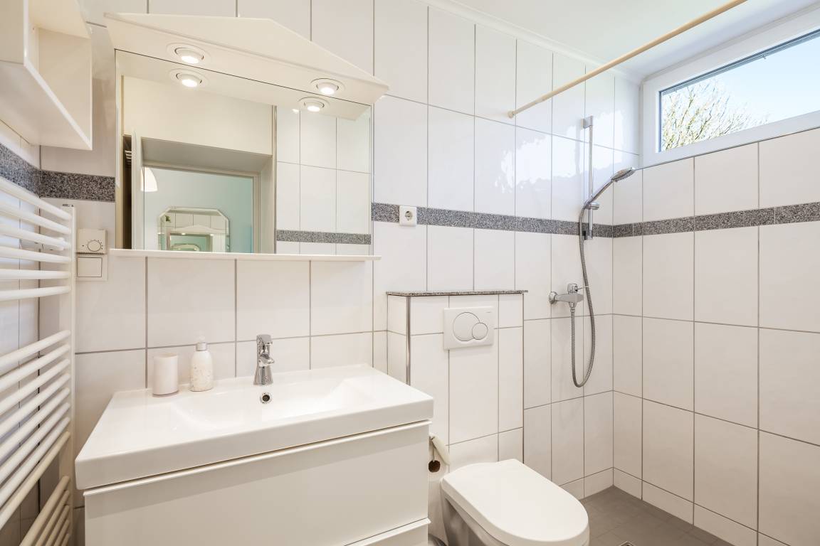 Die Dusche ist komplett ebenerdig und macht einen hellen und freundlichen Eindruck.