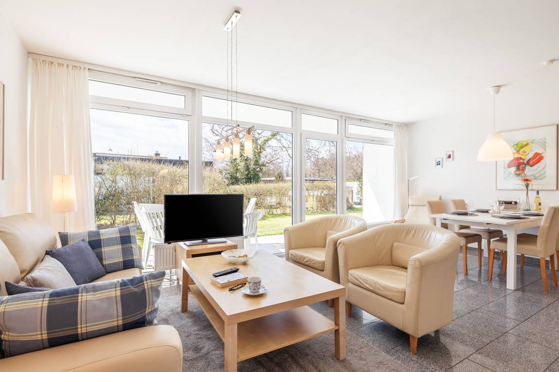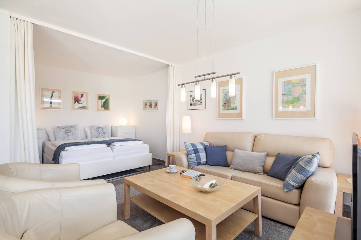 Der gemütliche Wohnbereich bietet neben SAT-TV auch viel Gemütlichkeit z.B. zum Lesen oder Ausruhen. Der Schlafbereich mit Doppelbett ist vom Wohnbereich durch einen Vorhang getrennt.