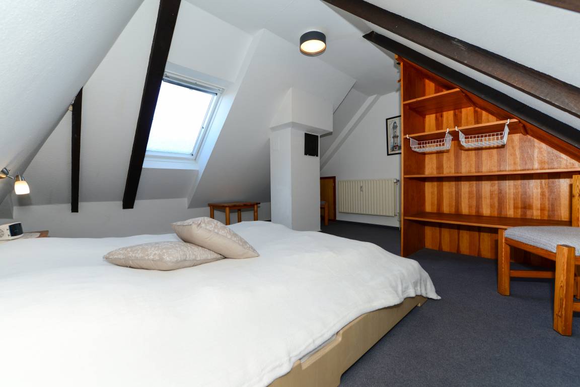 Eine offene Holztreppe führt Sie ins gemütliche Dachgeschoss-Schlafzimmer, ausgestattet mit zwei bodentiefen betten, die ein behagliches Flair versprühen.