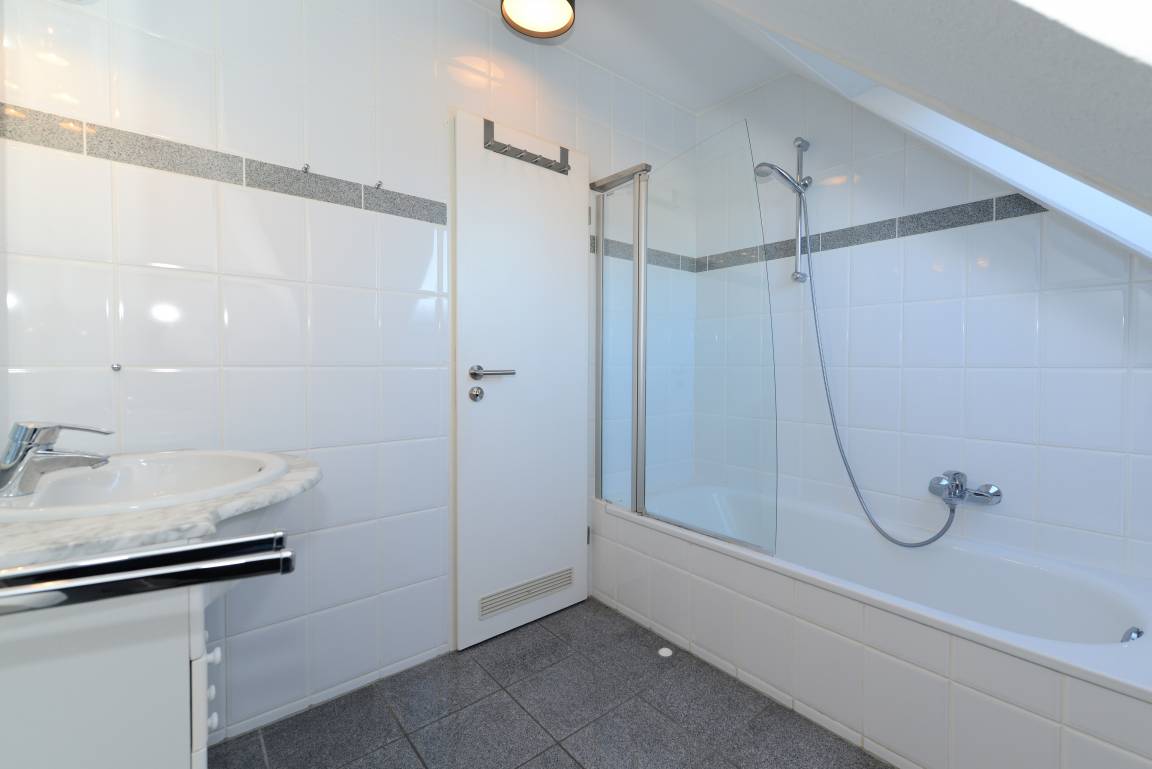 Das weiß geflieste Badezimmer mit Badewanne bietet genügend Platz für Ihre Pflegeprodukte und lädt nach einem Strandtag zum entspannen ein.