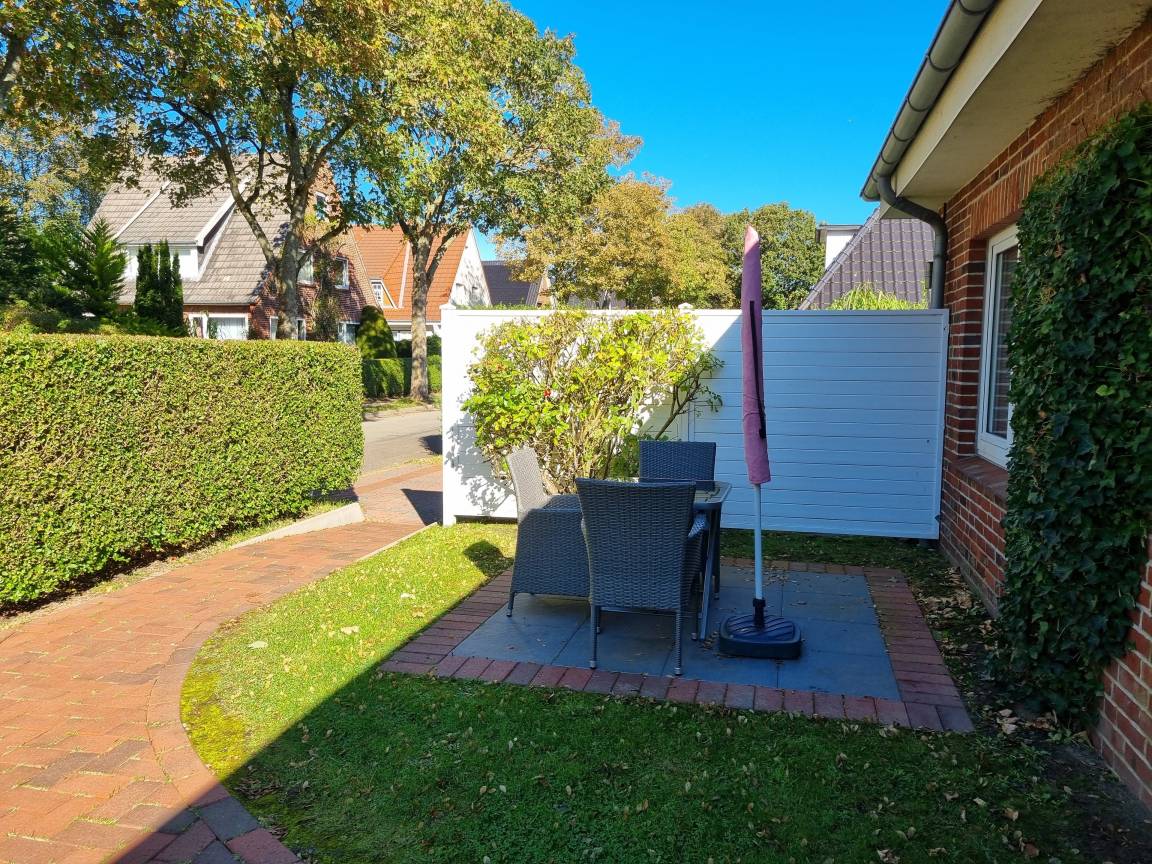 Zur Wohnung gehört eine möblierte Sitzgelegenheit im Garten.