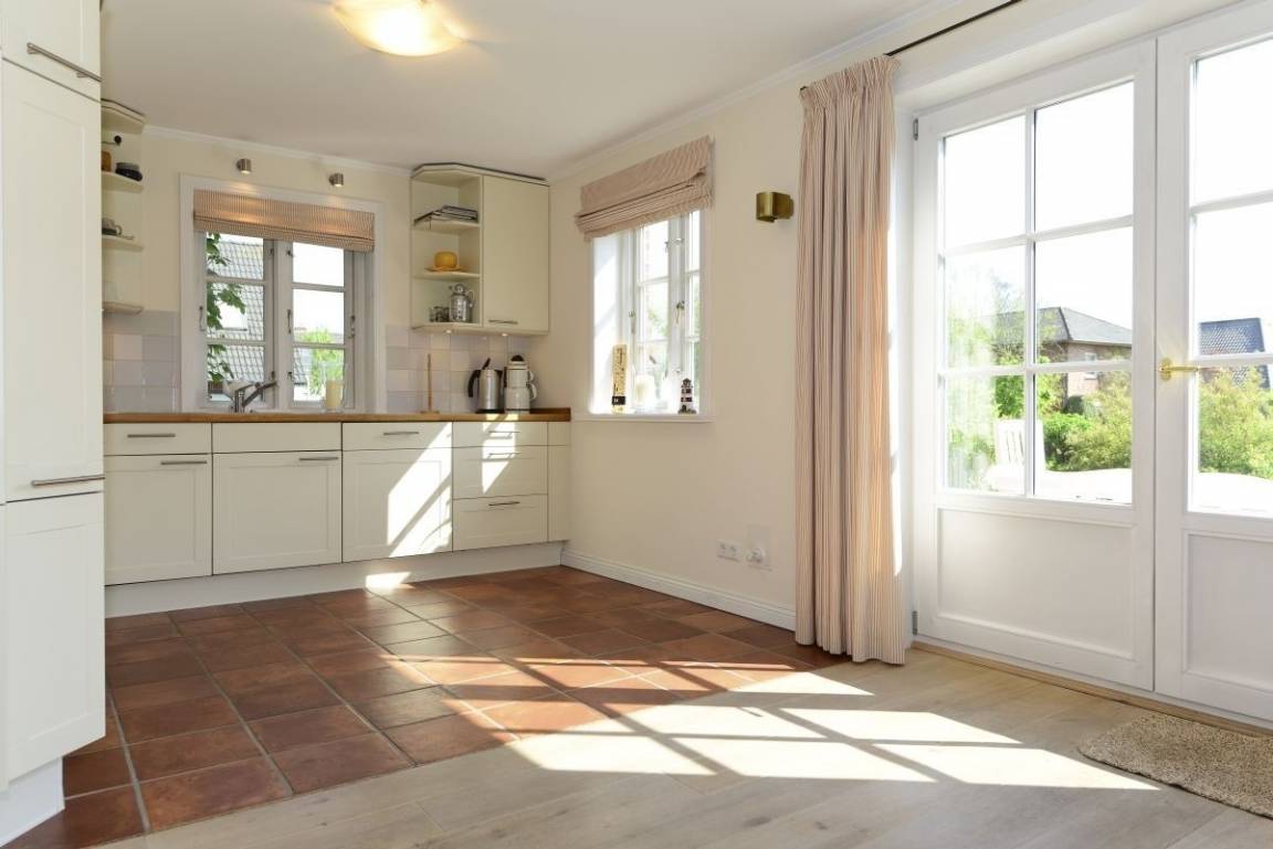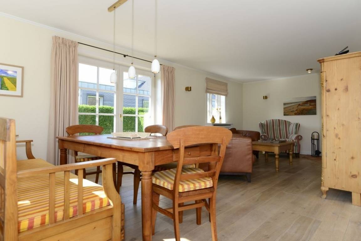 Lassen Sie sich von lichtdurchfluteten Räumen verzaubern! Der großzügige Wohn- und Essbereich ist perfekt für gesellige Stunden, während die offene Wohnküche das Herz jedes Hobbykochs höher schlagen lässt. Im Wohnzimmer können Sie es sich auf der bequemen Sitzgruppe gemütlich machen, während der große Esstisch Raum für fröhliche Runden bietet. Der friesische Kachelofen sorgt für eine behagliche Atmosphäre und lädt zum Entspannen ein.