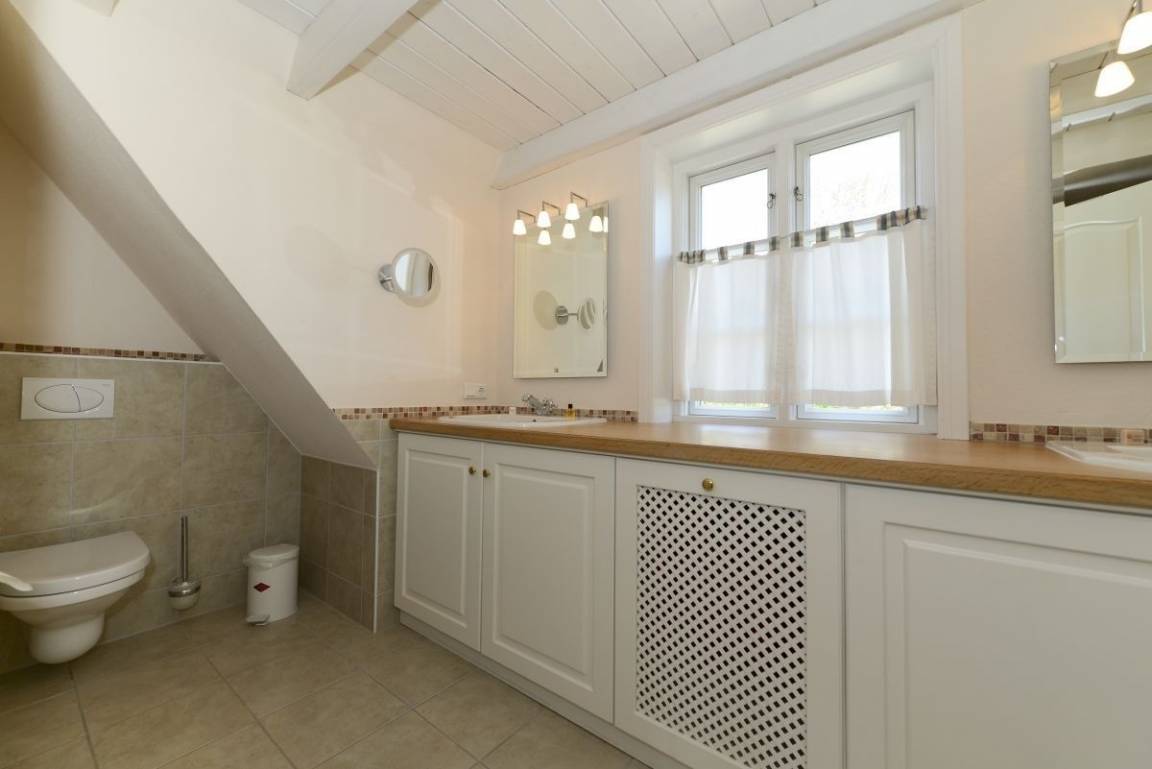Im Obergeschoss erwarten Sie drei Schlafzimmer: ein großes Doppelzimmer für erholsame Nächte, ein weiteres Zimmer mit zwei komfortablen Einzelbetten und ein charmantes Kinderzimmer. Alle Zimmer sind mit Kleiderschränken ausgestattet, sodass Ihre Urlaubsgarderobe ausreichend Platz findet.