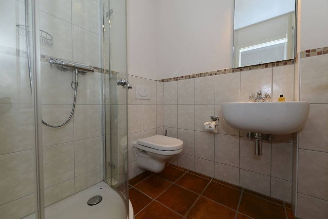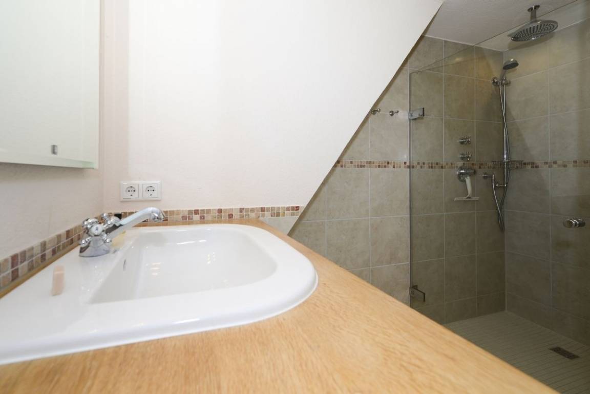 Das helle Badezimmer im Obergeschoss begeistert mit einer großzügigen Regendusche und einem Doppelwaschtisch, während im Erdgeschoss ein zusätzliches Duschbad für weiteren Komfort sorgt.