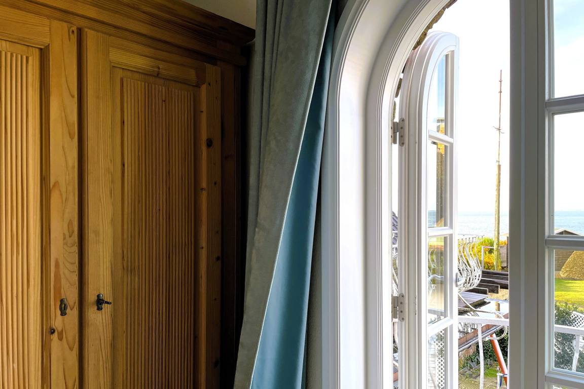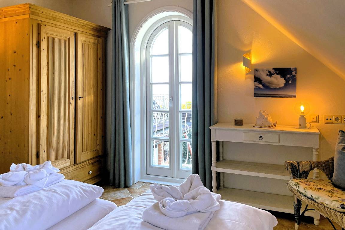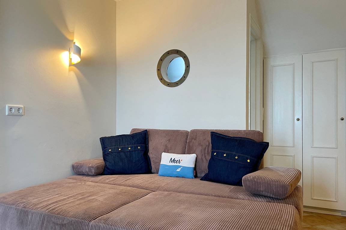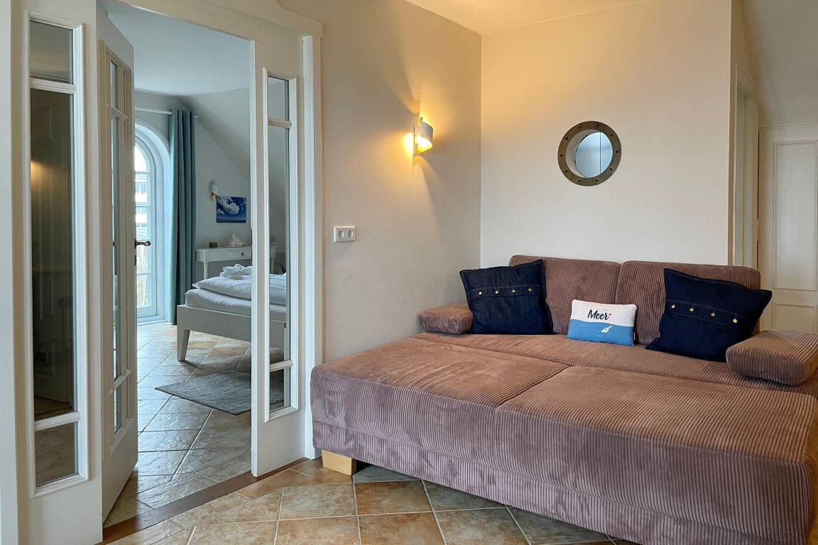 Ein besonderes Highlight ist die Aussicht vom Balkon, der sich direkt vom Wohnzimmer aus erreichen lässt. Hier können Sie an einem Tisch mit Sitzgelegenheiten Ihre Mahlzeiten genießen oder einfach Nordsee und Halligen bewundern. Das separate Schlafzimmer, zugänglich durch eine Glastür vom Wohnbereich aus, bietet ein großes Doppelbett für erholsame Nächte und einen geräumigen Kleiderschrank. Ein kleiner französischer Balkon ermöglicht einen zusätzlichen Blick über die gemeinschaftliche Dachterrasse auf das Meer - perfekt für romantische Momente. Das kompakte Badezimmer mit Dusche und WC grenzt direkt an das Schlafzimmer an und bietet alles Notwendige für Ihre tägliche Pflege.