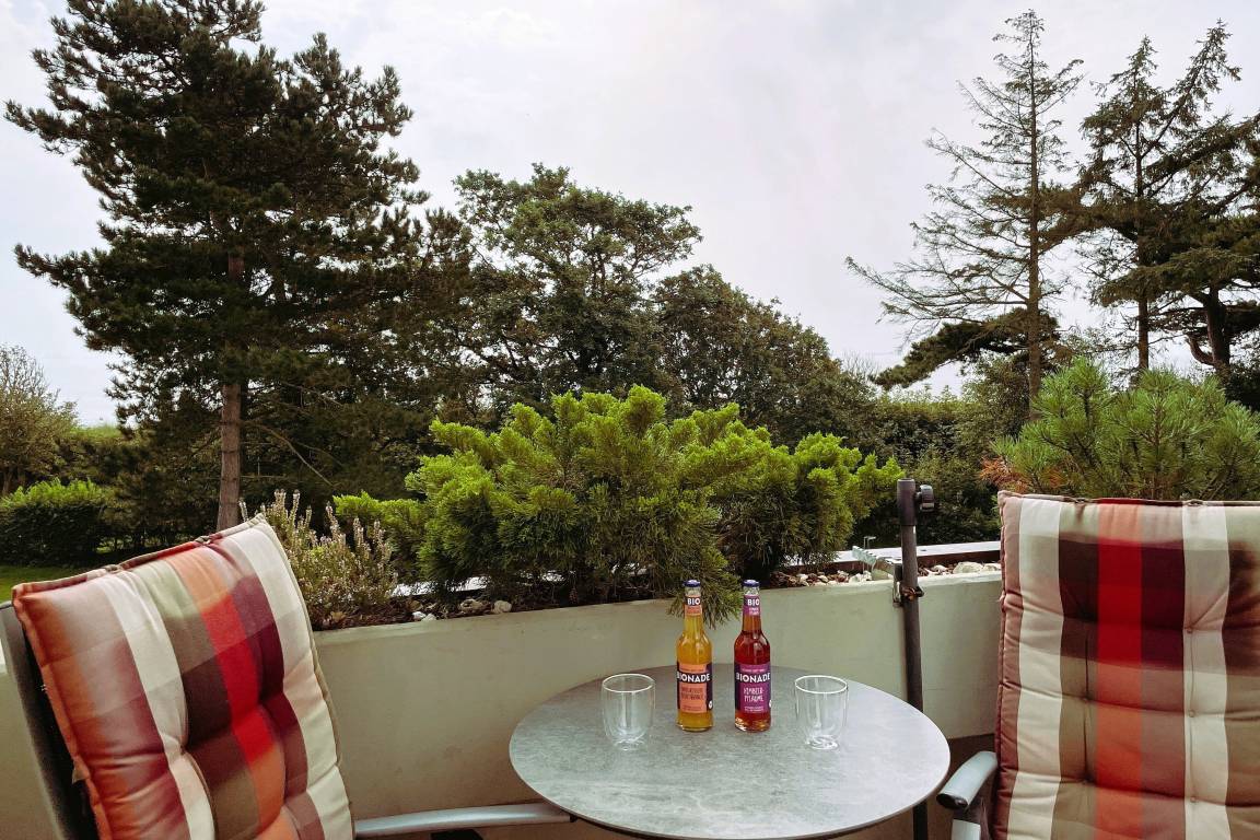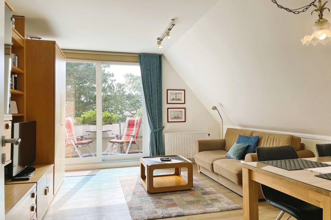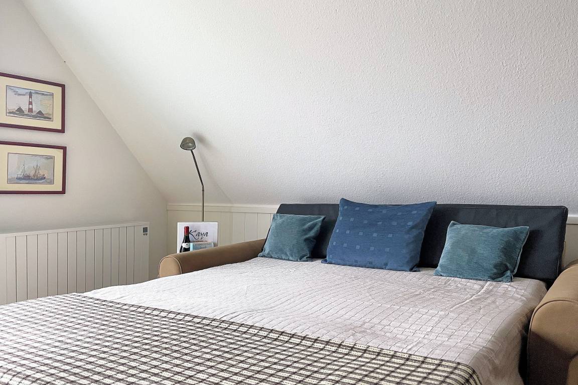 Daneben befindet sich das kleine Badezimmer mit Dusche, welches funktional ist. Das helle geräumige Wohnzimmer mit hochwertigem Schlafsofa mit Lattenrost (150 x190cm), gemütlichem Essbereich, Kabelfernsehen, W-LAN, Telefon mit kostenfreier Nutzung des deutschen Festnetzes führt auf den Balkon hinaus, der einen traumhaften Blick über den weitläufigen Garten hin zum Meer bietet. Das Obergeschoß erreichen Sie über eine Raumspartreppe, die am oberen Ende mit einem Treppenschutzgitter gesichert ist. Hier befinden sich zwei ineinander übergehende Schlafräume mit einem Doppelbett (160x 200 cm) und zwei Einzelbetten (teils unter einer Dachschräge je 90x200 cm). Von dem einen Raum haben Sie ebenfalls den schönen Blick auf das Meer. Alle wichtigen Versorgungseinrichtungen wie Bäcker, Supermarkt usw. erreichen Sie innerhalb von 10 Gehminuten. Zum Strand sind es ca. 100m und das Meerwasserwellenbad Aqua Föhr erreichen Sie in wenigen Gehminuten. Das Zentrum von Wyk sowie die Promenade mit gemütlichen Cafés und Boutiquen sind in wenigen Gehminuten erreichbar.
