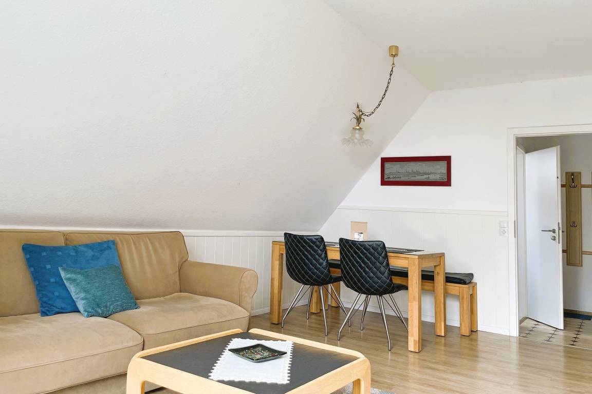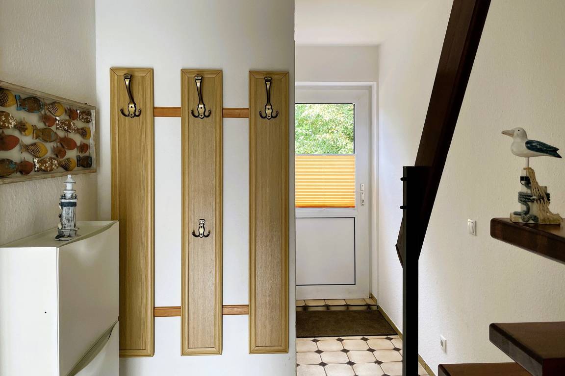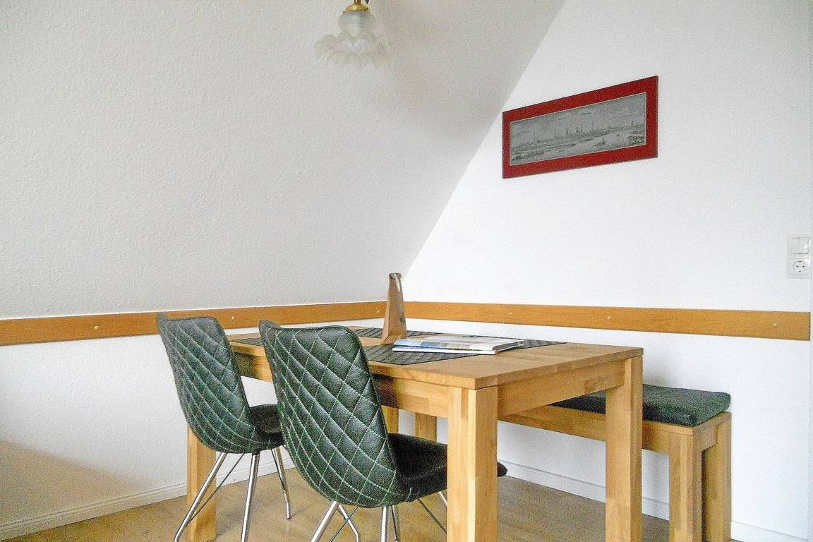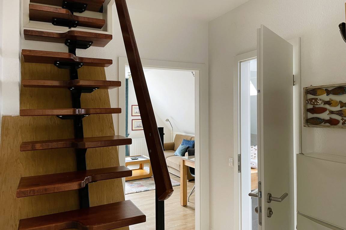 Unsere Wohnung Meeresbrandung befindet sich in der zweiten Etage in einem gepflegten, ruhig gelegenen , von Grün umgebenen Reihenhaus im Olhörnweg 1 und erstreckt sich über 2 Ebenen. Vom Eingang aus gehen Sie in eine vollausgestattete Küche mit Ceranfeld-Herd, Backofen, Mikrowelle, Wasserkocher, Kaffeemaschine, Geschirrspüler, Waschtrockner und Eierkocher, die zum Kochen einlädt.
