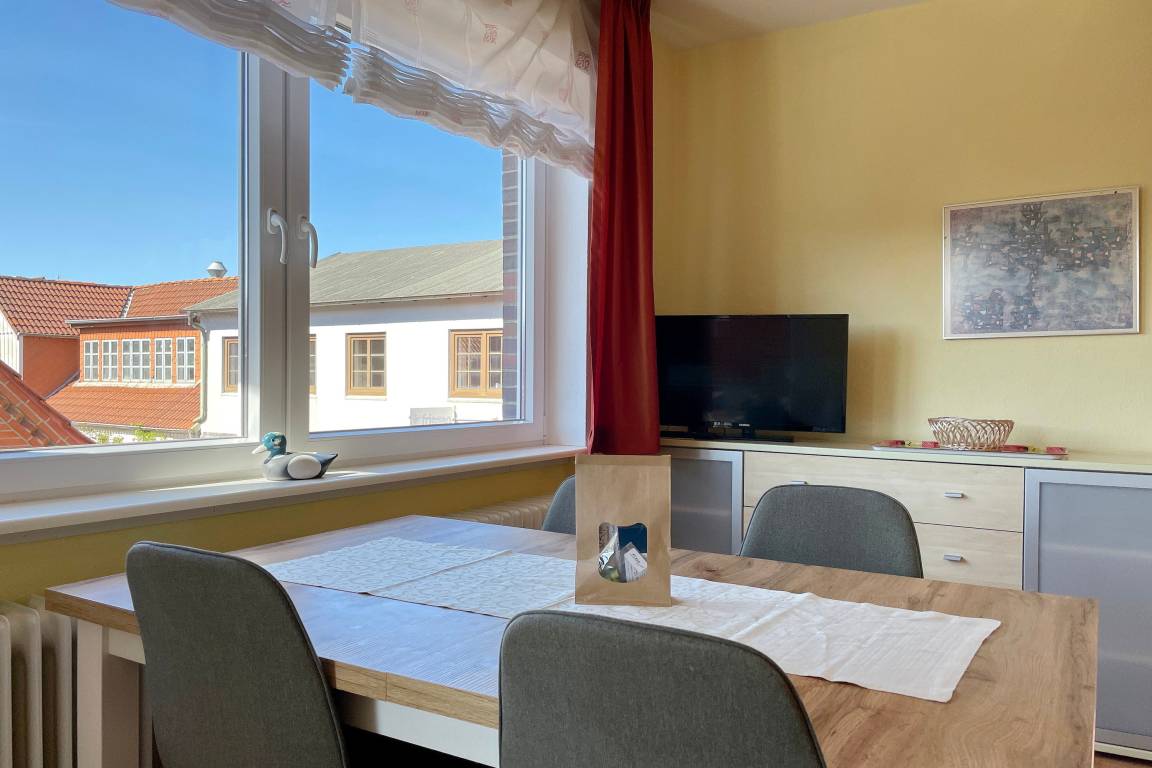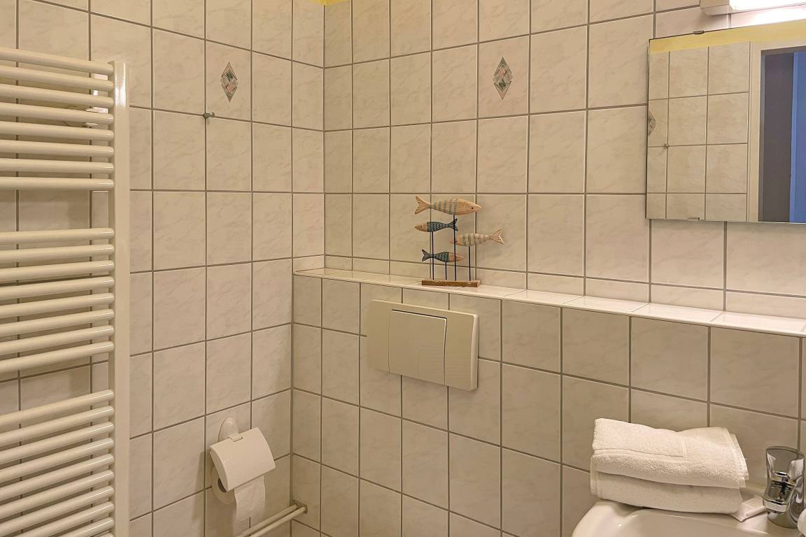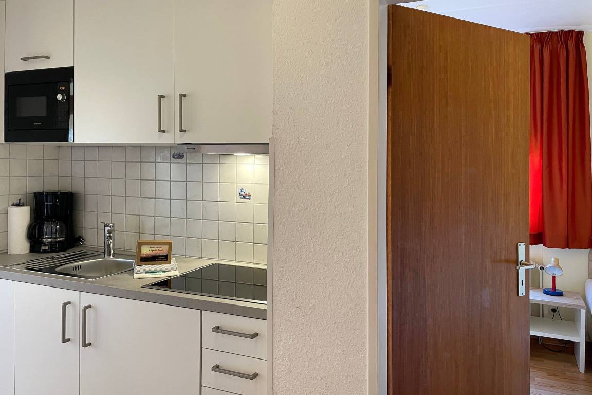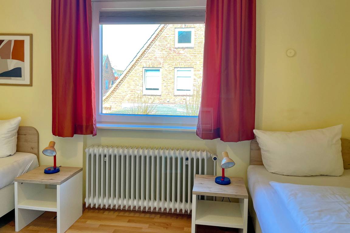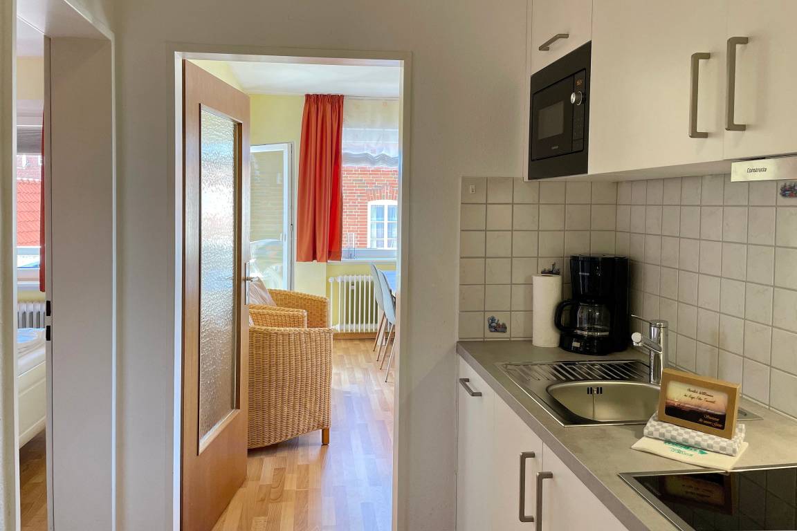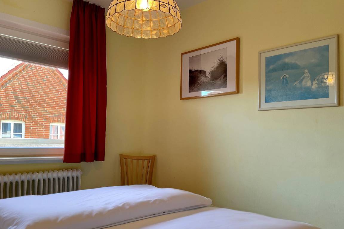 Im ersten Obergeschoß liegt die Altstadtwohnung 2 und ist mit zwei Schlafzimmern ideal geeignet für kleine Familien. So haben Kinder im Schlafzimmer mit zwei Einzelbetten ihr eigenes Reich, während Eltern im Schlafzimmer mit Doppelbett ausschlafen könnten. Das Bad ist mit einer Dusche ausgestattet. Das freundlich eingerichtete Wohnzimmer ist hell und geräumig, genießen Sie hier Zeit mit der ganzen Familie zusammen. Die integrierte Küchenzeile ist gut ausgestattet, so dass Sie sich wunderbar zu Hause versorgen möchte, wenn Sie nicht mal eben hinaus vor die Tür möchten, wo sich eine Vielzahl an Cafés und Restaurants befindet. Weiterhin gehört zu der Wohnung ein Südwestbalkon mit einem malerischen Blick auf die Wyker Altstadt..