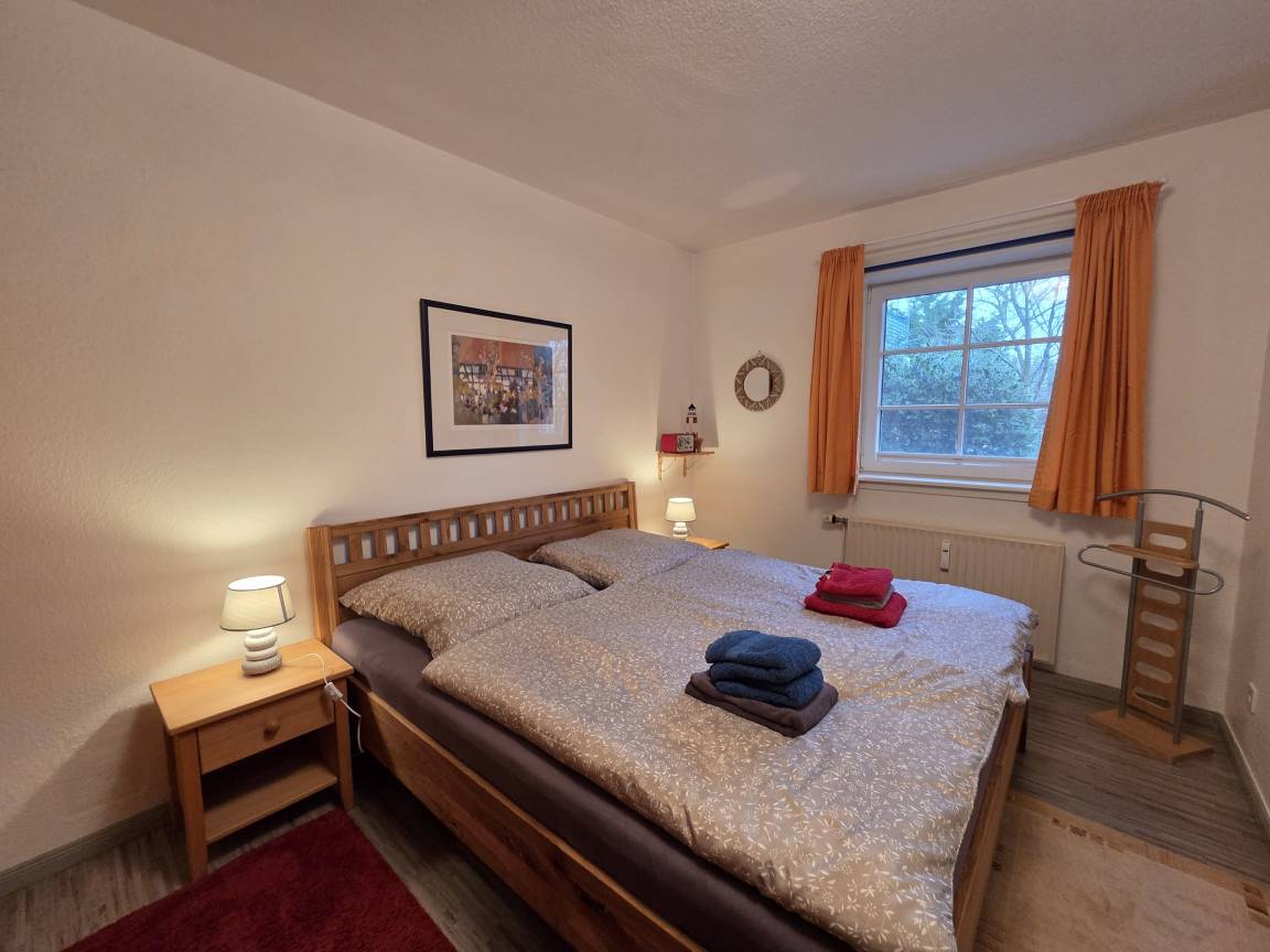 Das Schlafzimmer ist mit einem Doppelbett (1,80 × 2,00 m) mit geschlossenem Fußende sowie einem geräumigen Kleiderschrank ausgestattet.