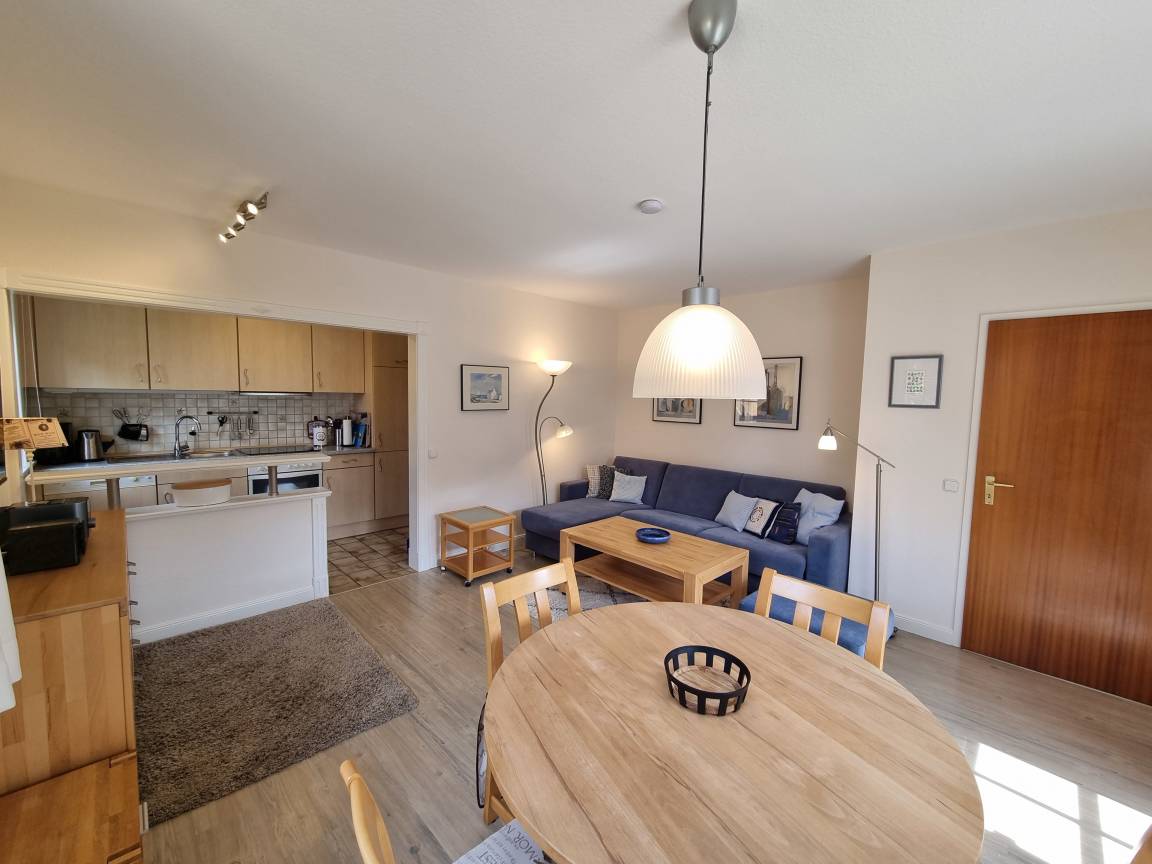 Der helle, offene Wohnbereich integriert eine moderne Einbauküche mit allem Komfort für Selbstversorger, einen gemütlichen Essbereich sowie eine behagliche Sitzecke zum Entspannen.