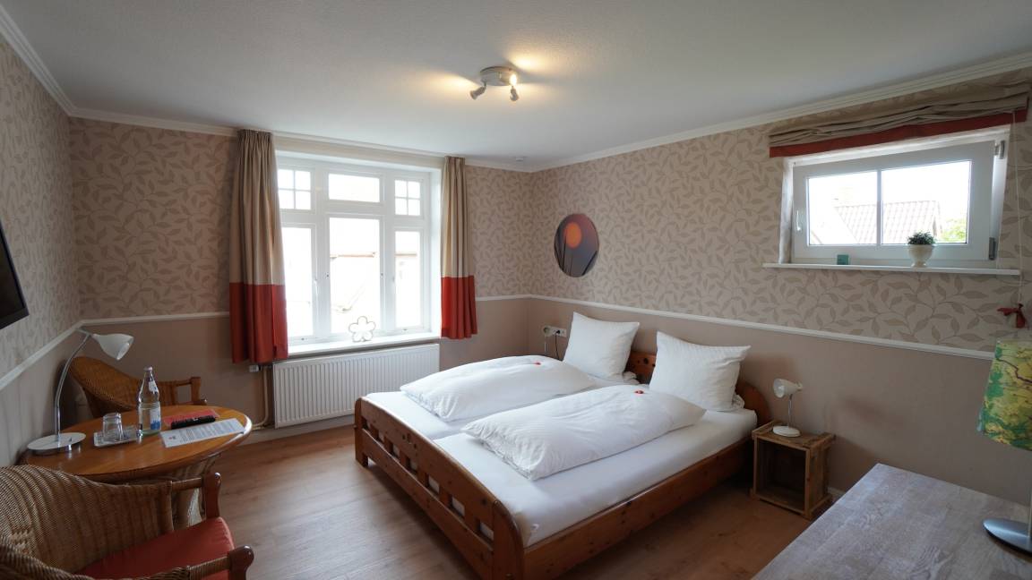 Hier erwartet Sie ein großzügiges Zimmer mit warmen Holzmöbeln und einem bequemen Doppelbett. Die angenehme Atmosphäre sorgt für einen erholsamen Schlaf. Ideal für Paare, die in einer ruhigen und komfortablen Umgebung entspannen möchten.