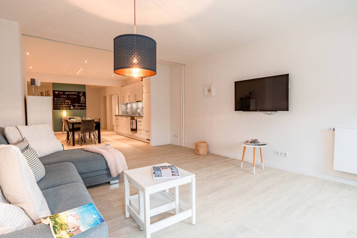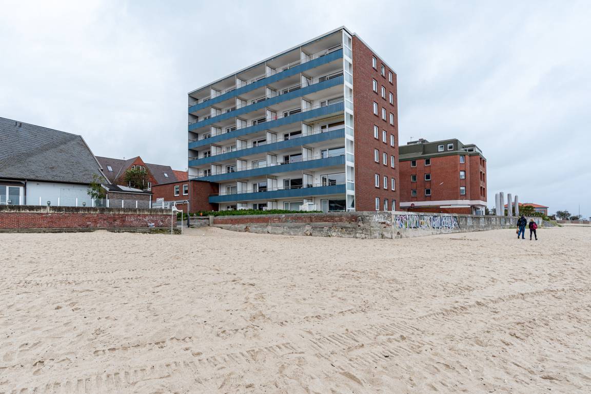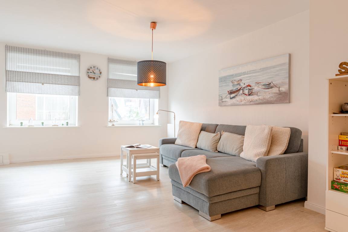 Diese exklusive Unterkunft befindet sich direkt am Sandwall von Wyk am Strand gelegen. Die Wohnung liegt im 1. OG und kann über einen Personenaufzug im Treppenhaus des Mehrfamilienhauses erreicht werden. Die offen gestaltete Wohnung verfügt über ein großes Schlafzimmer mit Doppelbett, ein geräumiges Schlafzimmer mit zwei Einzelbetten und einem Schlafzimmer mit Einzelbett. Es befindet sich ein Duschbad und ein extra Gäste-WC, in dem auch eine Waschmaschine und ein Trockner stehen, in der Wohnung. Die offene Wohnküche mit großem Esstisch geht fliessend in den Wohnzimmerbereich über. Vom Wohnzimmer aus hat man einen seitlichen Blick aufs Meer und die neue Mittelbrücke.