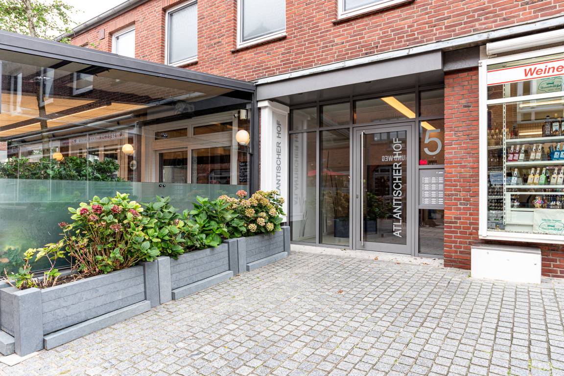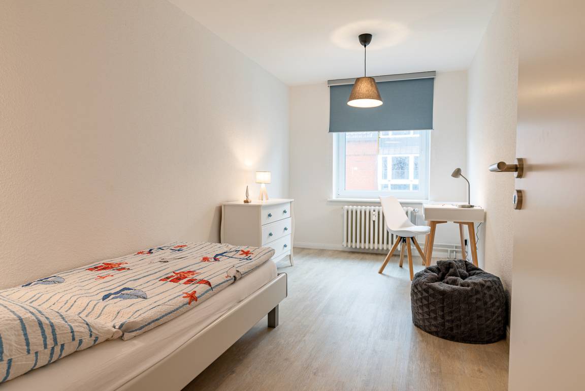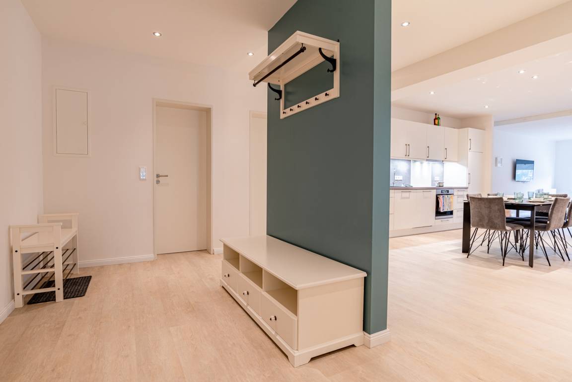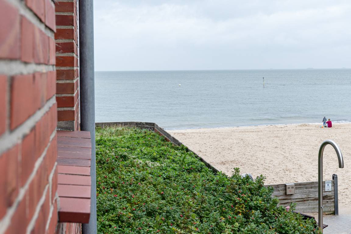 Diese exklusive Unterkunft befindet sich direkt am Sandwall von Wyk am Strand gelegen. Die Wohnung liegt im 1. OG und kann über einen Personenaufzug im Treppenhaus des Mehrfamilienhauses erreicht werden. Die offen gestaltete Wohnung verfügt über ein großes Schlafzimmer mit Doppelbett, ein geräumiges Schlafzimmer mit zwei Einzelbetten und einem Schlafzimmer mit Einzelbett. Es befindet sich ein Duschbad und ein extra Gäste-WC, in dem auch eine Waschmaschine und ein Trockner stehen, in der Wohnung. Die offene Wohnküche mit großem Esstisch geht fliessend in den Wohnzimmerbereich über. Vom Wohnzimmer aus hat man einen seitlichen Blick aufs Meer und die neue Mittelbrücke.
