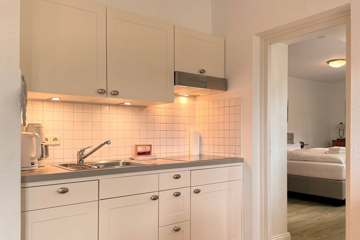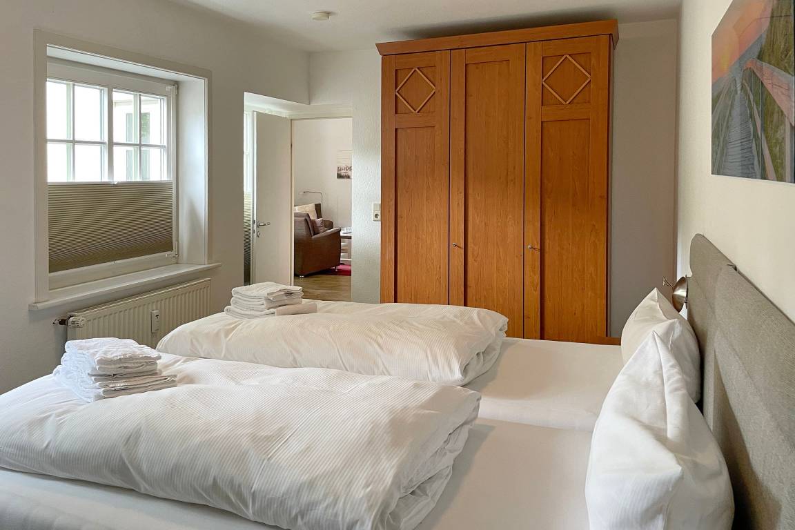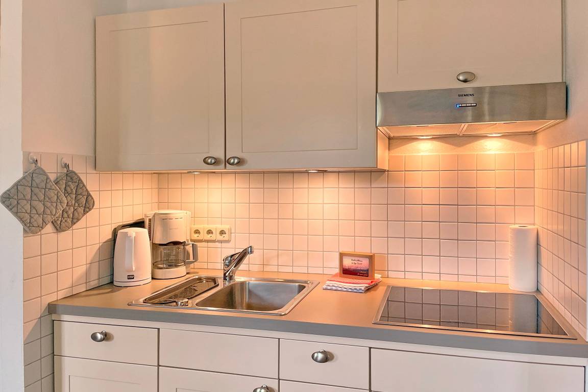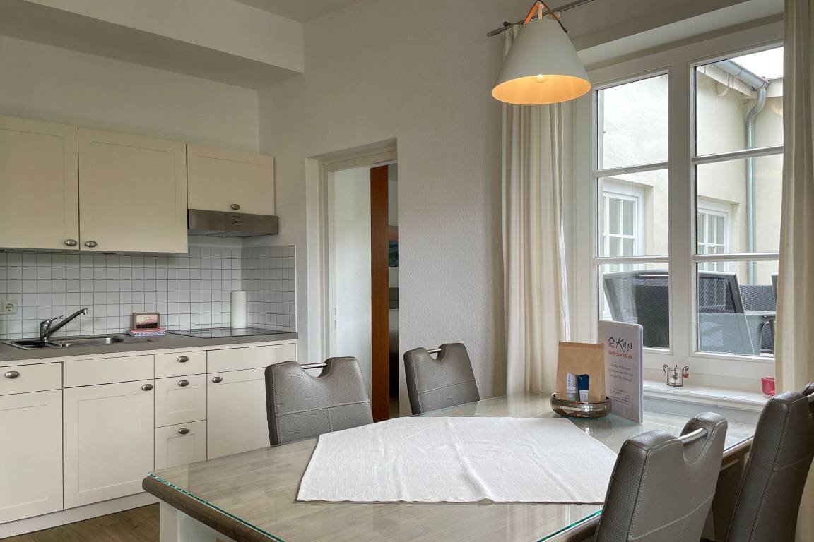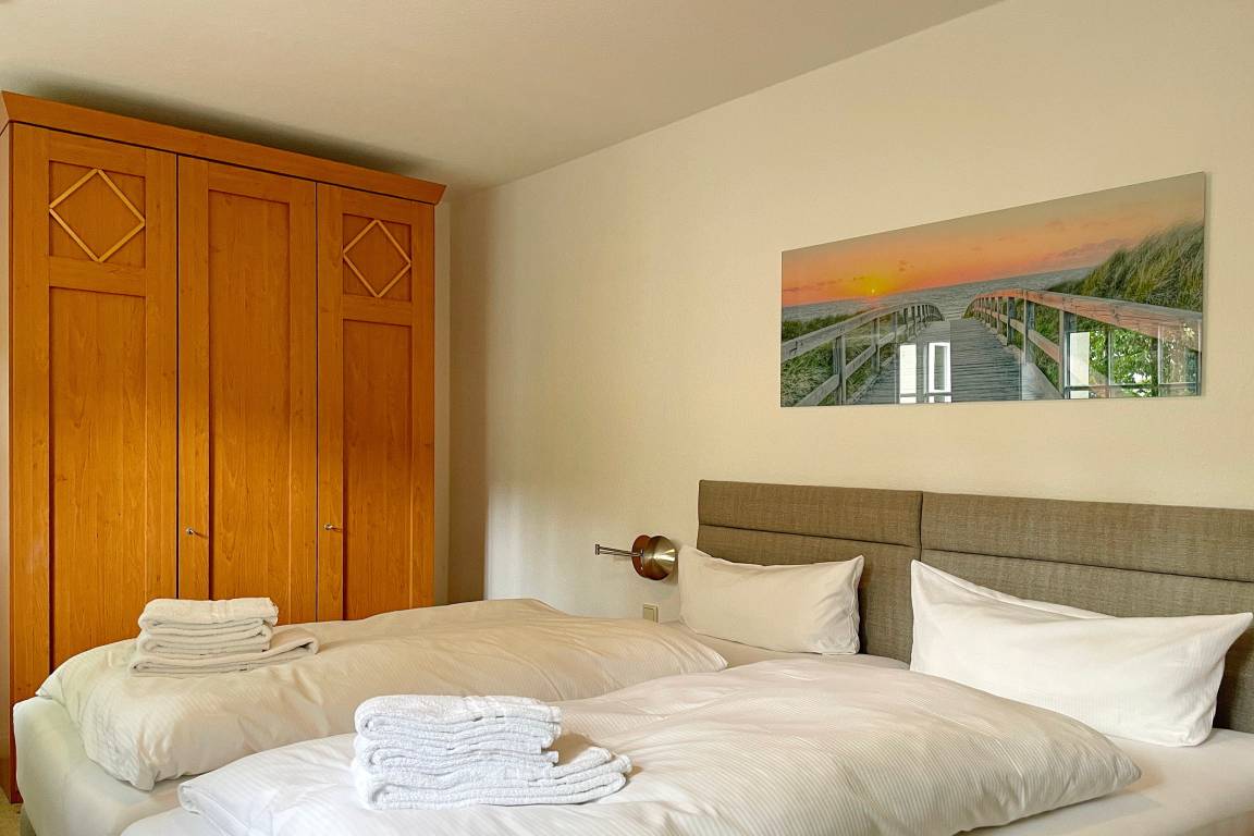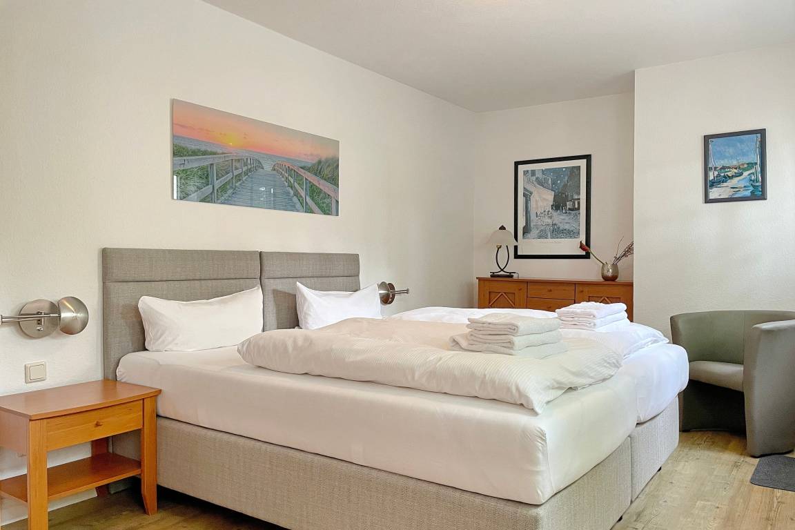 Das Galeriehaus ist ein historisches Gebäude von Wyk, welches außen immer noch den einstigen Charme von vergangenen Zeiten aufweist, doch innerhalb der Fassade umgebaut und renoviert wurde. Jetzt befinden sich im Galeriehaus 4 Wohnungen für je 2 Personen. Die zentrale Lage zur Innenstadt, dem Strand und der Nordsee, dem Meerwasserwellenbad Aqua Föhr und zu den Einkaufläden machen unsere Wohnungen im Galeriehaus sehr beliebt. Schon beim Betreten der Obergeschoßwohnung Van Gogh fühlt man sich herzlich Willkommen. Die offen gestaltete Wohnung wurde liebevoll eingerichtet und die Dekoration wie auch die Möbel wurden harmonisch aufeinander abgestimmt. Der Wohnbereich in braunen und weißen Tönen gehalten wird mit dem roten Teppich als Farbakzent abgerundet und lädt mit Flachbild-TV, Stereoanlage sowie einer gemütlichen Sitzgruppe zum Verweilen ein. Hier integriert ist auch die Küchenzeile, welche funktional mit Ceranfeldherd, Kühlschrank mit Gefrierfach, Geschirrspüler, Kaffeemaschine und Wasserkocher ausgestattet wurde. Das Tageslichtbad mit Dusche, Handtuchheizkörper und Schminkspiegel ist klein und fein. Schöne Träume genießen Sie im Schlafzimmer, welches mit Boxspringbett, Kommode, dreitürigem Kleiderschrank und ausgesuchten Accessoires behaglich wirkt.