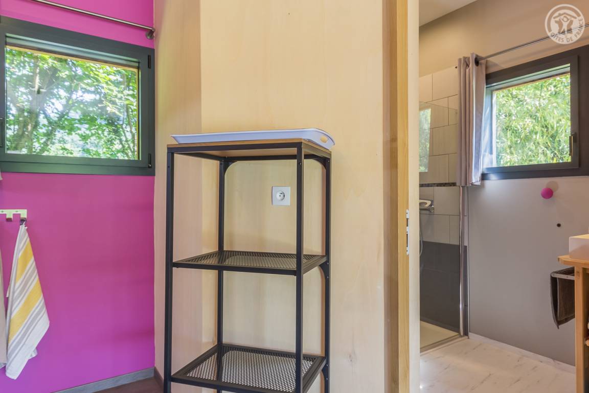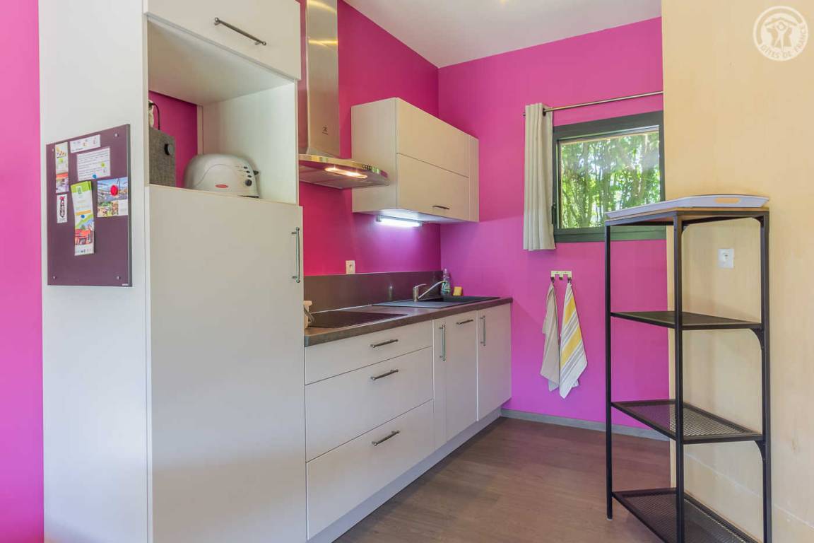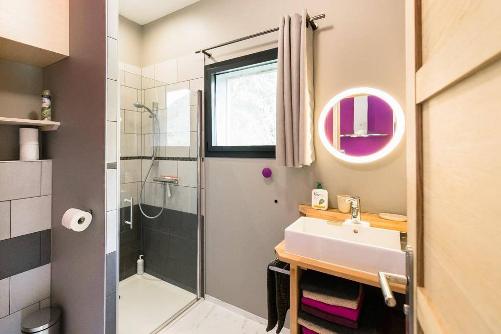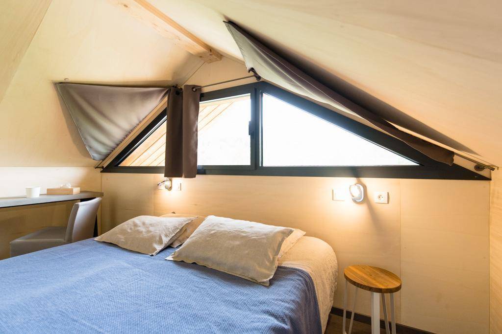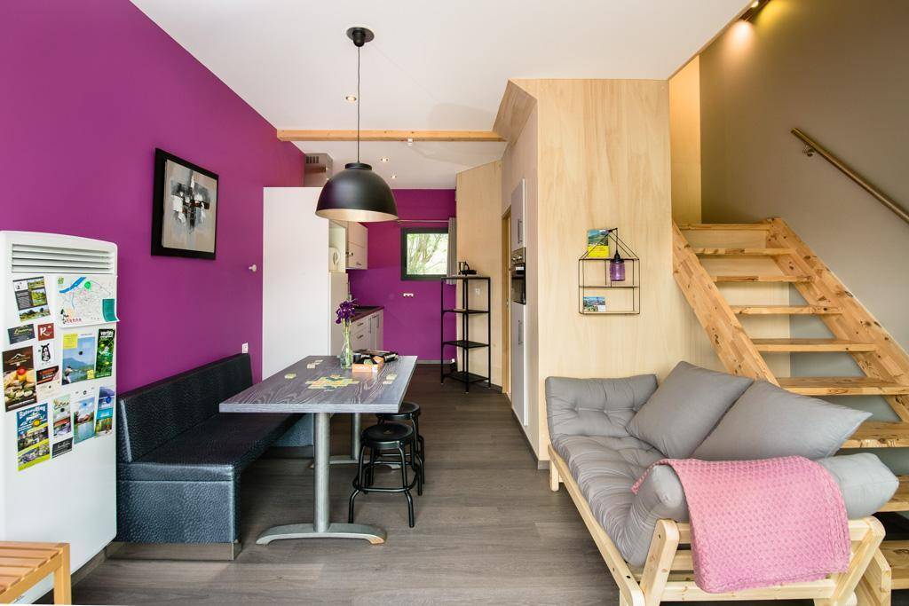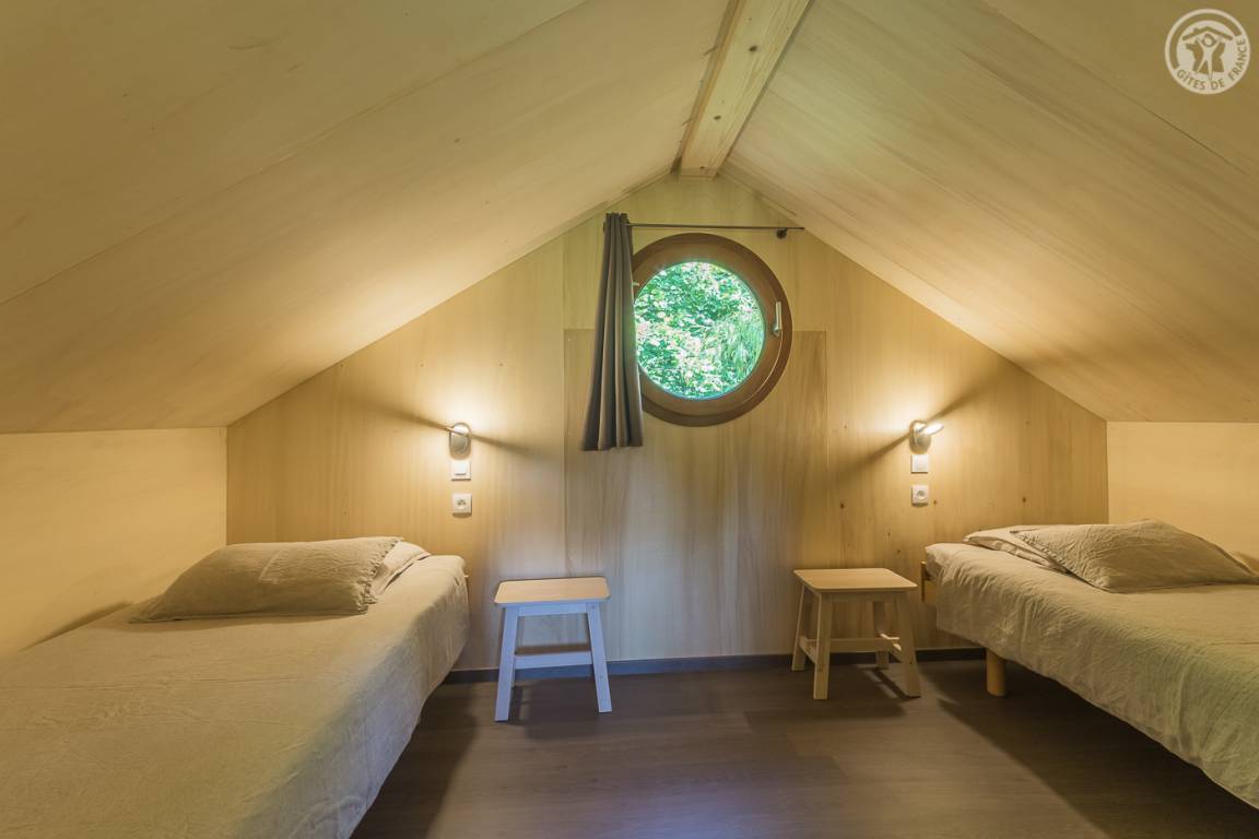 Individuelle Chalet-Hütte auf 2 Ebenen inklusive Wohnküche (Bluetooth-Lautsprecher, Safe), Badezimmer mit WC. Obergeschoss: 2 Schlafzimmer (2 Einzelbetten 90 x 190 cm, die zu 1 Doppelbett zusammengestellt werden können / 2 Einzelbetten 80 x 200 cm, die zu 1 Doppelbett zusammengestellt werden können) Gesamtfläche des Chalets: 42 m² inklusive Dachboden Bereiche. Private Terrasse. Gemeinsame Waschmaschine und Trockner.