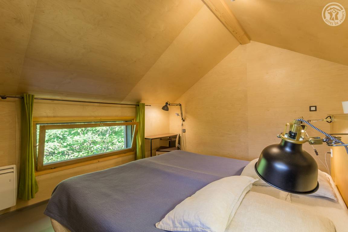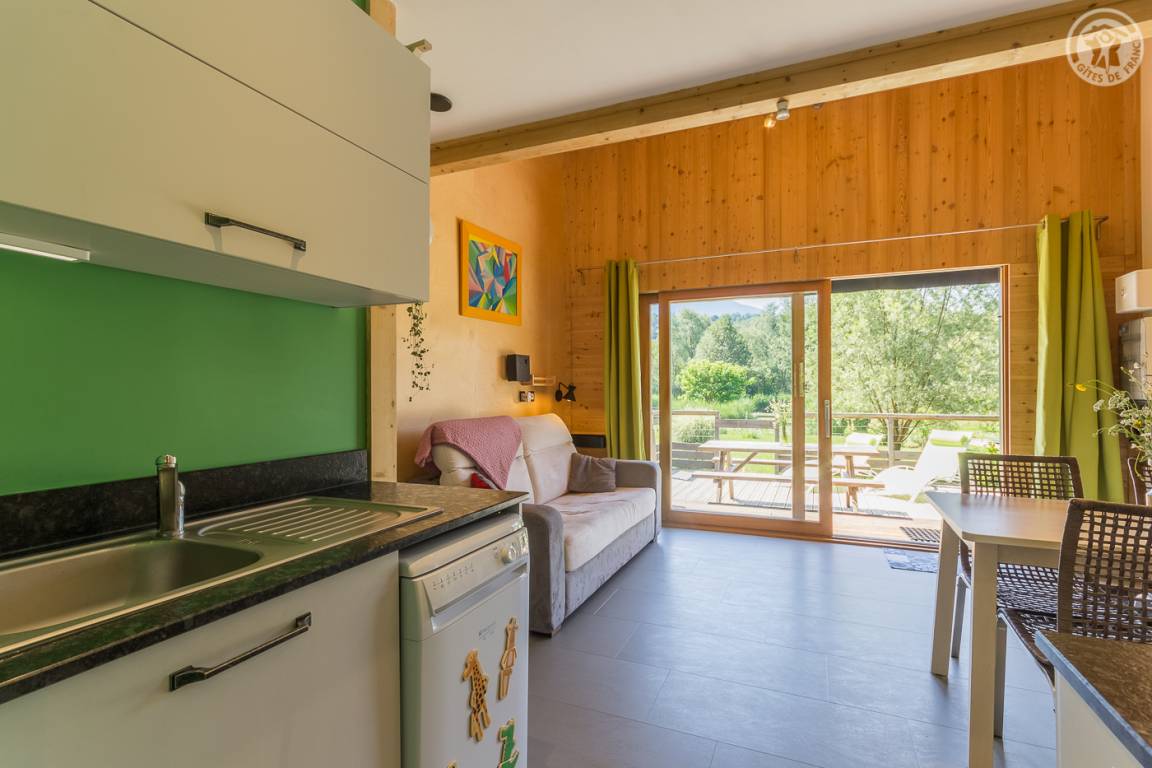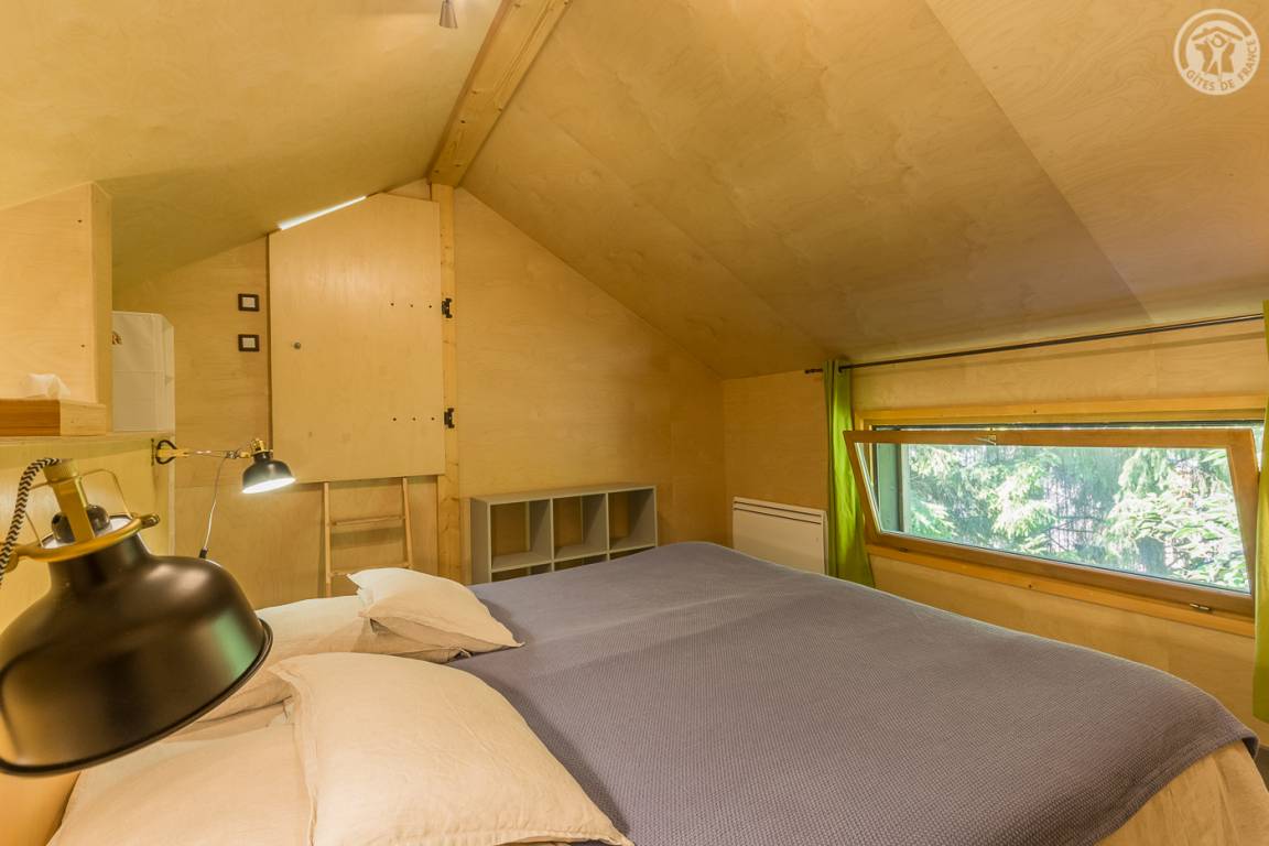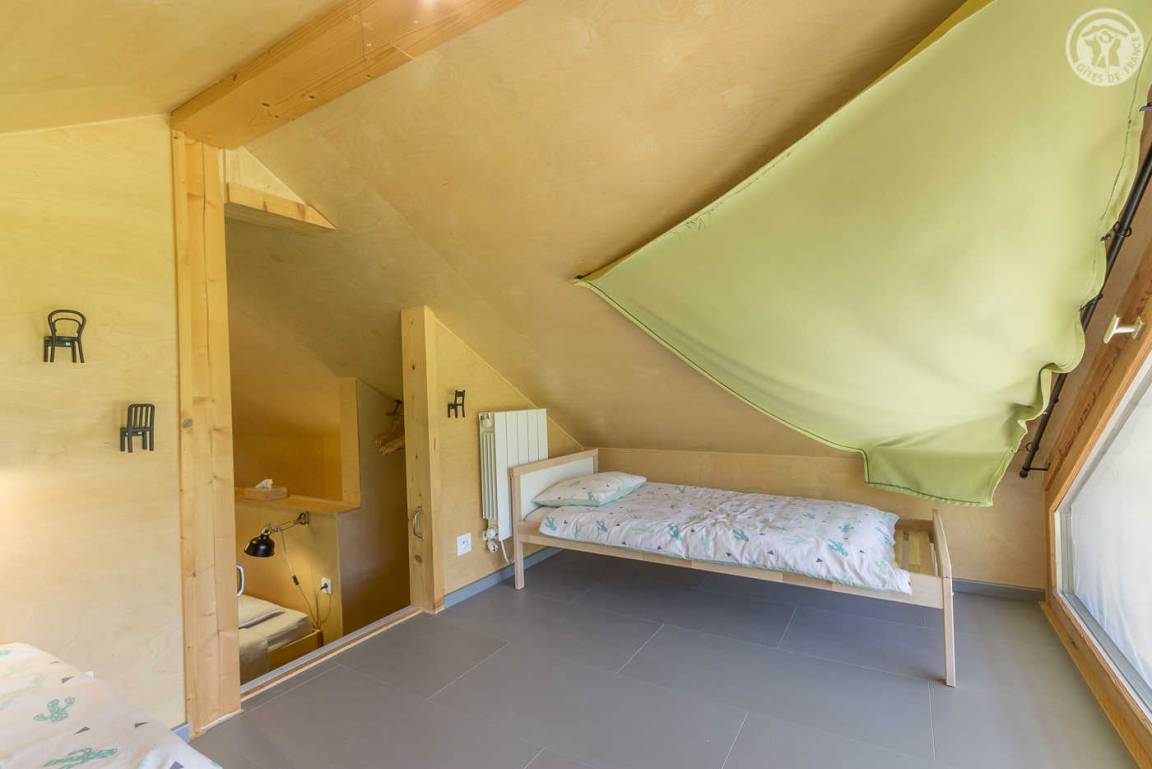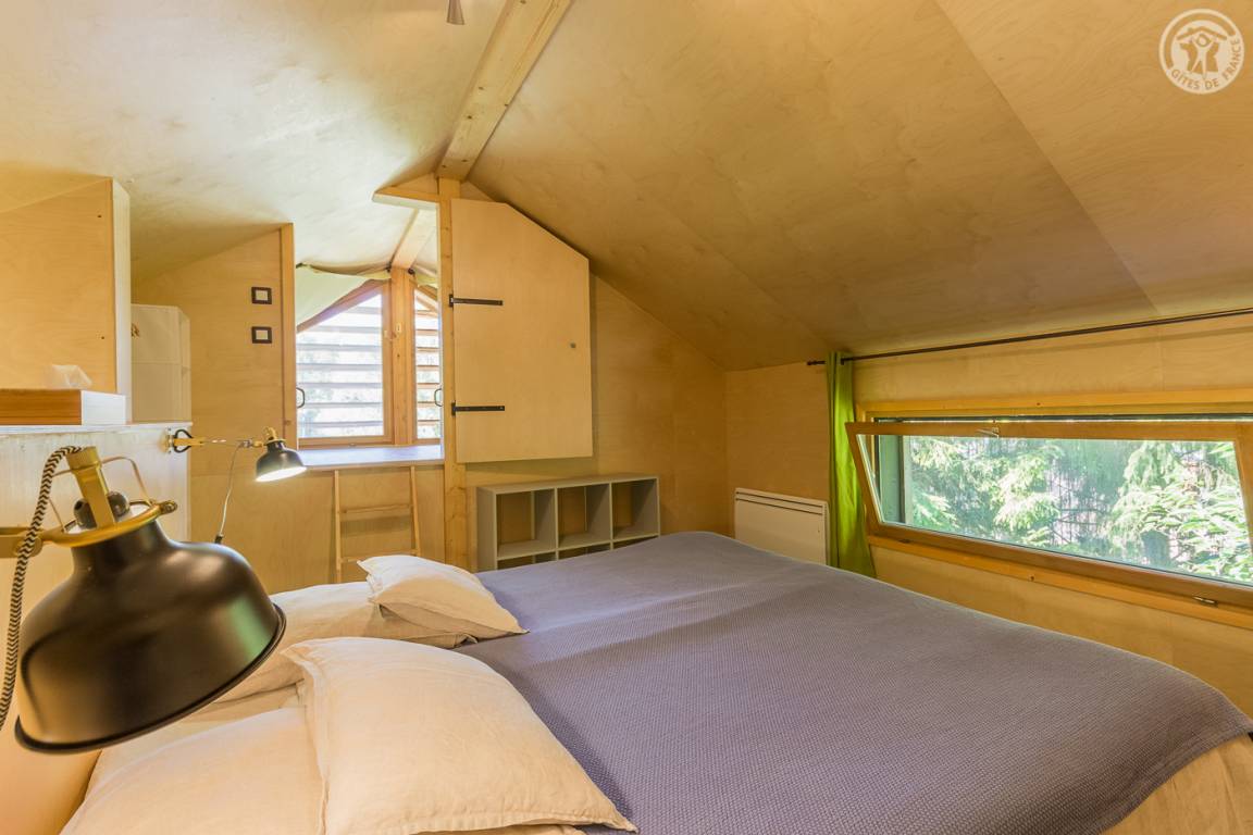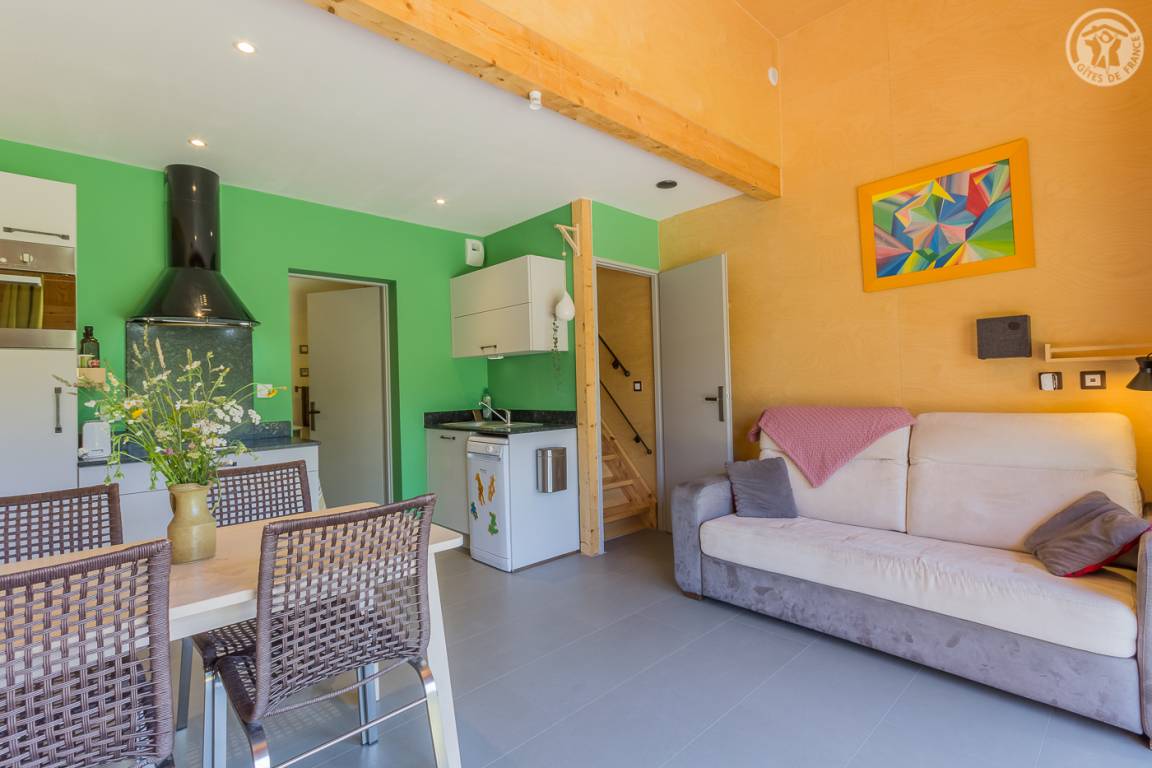 Individuelle Chalet-Hütte auf 2 Ebenen inklusive Wohnküche (Bluetooth-Lautsprecher, Safe), Badezimmer mit WC. Etage unter dem Dachgeschoss, 2 angrenzende Schlafzimmer: 1 Schlafzimmer im Zwischengeschoss (1 Doppelbett 160 x 200 cm) mit einem kleinen Schlafzimmer für Kinder, auf einer Unterkante von weniger als 1,80 m und über eine Leiter erreichbar (2 Betten für Kinder von 1,80 m). unter 8 Jahren: 70 x 140 cm / 70 x 160 cm). Gesamtfläche des Chalets: 42 m² inklusive Dachgeschossflächen. Private Terrasse. Gemeinsame Waschmaschine und Trockner.