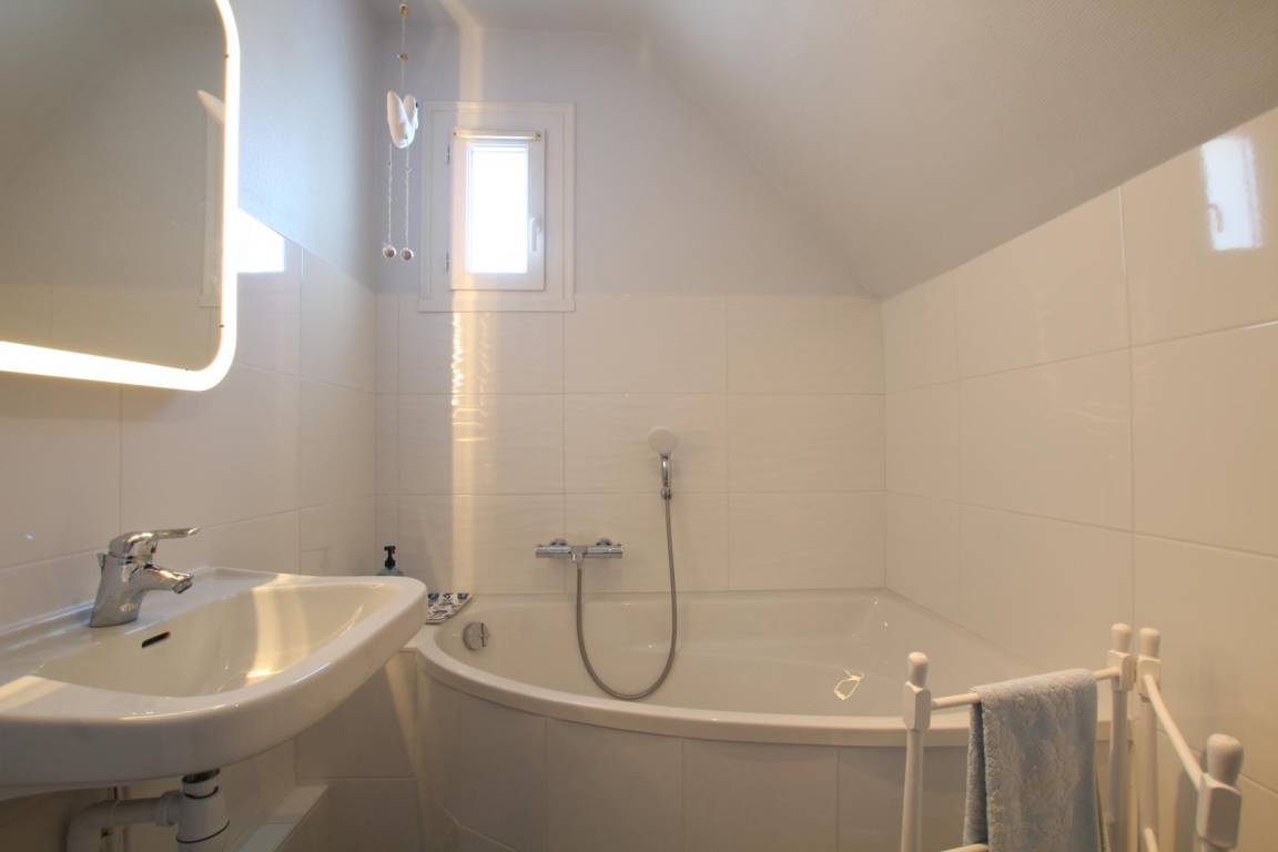Freistehendes Haus (125 m²). Privates, umzäuntes Grundstück. Großer Parkplatz. Zugang über Außentreppe. Erdgeschoss: voll ausgestattete Küche; großer, offener Wohn- und Essbereich; WC; Duschbad (ebenerdige Dusche, Föhn, Waschmaschine, Staubsauger); Besenschrank. Obergeschoss: Schlafzimmer 1 (1 Doppelbett 140x190 cm); Schlafzimmer 2 (1 Doppelbett 140x190 cm), Kinderschlafsofa; Schlafzimmer 3 (2 Einzelbetten 90x190 cm); WC; Badezimmer. Südterrasse (25 m²) mit Markise, Gartentisch und Stühlen. Liegestühle und Sonnenliegen. Grillplatz im Innenhof mit Picknicktisch. Ein umzäunter, vorgefertigter Pavillon steht zur Verfügung: Grillzubehör, Sonnenschirm, Sonnenliegen, Tischtennisplatte, Fahrrad. Babyausstattung auf Anfrage. Bettwäsche kann gemietet werden, Betten bei Ankunft bezogen. Elektrische Heizung inklusive. Endreinigung optional. Haustiere sind nicht erlaubt.