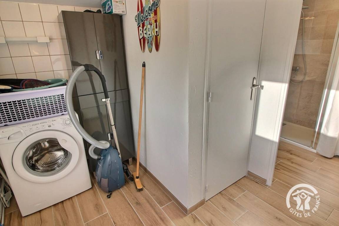 • Zugang über zwei Abstiegsstufen zu einer Waschküche, einer separaten Toilette und einem Badezimmer mit Dusche