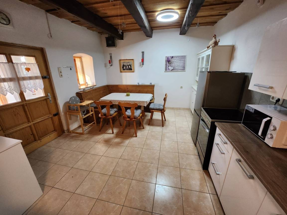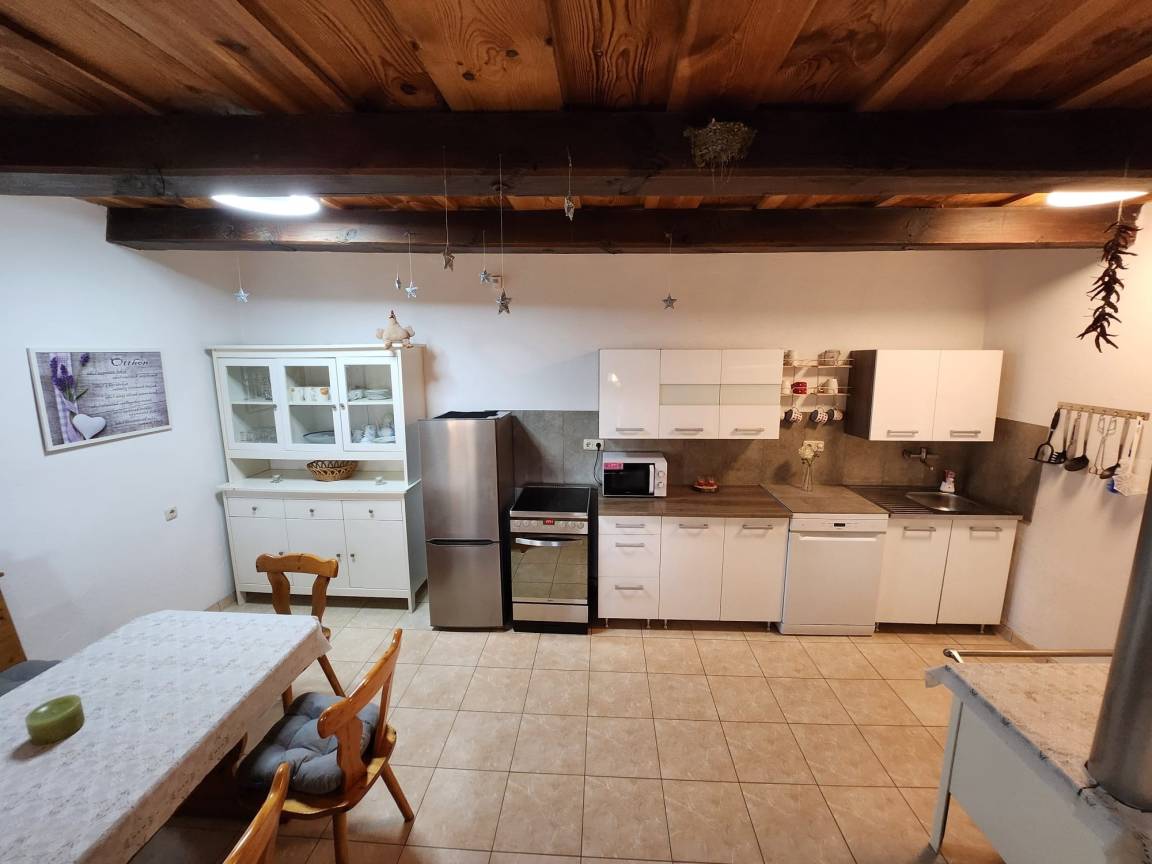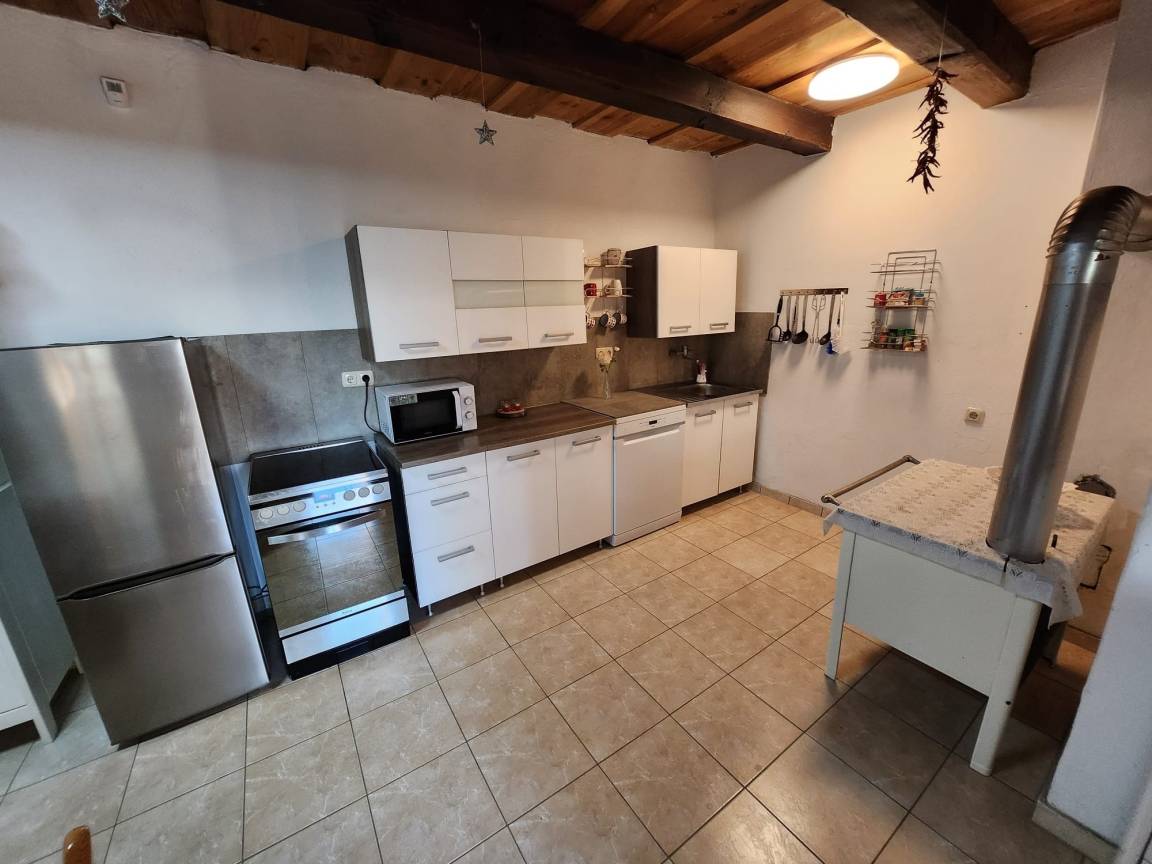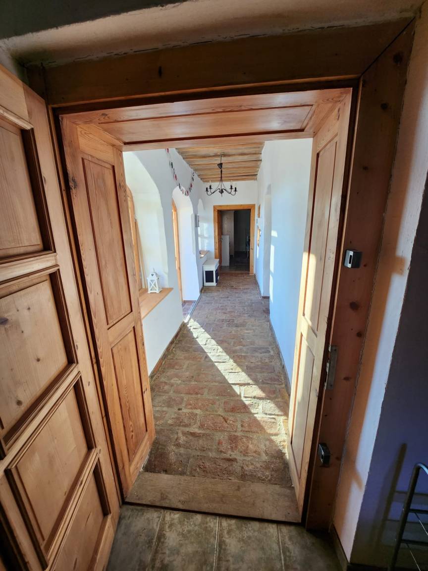 Das Einfahrtstor kann per Fernbedienung gesteuert werden. Ein kleiner Spielplatz befindet sich unmittelbar neben dem Haus. Die Hauptstrasse ist in Sichtweite, aber nicht so nah das die Geräusche stören würden. Im Haupthaus erreichen Sie über einen malerischen Gang alle Zimmer. Das mittlere Zimmer ist die Küche mit einem alten Brotbackofen. Jeweils rechts und links gibt es ein großes Zimmer zum Wohnen und Schlafen mit direkt angrenzenden Badezimmern. Im rechten Raum schließt neben dem Bad auch ein kleines Kinderzimmer mit einem Stockbett an. Alle Räume im Haupthaus haben wunderschöne alte Holzdecken. Das Appartment hat einen eigenen Eingang, ein Bad und eine Küchenzeile. Bestens geeignet wenn mehrere Generationen zusammen Urlaub machen.