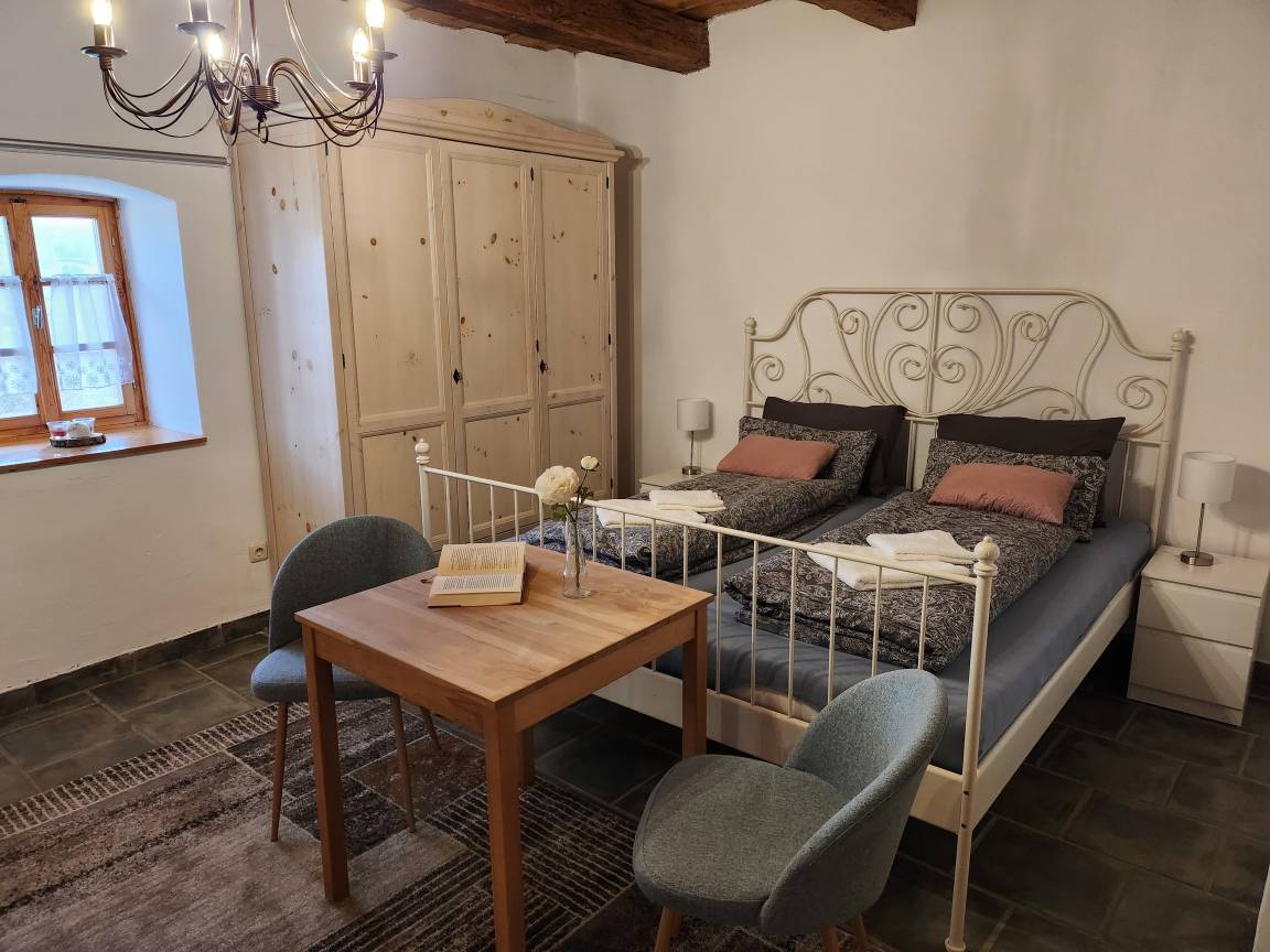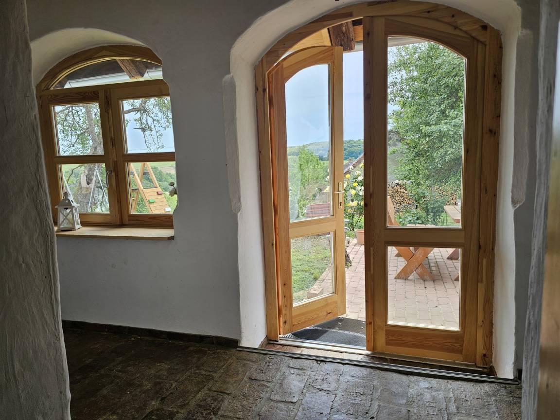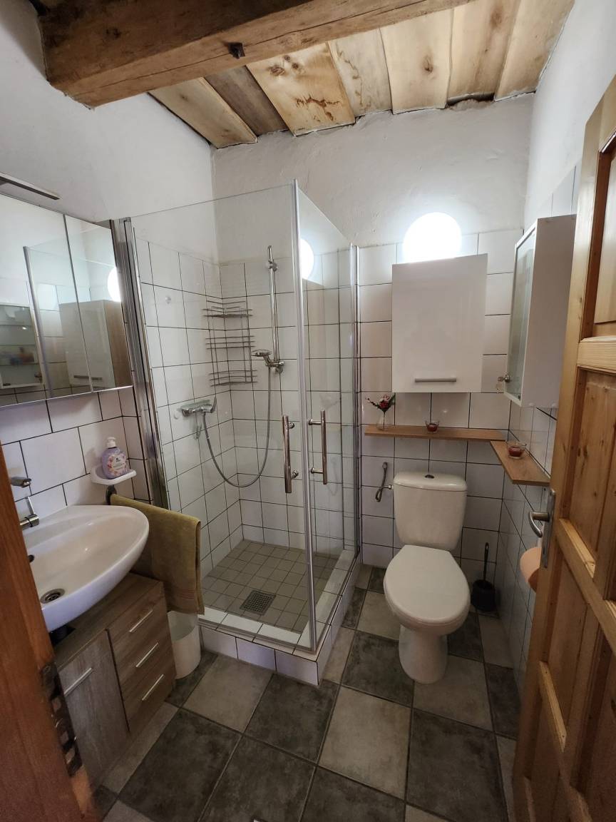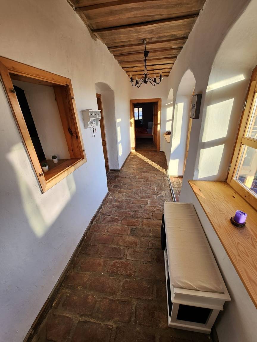 Das Einfahrtstor kann per Fernbedienung gesteuert werden. Ein kleiner Spielplatz befindet sich unmittelbar neben dem Haus. Die Hauptstrasse ist in Sichtweite, aber nicht so nah das die Geräusche stören würden. Im Haupthaus erreichen Sie über einen malerischen Gang alle Zimmer. Das mittlere Zimmer ist die Küche mit einem alten Brotbackofen. Jeweils rechts und links gibt es ein großes Zimmer zum Wohnen und Schlafen mit direkt angrenzenden Badezimmern. Im rechten Raum schließt neben dem Bad auch ein kleines Kinderzimmer mit einem Stockbett an. Alle Räume im Haupthaus haben wunderschöne alte Holzdecken. Das Appartment hat einen eigenen Eingang, ein Bad und eine Küchenzeile. Bestens geeignet wenn mehrere Generationen zusammen Urlaub machen.