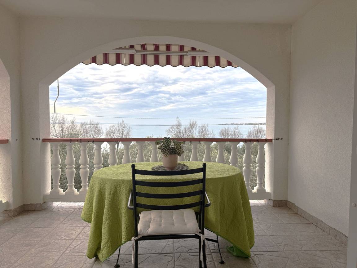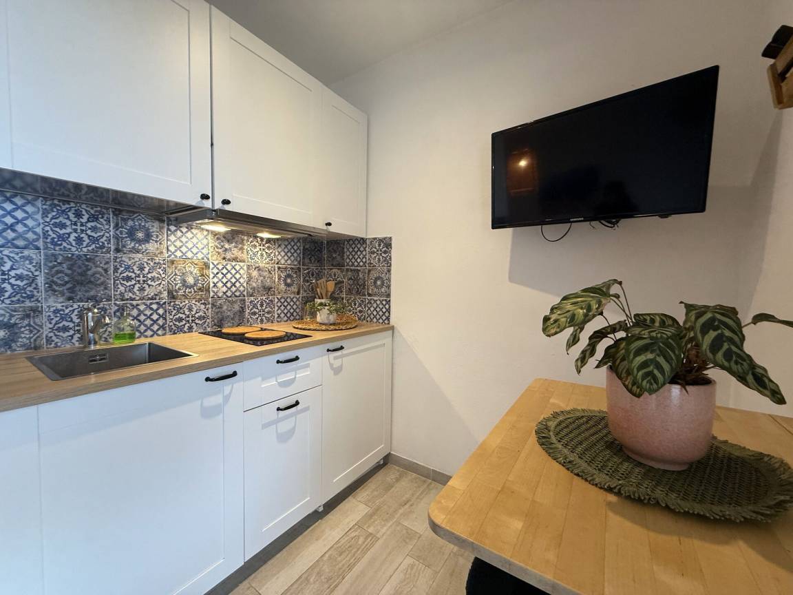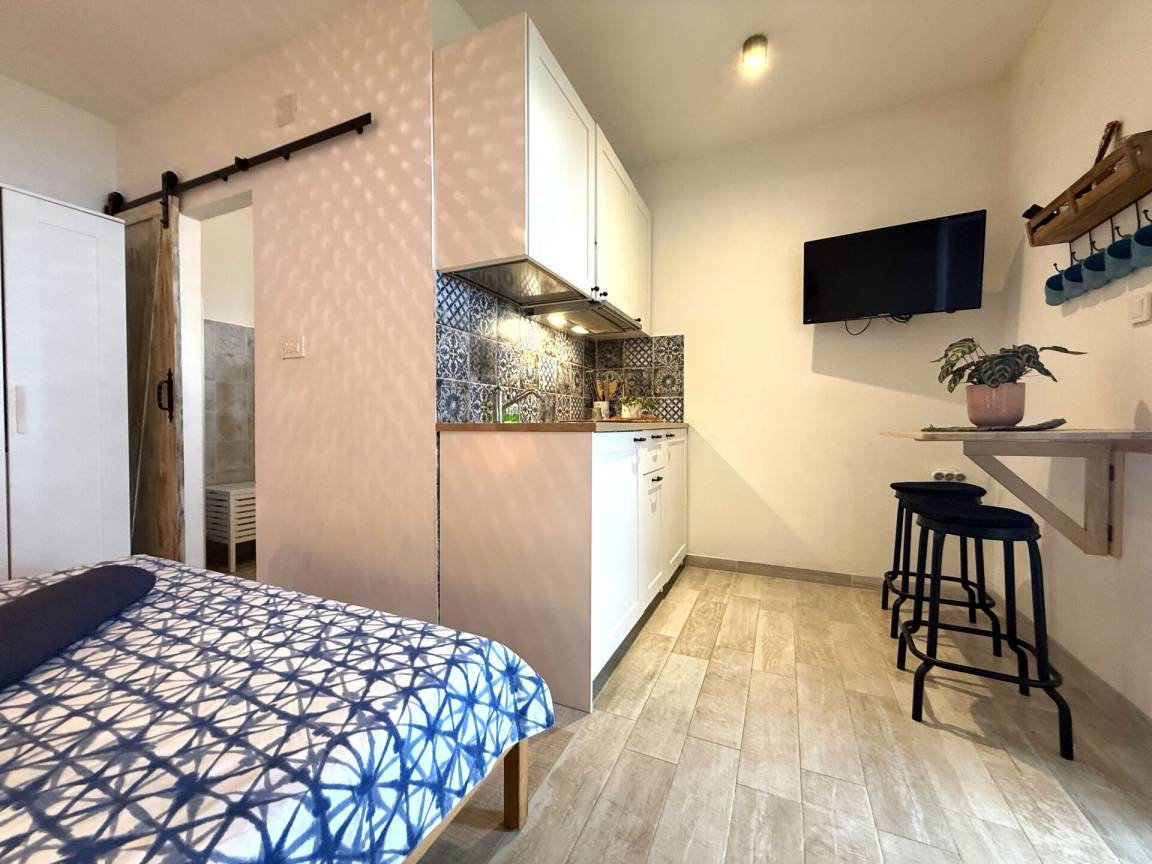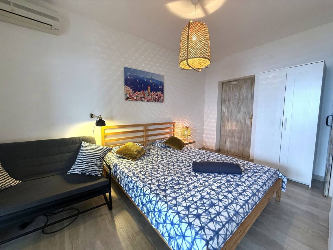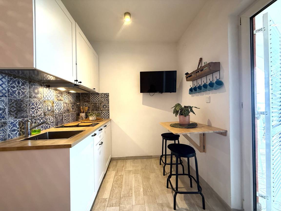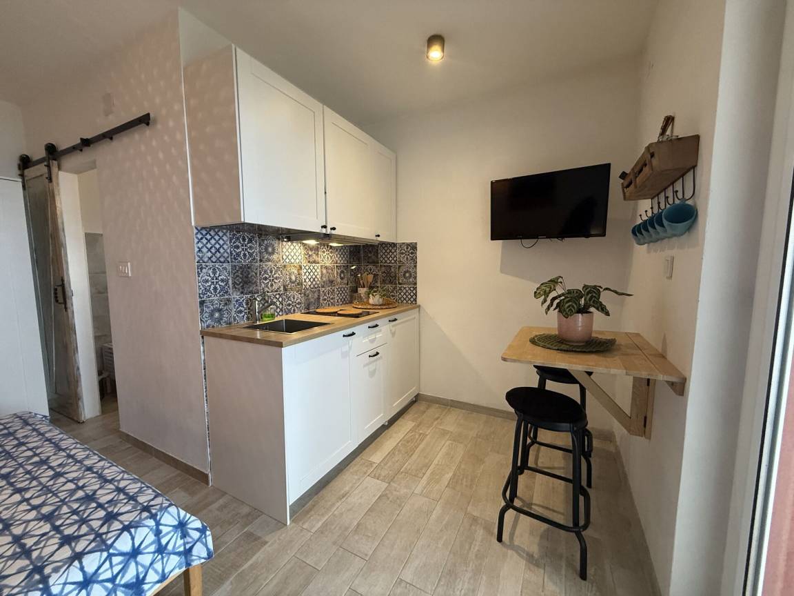 Wohnküche: gut ausgestattete Küche, Esstisch, Kühlschrank, Tiefkühler, Sofa, Doppelbett, WiFi Internet, Klimaanlage, TV, Ausgang auf den Balkon.