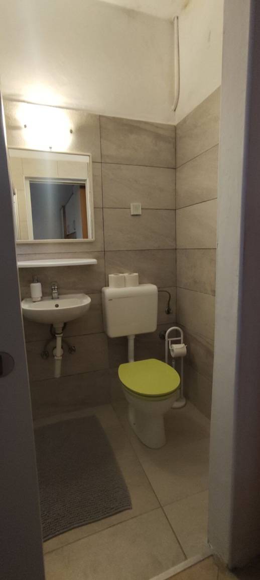 Badezimmer: Waschbecken, WC, Dusche, Fön, WiFi Internet.
