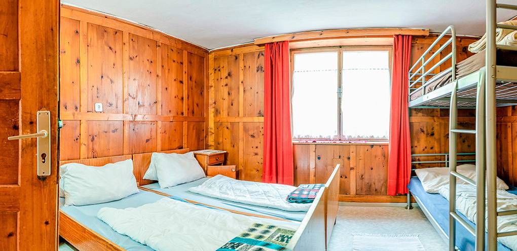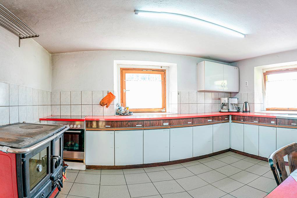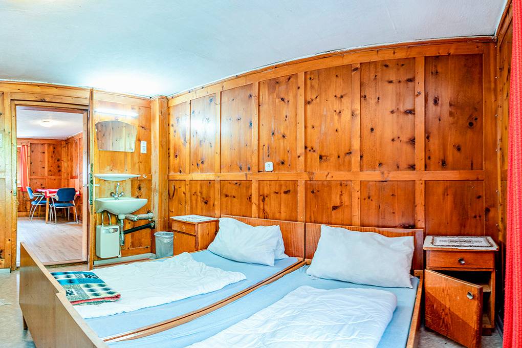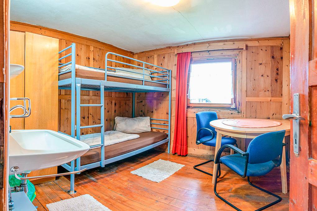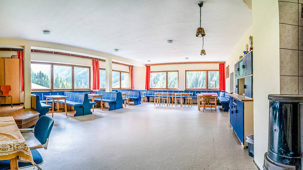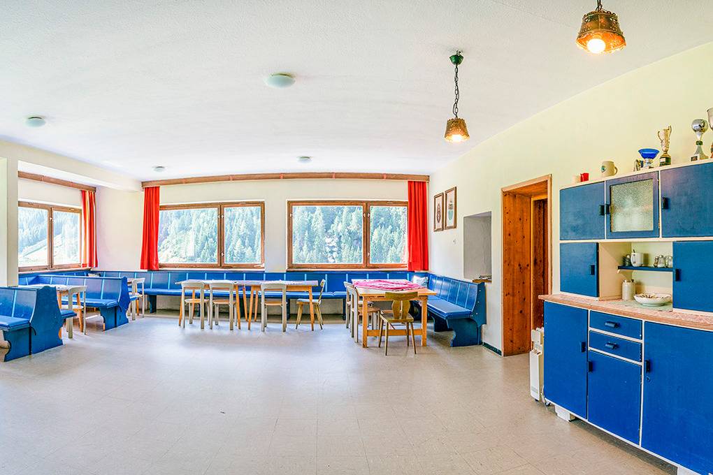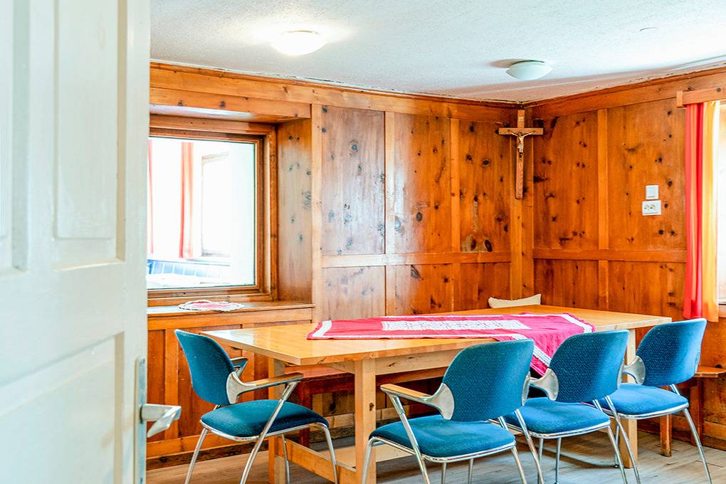 Parterre: Großer Aufenthaltsraum mit Esstischen, Panoramafenstern. Zweiter gemütlicher holzvertäfelter Aufenthaltsraum. Gruppenküche mit 4 Pl. E-Herd, Backofen, zusätzlichem Holzherd. Vorratsraum mit 2 Tiefkühlschränken à 80 l. 4-Bettzimmer mit Doppelbett, Etagenbett, Wb. Duschraum mit 2 Einzelduschen. Separate Dusche. Separates WC.
