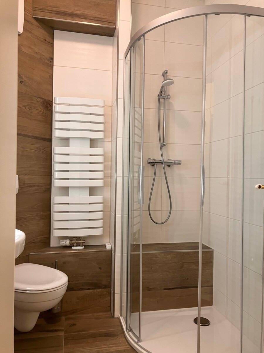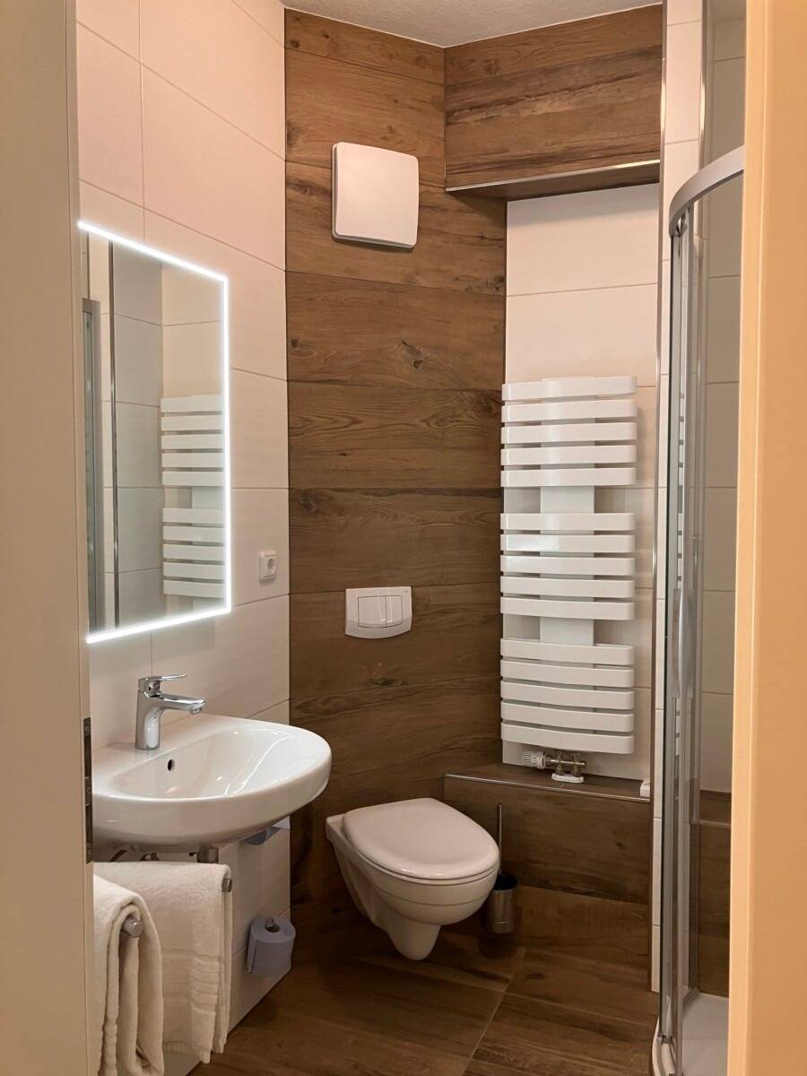 Bad mit Dusche, WC und Ablagemöglichkeiten
