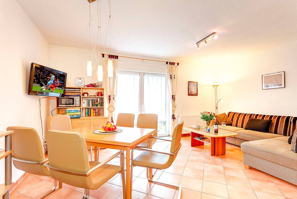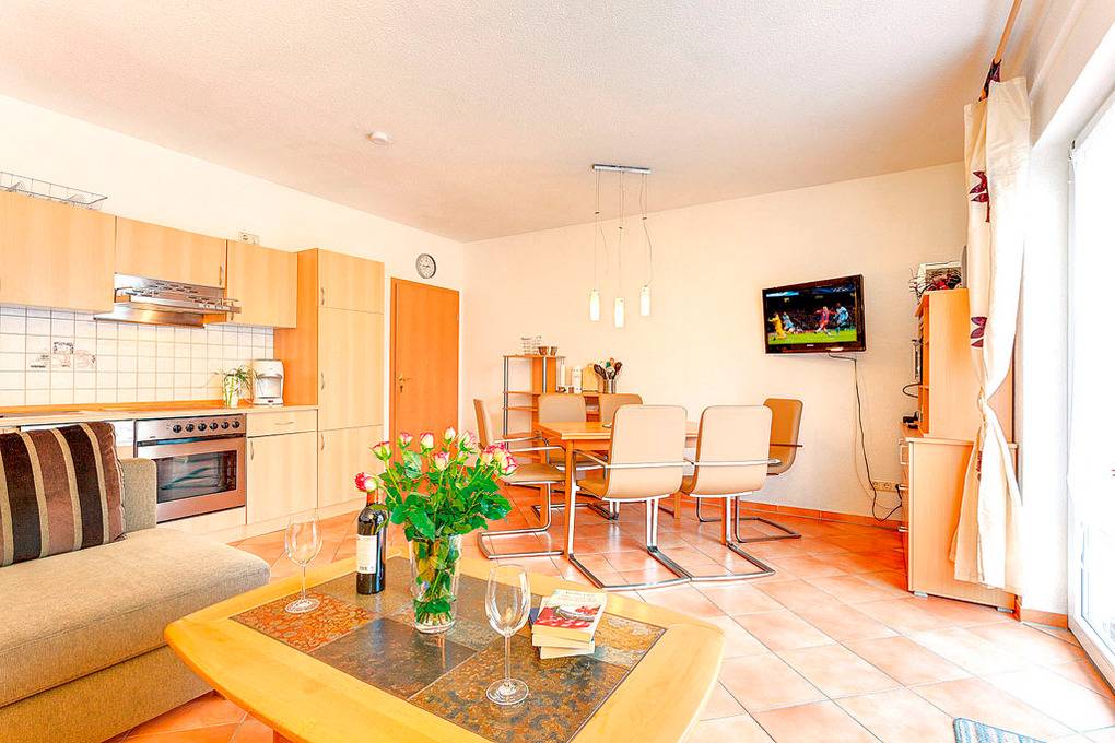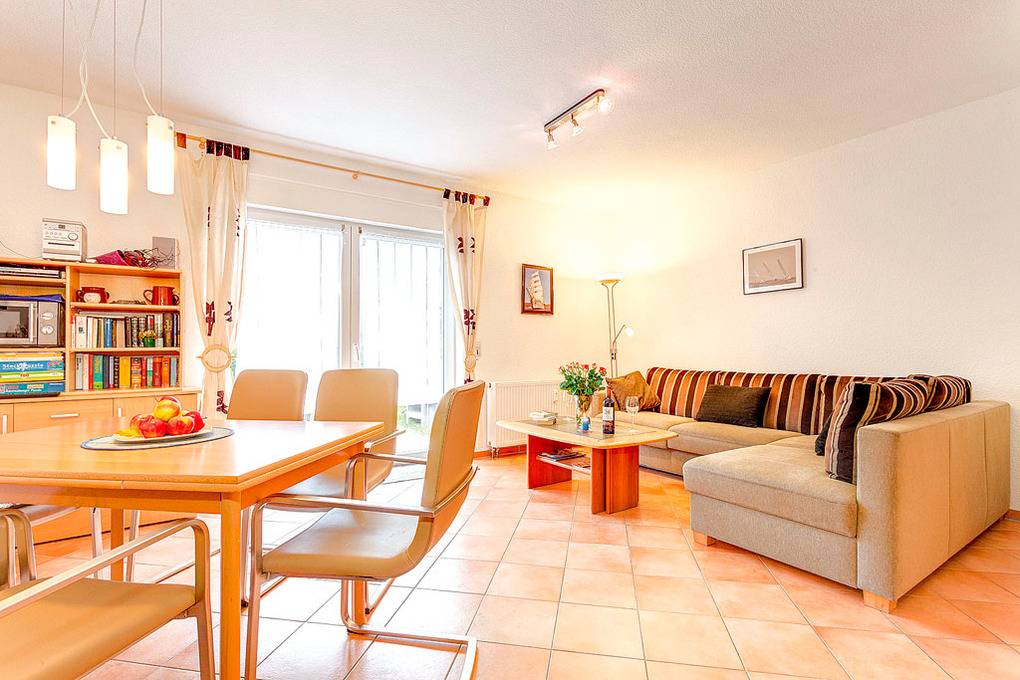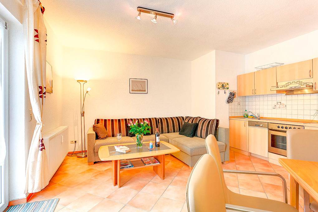 D 21.16 Ferienhaus 2-4 Pers.: 2-Zimmer-Reihenhaus mit 61 qm Wohnfläche, Parterre. Schöner Wohn-/Essraum mit Couchgarnitur, Sat-TV, DVD, Radio/CD, Esstisch, Küchenzeile (Backofen, Mikrowelle). 4-Bettzimmer mit Doppelbett, 2 Einzelbetten. Bad/WC.