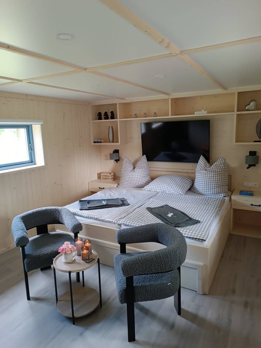 Das Tiny House ist komplett neu und bietet alles für einen komfortablen Aufenthalt. Mit Kaminofen und Infrarotheizung sorgt es für wohlige Wärme. Die Einrichtung ist stilvoll und durchdacht. Ein Highlight sind die Betten. Alpakabetten sind bequem, hypoallergen und temperaturregulierend. Das Doppelbett kann für einen dritten Schlafplatz ausgezogen werden. Lernen Sie unsere Alpakas kennen und erfahren Sie mehr über diese faszinierenden Tiere. Auch eine Alpakawanderung zur Entschleunigung vom Alltag kann gebucht werden. Abends lädt die Terrasse zum Verweilen ein. Genießen Sie ein Glas Wein unter dem Sternenhimmel und lassen Sie den Tag bei einem Buch ausklingen. Grillmöglichkeiten sind vorhanden.