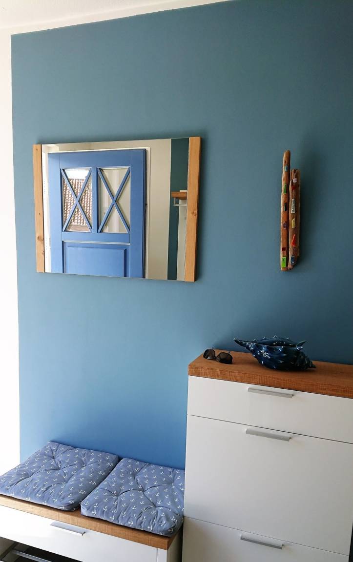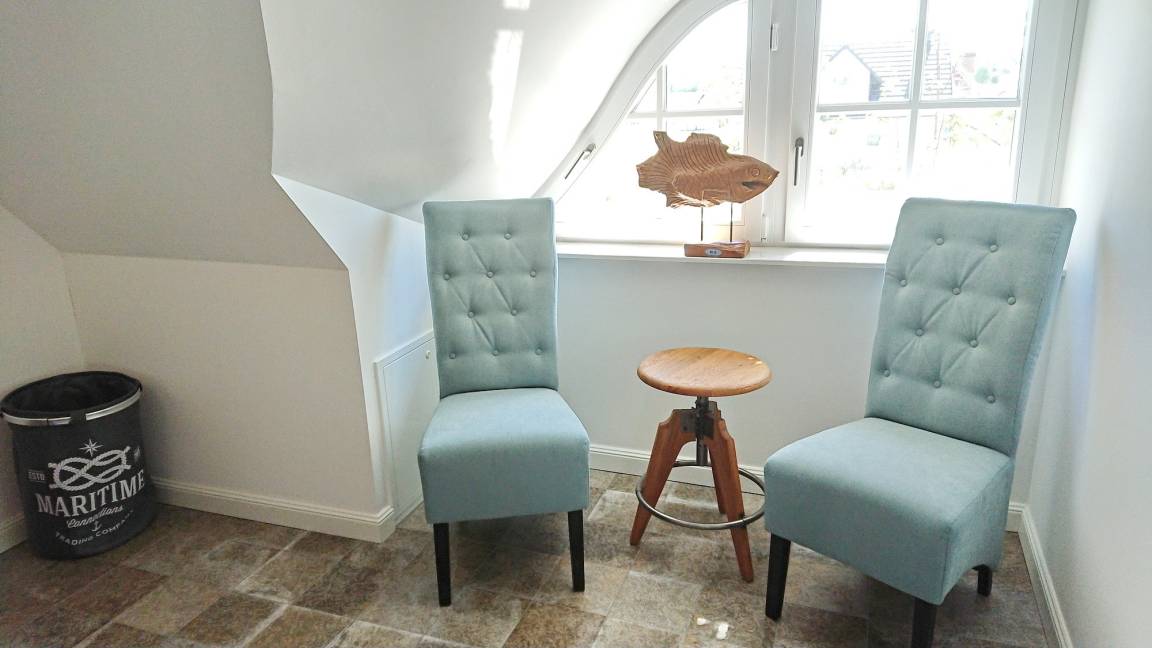 Im Erdgeschoss erwartet Sie das helle und geräumige Wohnzimmer. Es bildet eines von mehreren kommunikativen Oasen des Captains Hus. Es geht über in das gemütliche Esszimmer mit einem großen Esstisch (180x90). Dieser lädt Sie zum kulinarischen Genießen oder zum Spielen ein. Der drehbare norwegische Kaminofen bietet Ihnen bei kalter Witterung wohltuende Wärme und Wellness für die Seele. Die Küche im Erdgeschoss ist separat und sehr modern und komfortabel eingerichtet. Eine Waschmaschine, Mikrowelle, Geschirrspüler und viele weitere Extras sind hier integriert. Ein kleiner Tisch mit zwei Barhockern verführt Sie zum gemeinsamen Kochen bei einem guten Glas Wein und guten Gesprächen. Das helle Gäste-WC mit Tageslicht rundet das Erdgeschoss ab. Im Obergeschoss sind zwei Schlafzimmer und ein Duschbad farblich abgestimmt. Im ersten Schlafraum finden Sie ein Boxspringbett (200x180) und im zweiten zwei Einzelbetten (je 200x90). Beide Schlafräume bieten Ihnen viel Stauraum und Rückszugmöglichkeiten wie zum Beispiel eine alte Schulbank im zweiten Schlafraum.