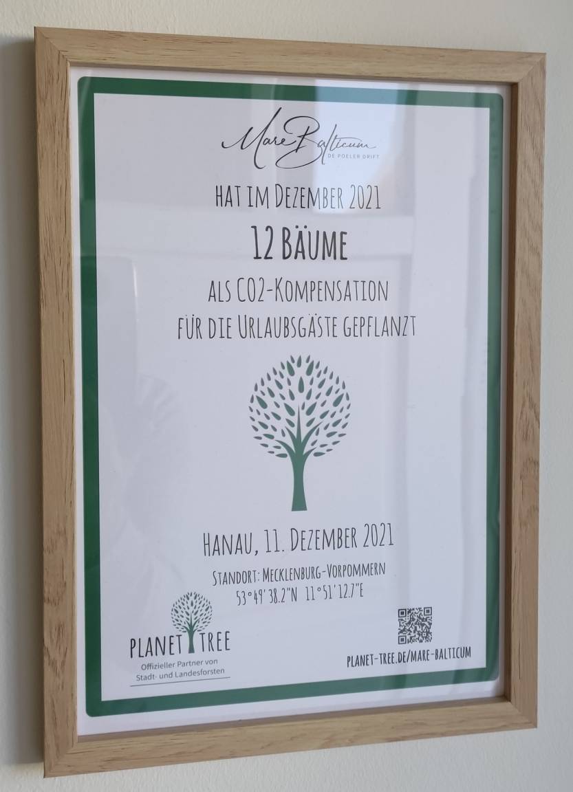 CO² neutralen Urlaub, durch die Unterstützung der Aufforstung in MV. Ausschließliche Nutzung von Strom aus erneuerbaren Quellen / Ökostrom.
