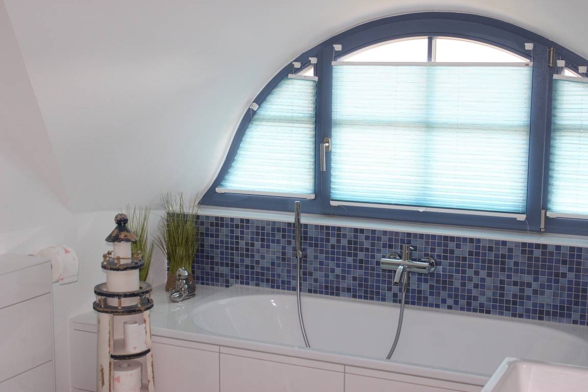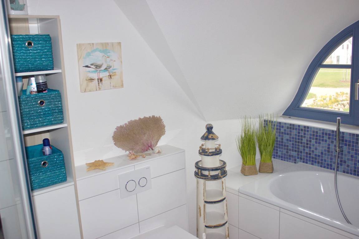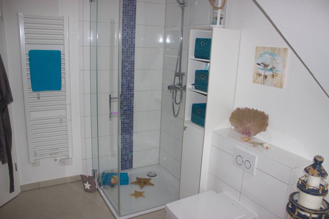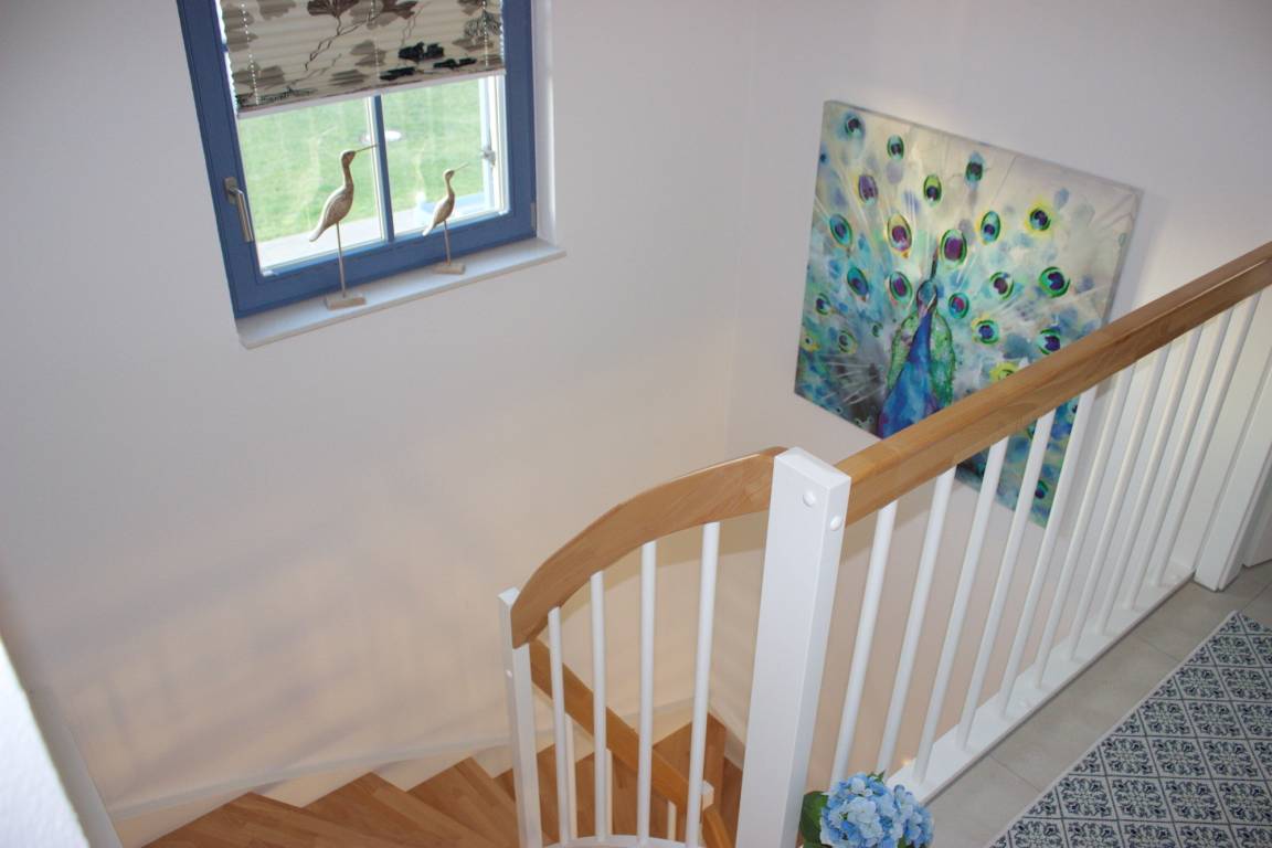 Im Obergeschoss des Ferienhauses befinden sich die drei Schlafzimmer und das Vollbad mit Badewanne und Dusche.