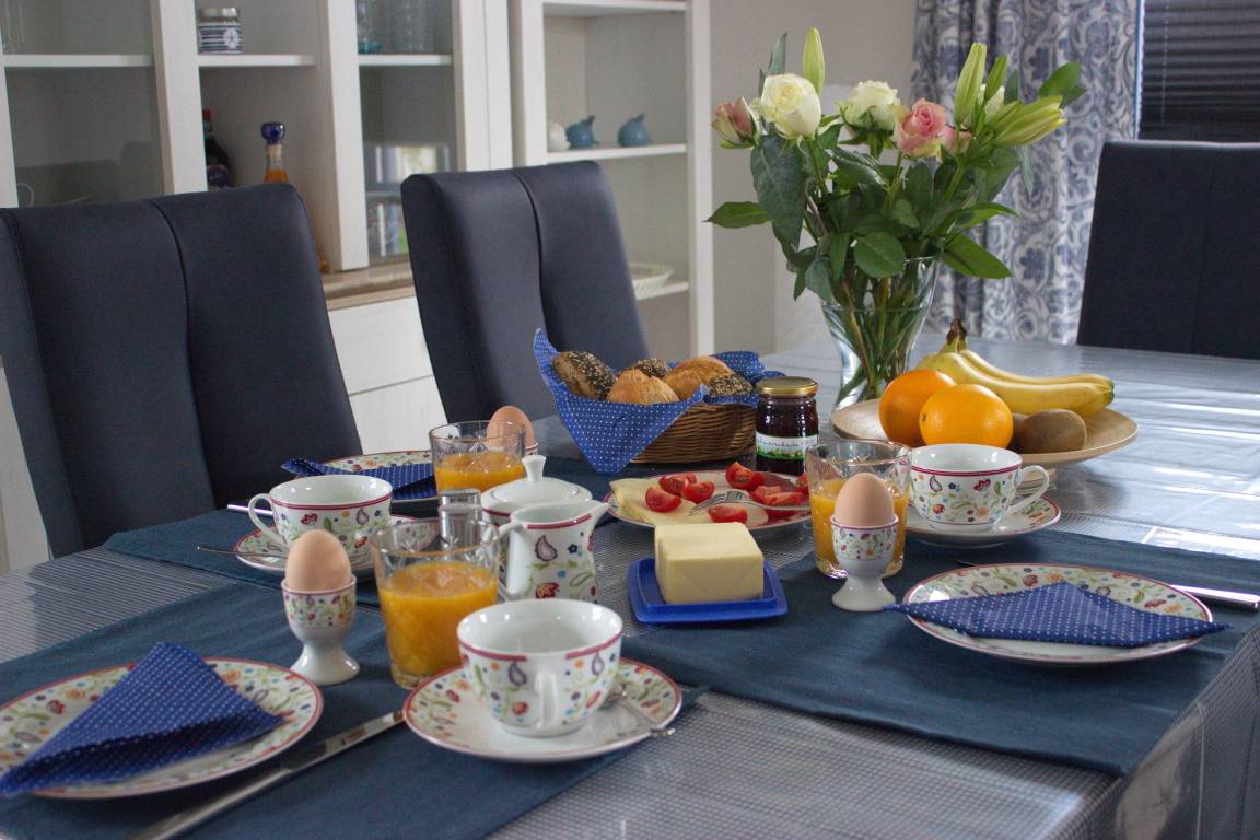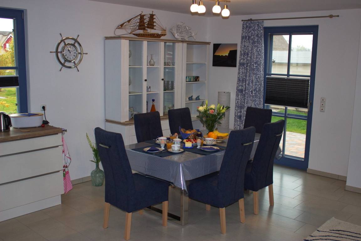 Am Esstisch haben bis zu 6 Personen Platz zum Speisen. Ein Kinderhochstuhl für die Kleinen steht bereit.