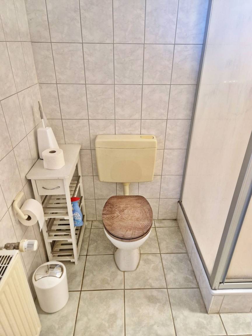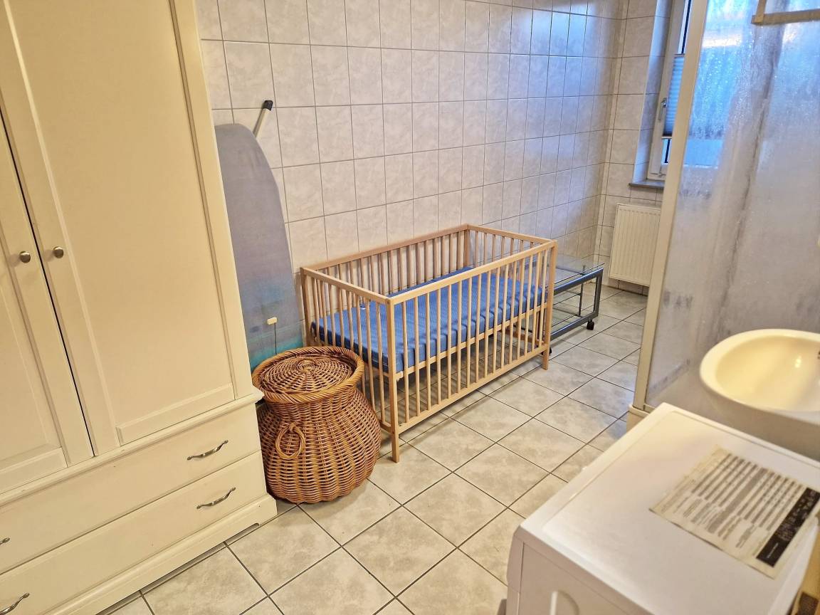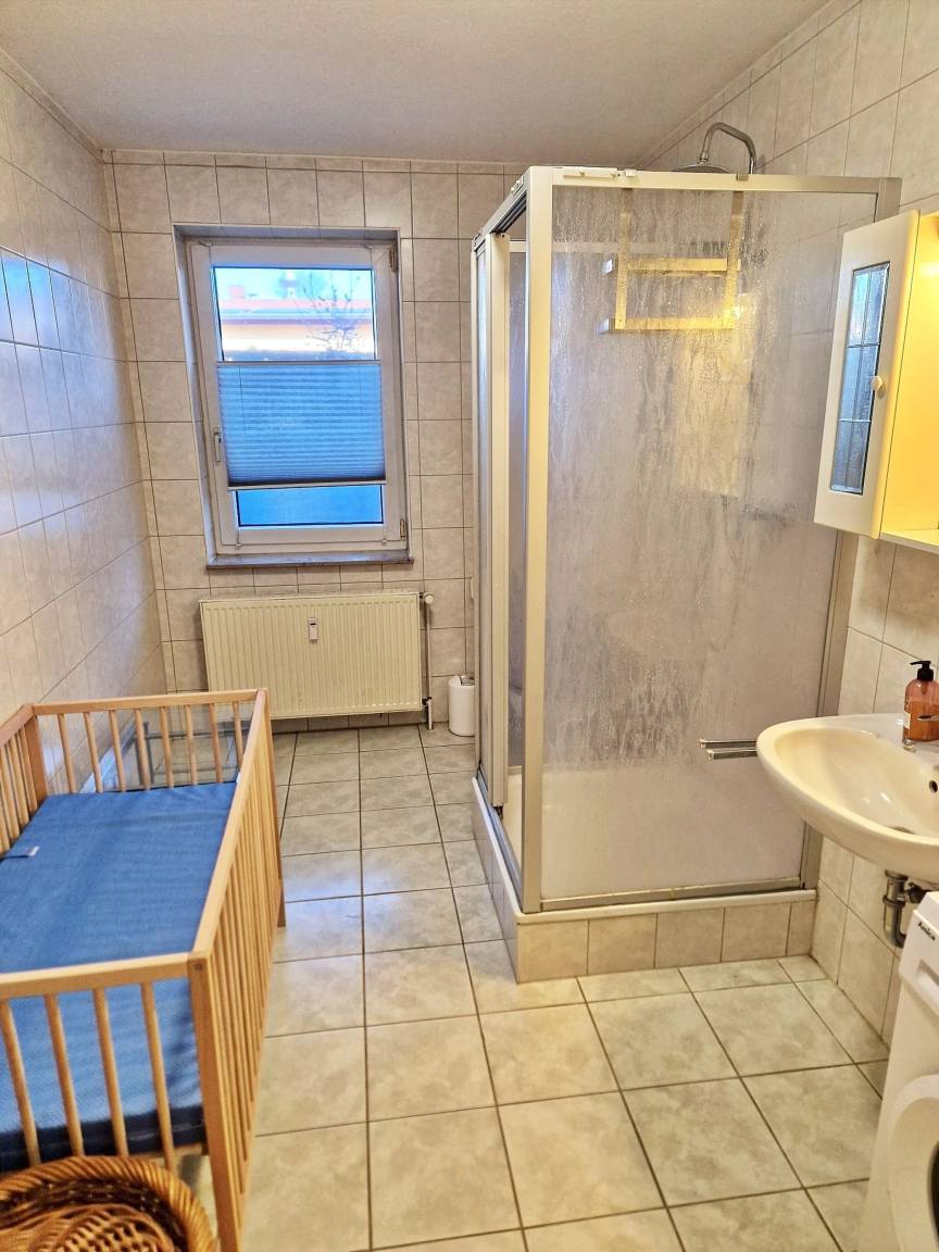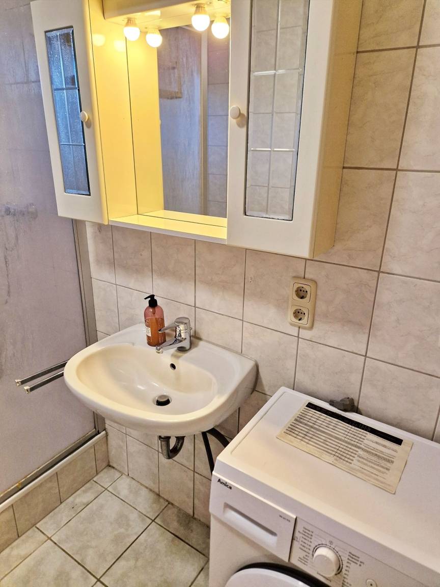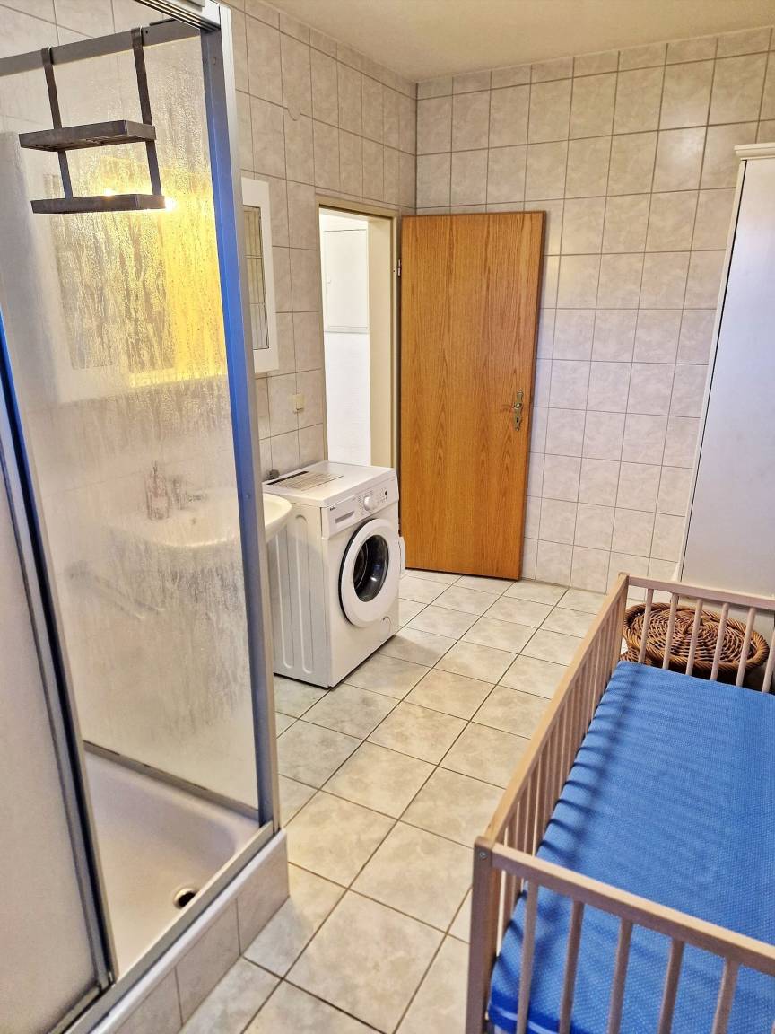 - Duschbad mit Dusche, WC, Spiegel, Föhn, Waschmaschine, Wäscheständer, Bügelbrett, Bügeleisen