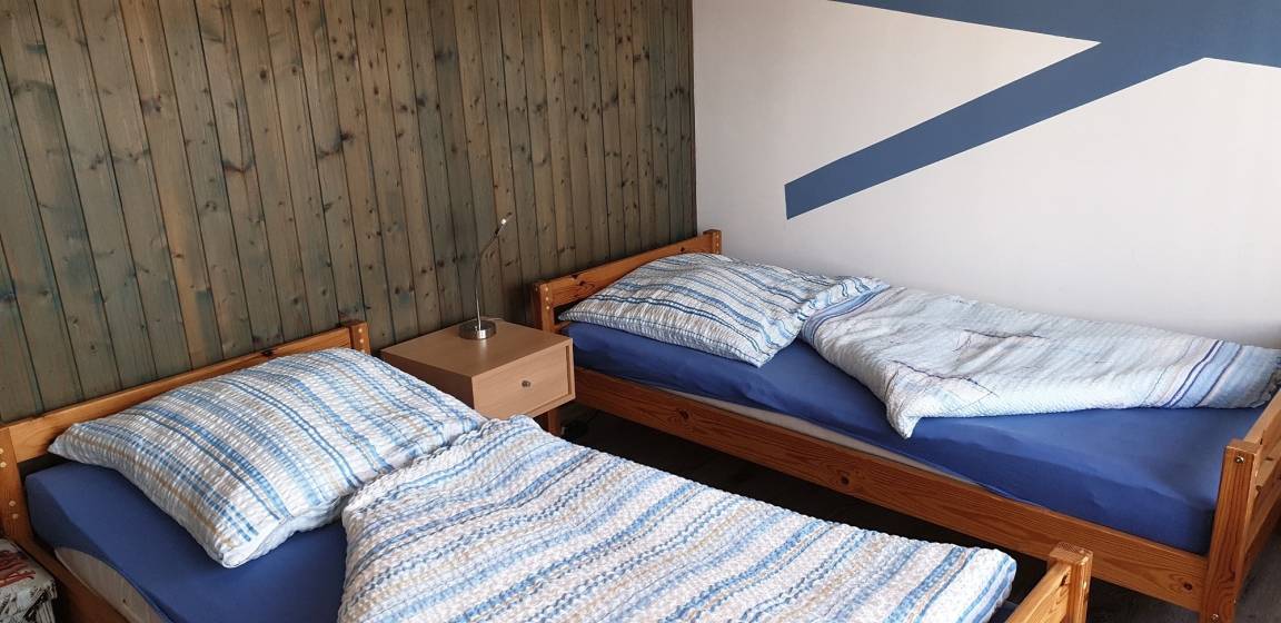Das 2. Schlafzimmer im Obergeschoss ist ebenfalls mit einem Doppelbett und einem zusätzlichen Einzelbett eingerichtet.