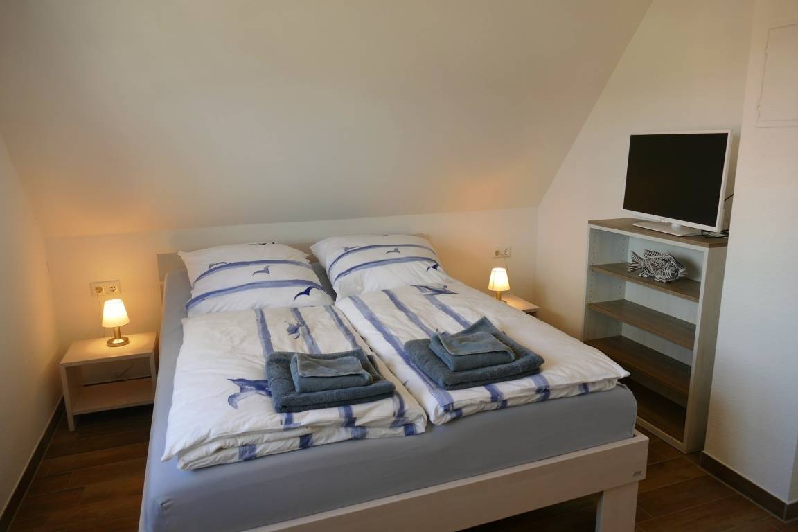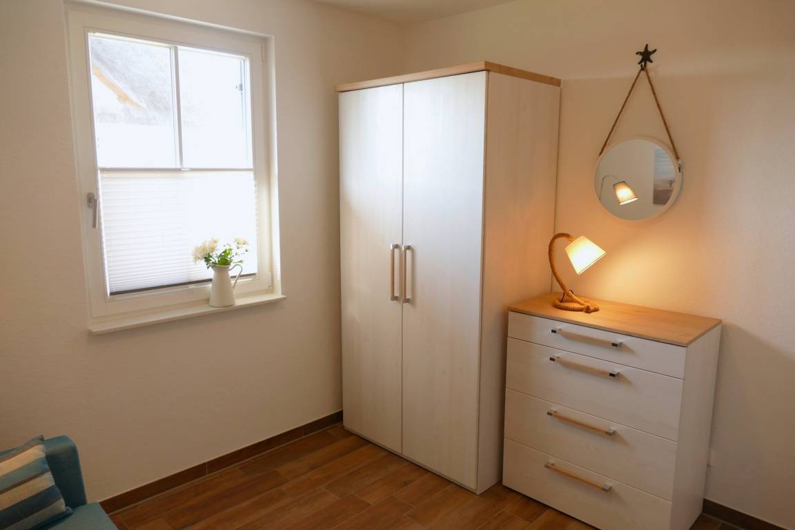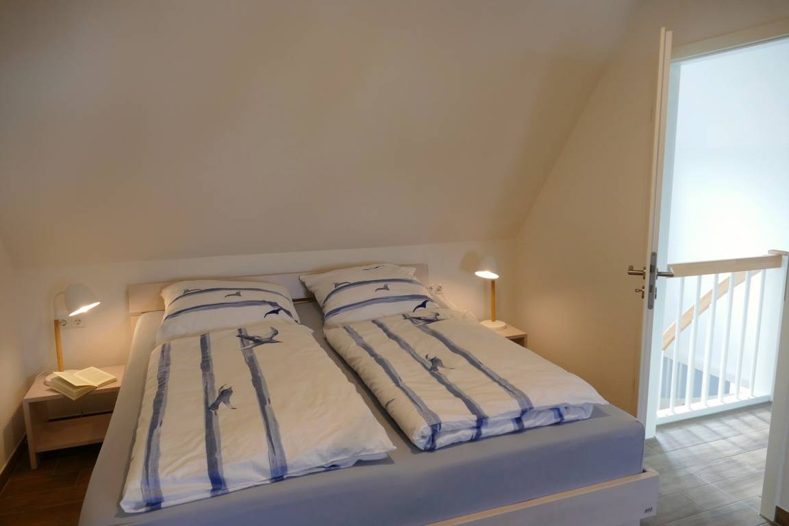 Im Obergeschoss des Reethauses befinden sich die beiden großen Schlafzimmer sowie das Badezimmer mit Regendusche. Beide Schlafzimmer sind mit bequemen Doppelbetten und viel Stauraum ausgestattet. In einem der Zimmer finden Sie den zweiten Fernseher sowie eine gemütliche Leseecke. Am Schreibtisch im anderen Schlafzimmer können Sie in der Ferne die Ostsee erblicken. Beide Schlafräume lassen sich verdunkeln und sind mit Insektenschutzgittern versehen.