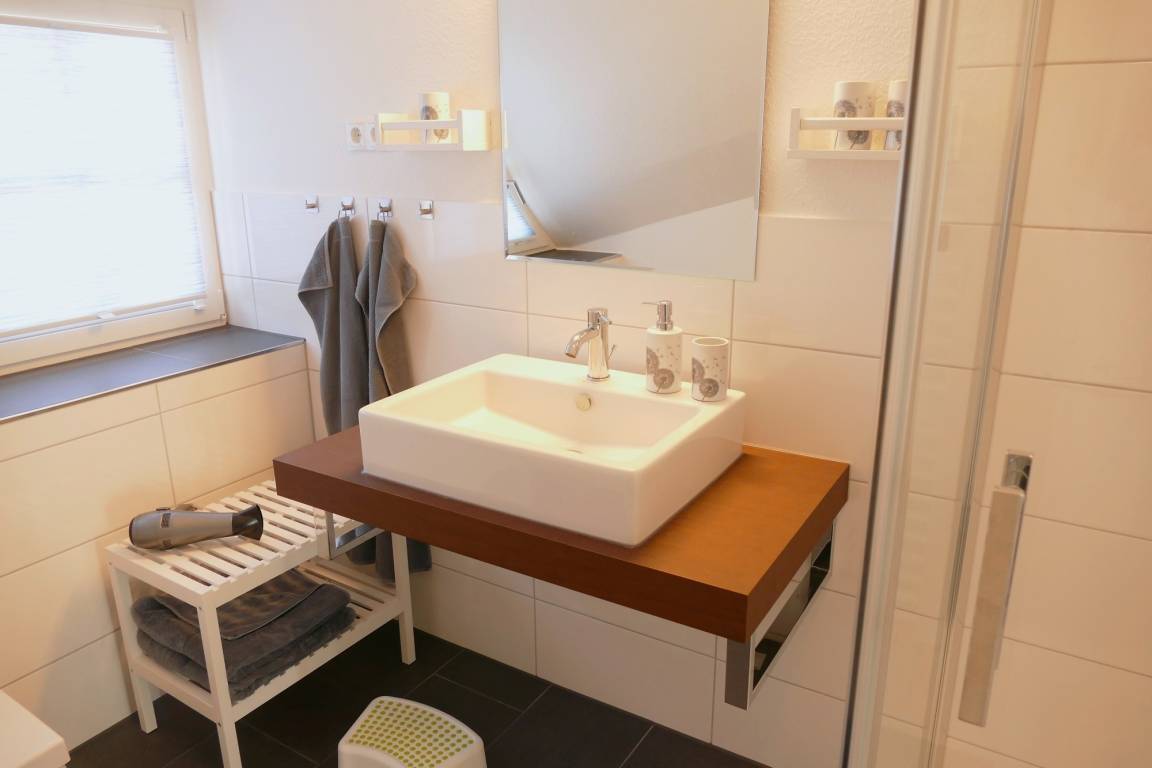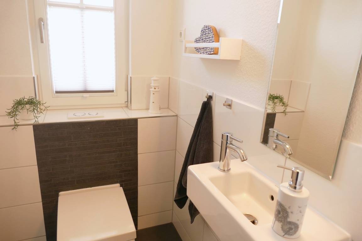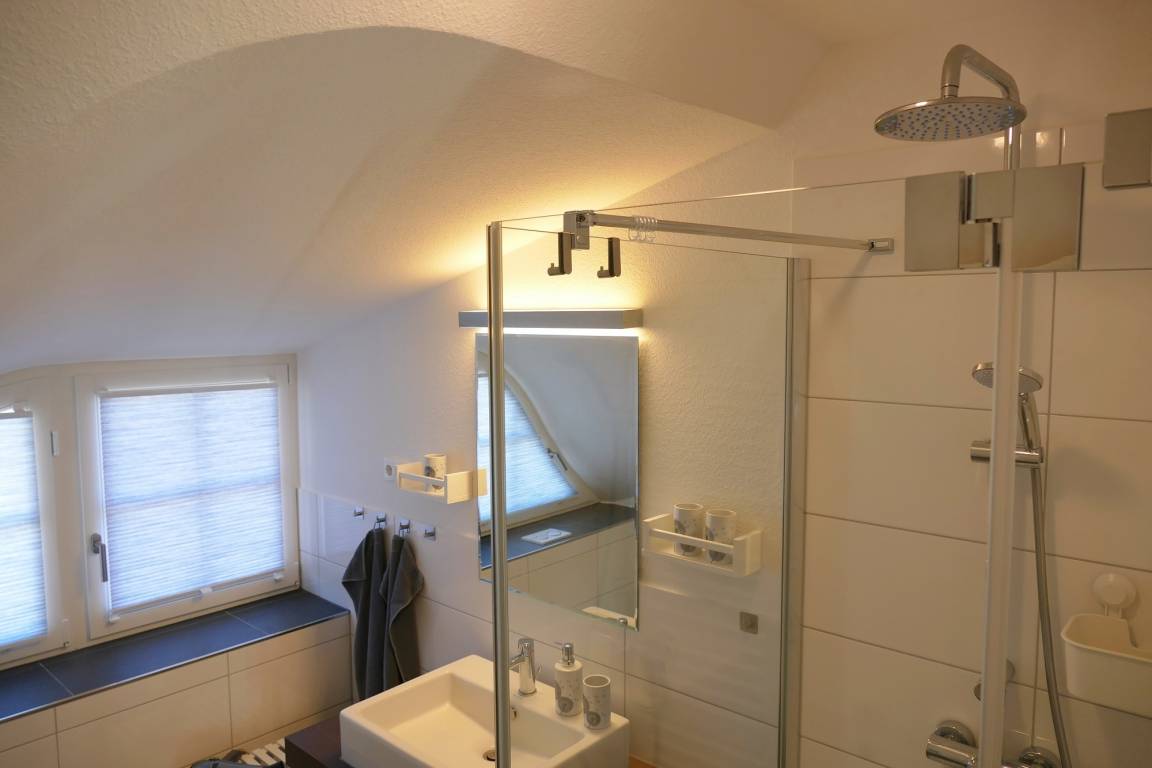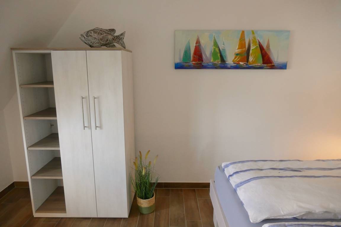 Im Obergeschoss des Reethauses befinden sich die beiden großen Schlafzimmer sowie das Badezimmer mit Regendusche. Beide Schlafzimmer sind mit bequemen Doppelbetten und viel Stauraum ausgestattet. In einem der Zimmer finden Sie den zweiten Fernseher sowie eine gemütliche Leseecke. Am Schreibtisch im anderen Schlafzimmer können Sie in der Ferne die Ostsee erblicken. Beide Schlafräume lassen sich verdunkeln und sind mit Insektenschutzgittern versehen.