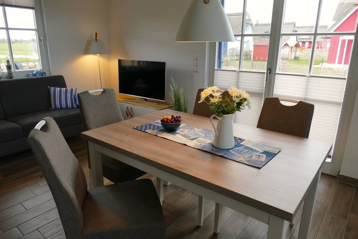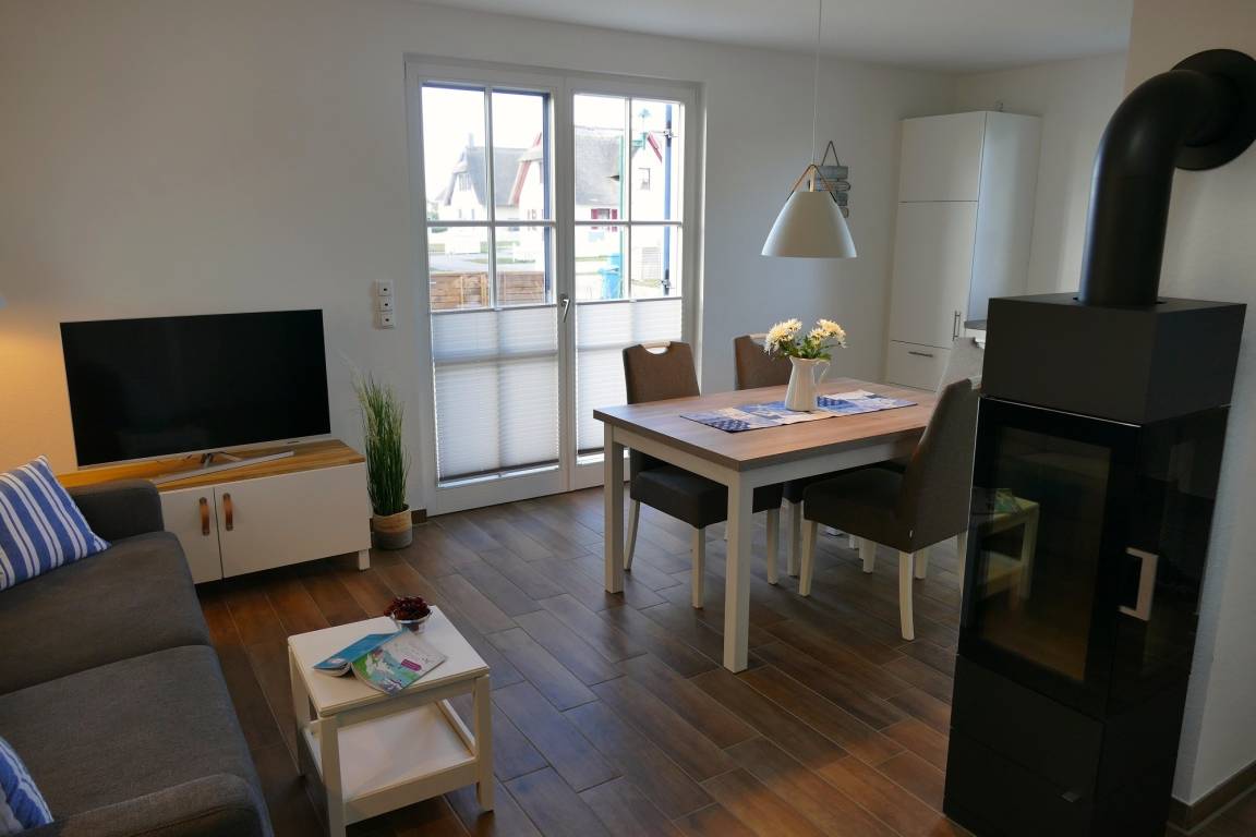 Der großzügige und lichtdurchflutete Wohn-Essbereich lädt Sie dazu ein, eine schöne Zeit miteinander zu verbringen. Die Küche ist integriert und sehr gut ausgestattet. Im Wohn-Essbereich finden Sie einen großen Esstisch, eine gemütliche Couchecke mit Kaminofen sowie einen modernen Fernseher. Von hier haben Sie einen direkten Zugang zur Terrasse.