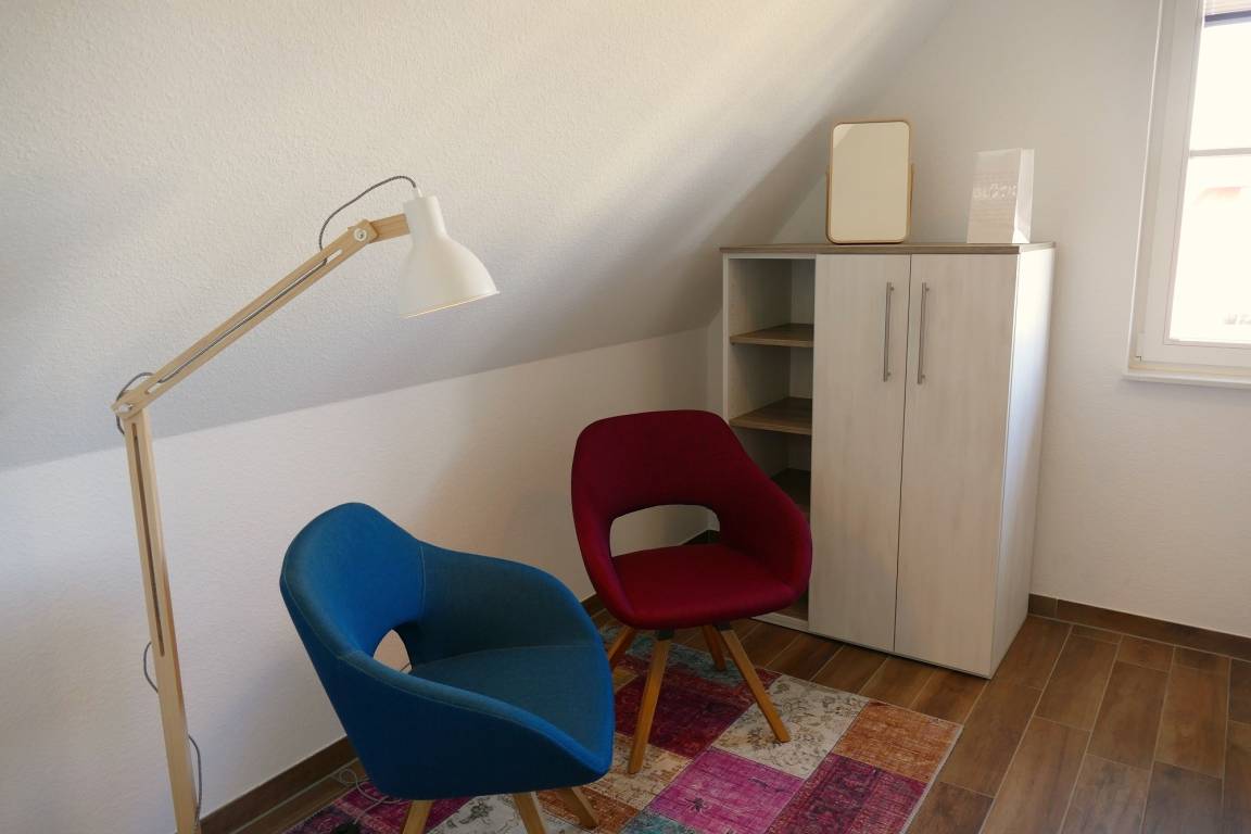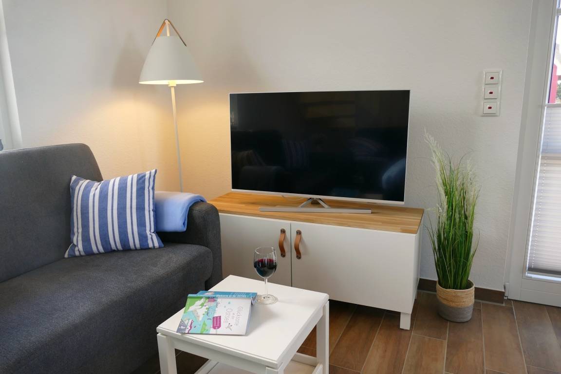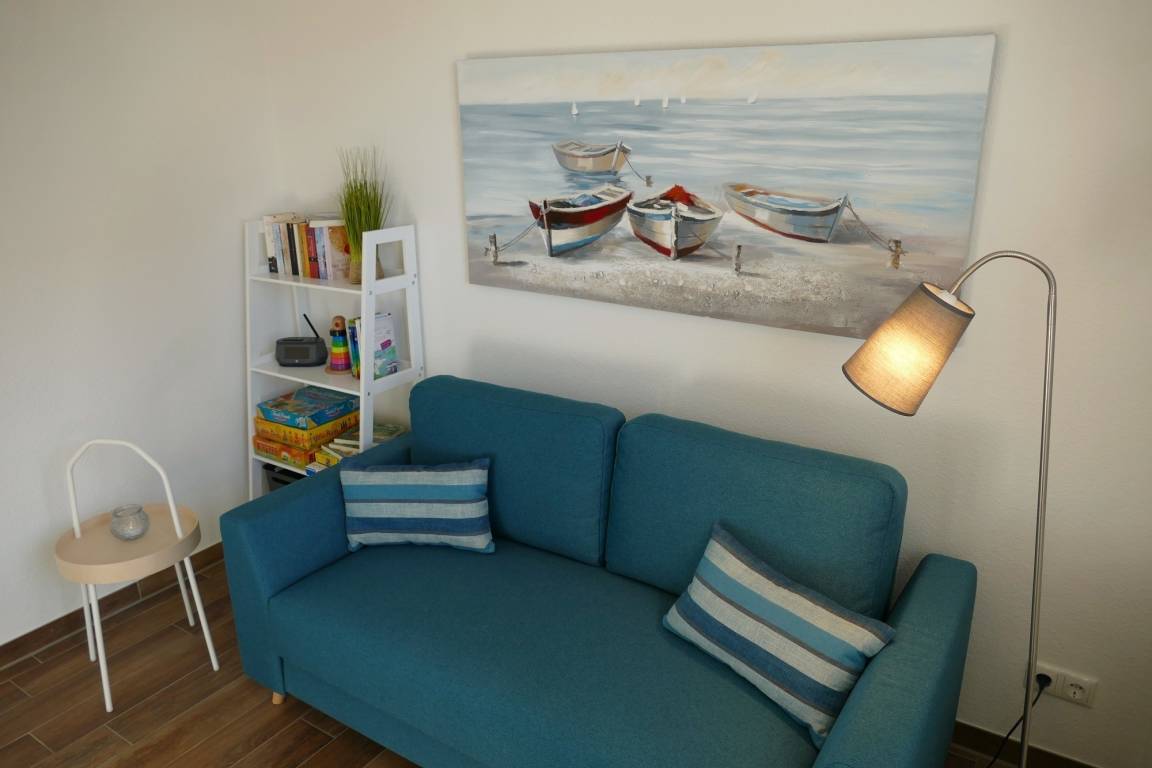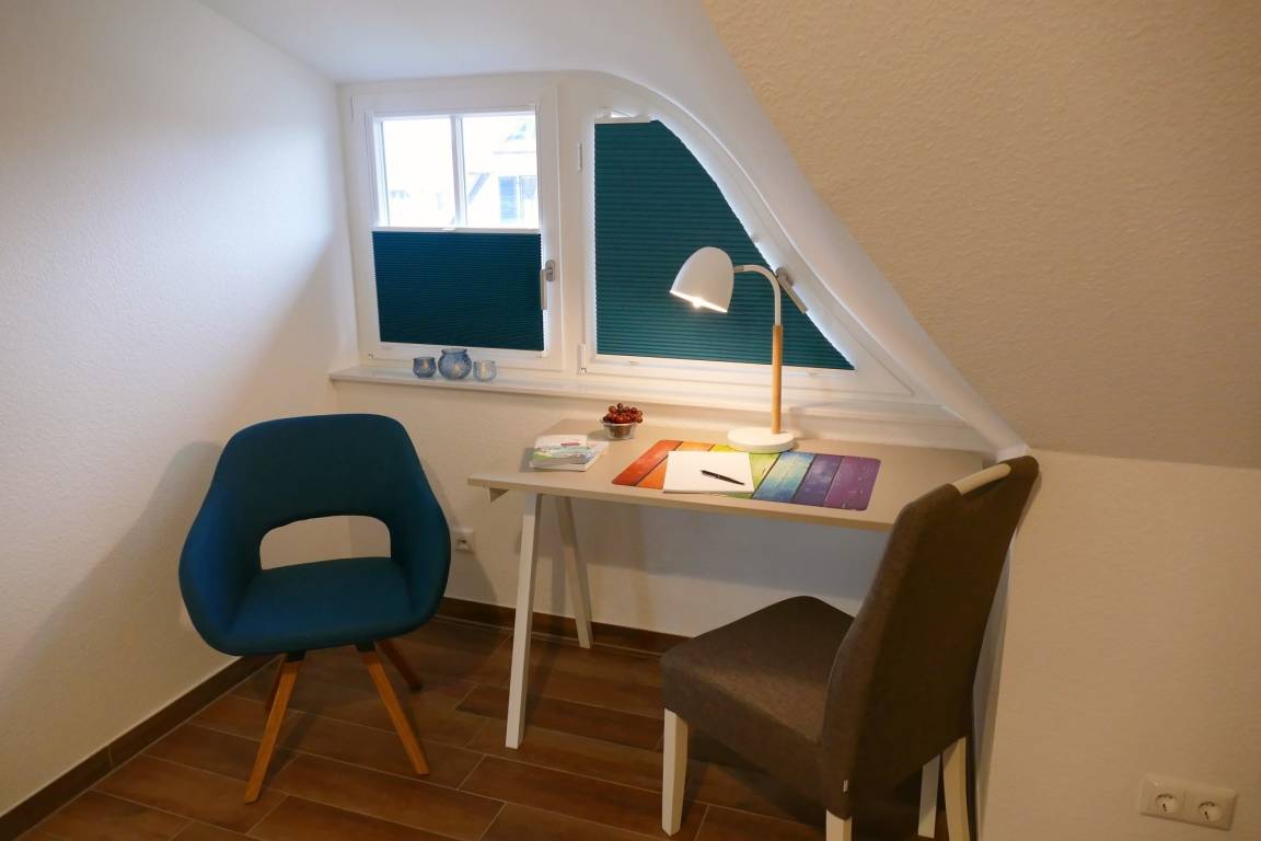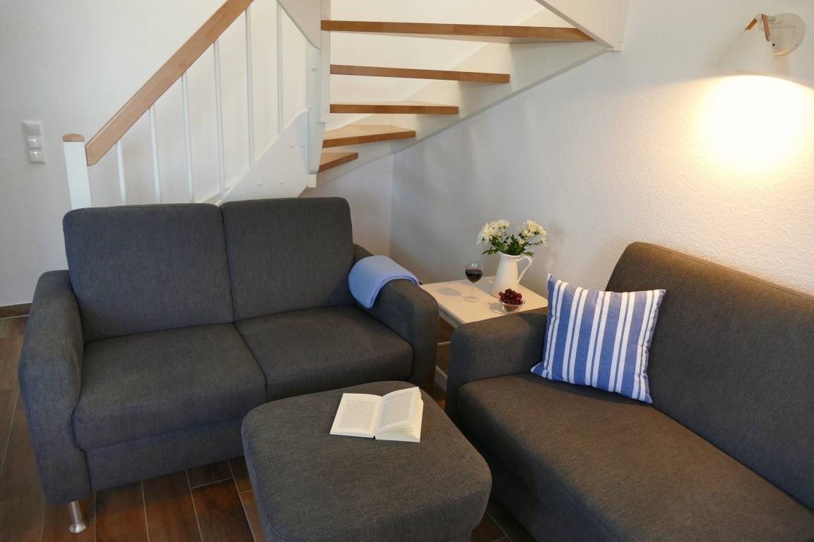 Das dritte Schlafzimmer befindet sich im Erdgeschoss. Es ist mit einem Schlafsofa mit Boxspringtechnologie ausgestattet. In diesem können ein Erwachsener oder zwei Kinder schlafen. Wird das Zimmer nicht als Schlafraum genutzt, so ist es ein gemütlicher zusätzlicher Rückzugsort mit einem kleinen Sofa, einigen Büchern und Spielen.