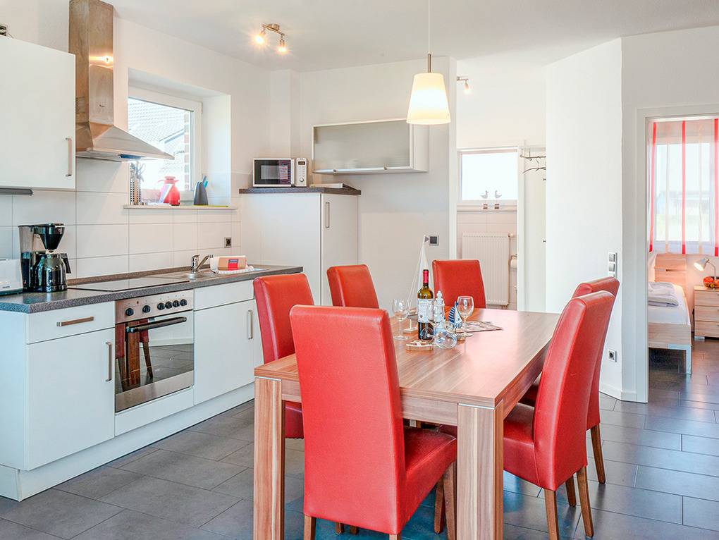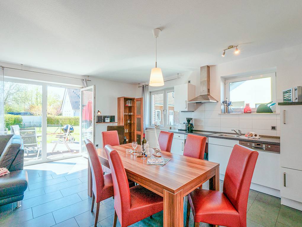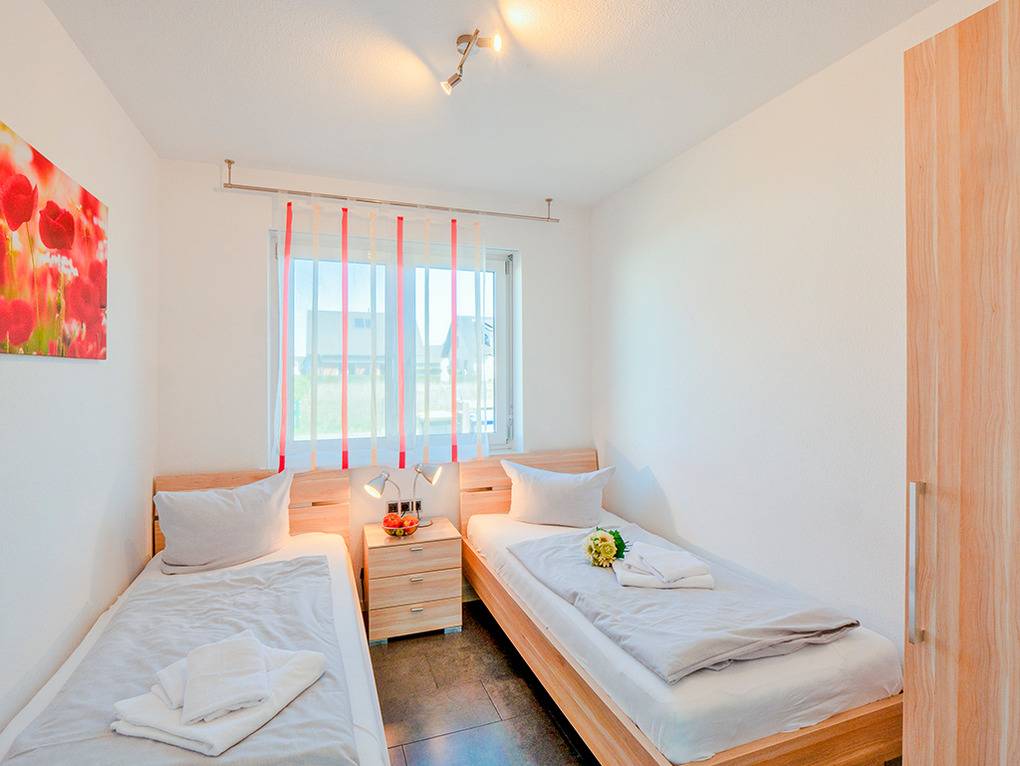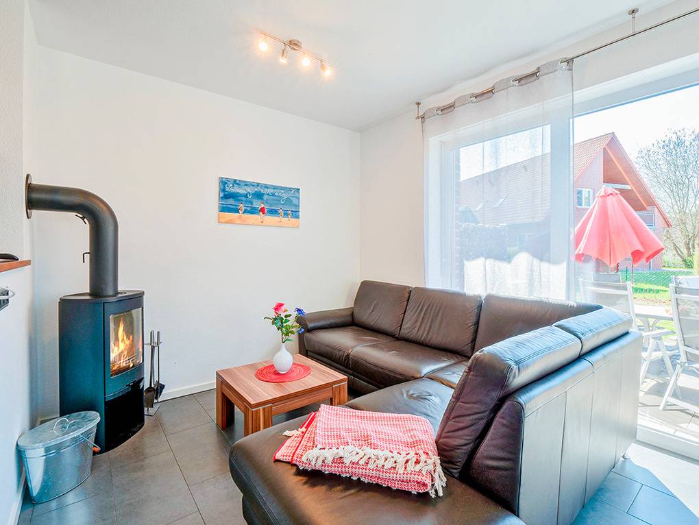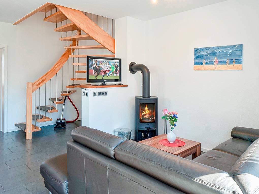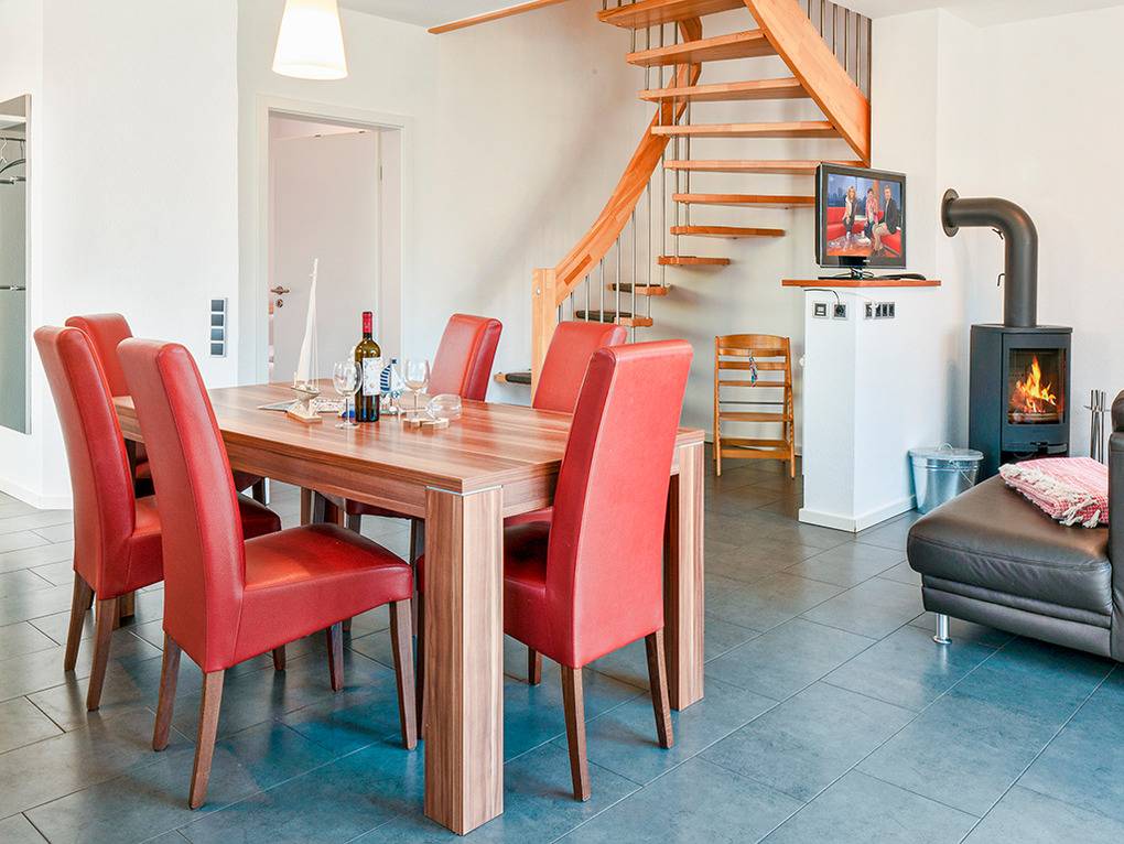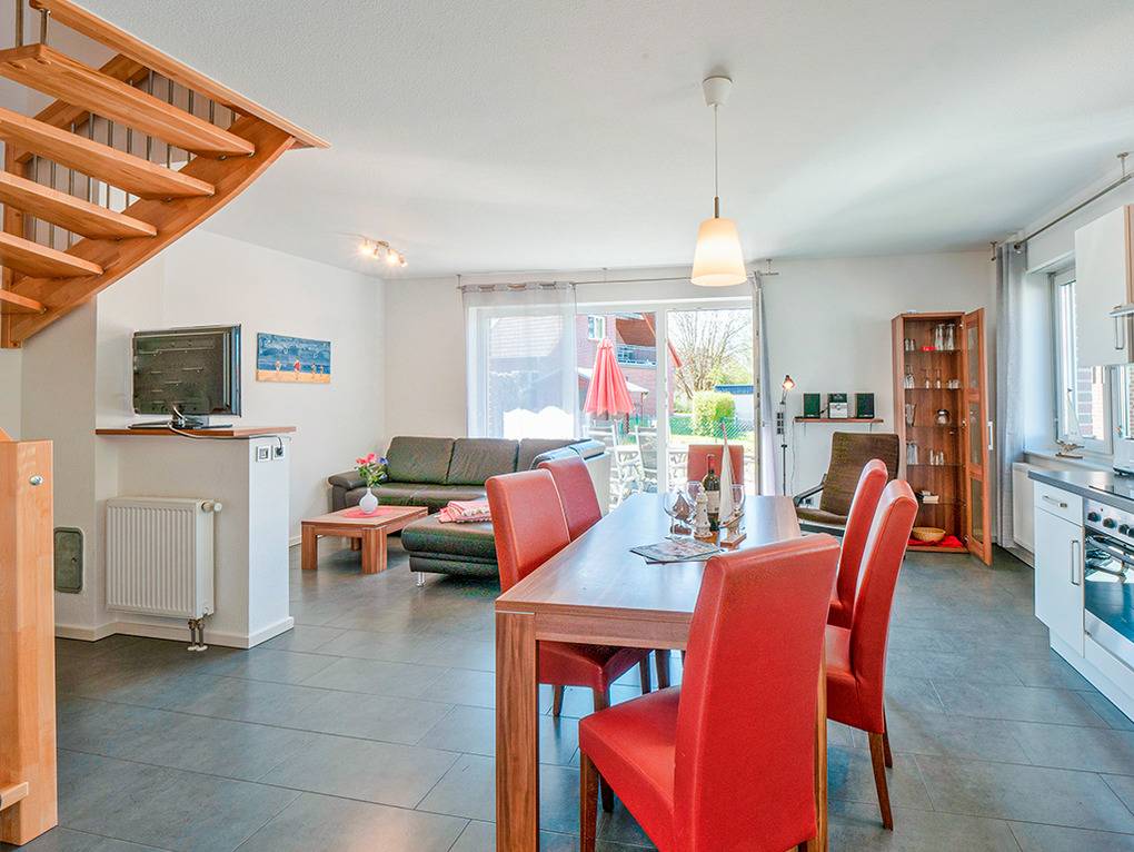 D 137.80 Ferienhaus 4-6 Pers.: 4-Zimmerhaushälfte mit 75 qm Wohnfläche über 2 Etagen. Parterre: Heller Wohn-/Essraum mit Sofasitzecke am Kaminofen, Sat-TV, Radio/CD, Esstisch, Einbauküche (Backofen, Mikrowelle, Spülmaschine). 2-Bettzimmer. Bad/WC. 1. Etage: Zwei Doppelzimmer. Bad/WC.